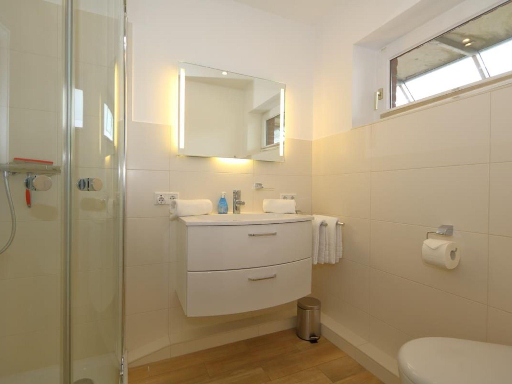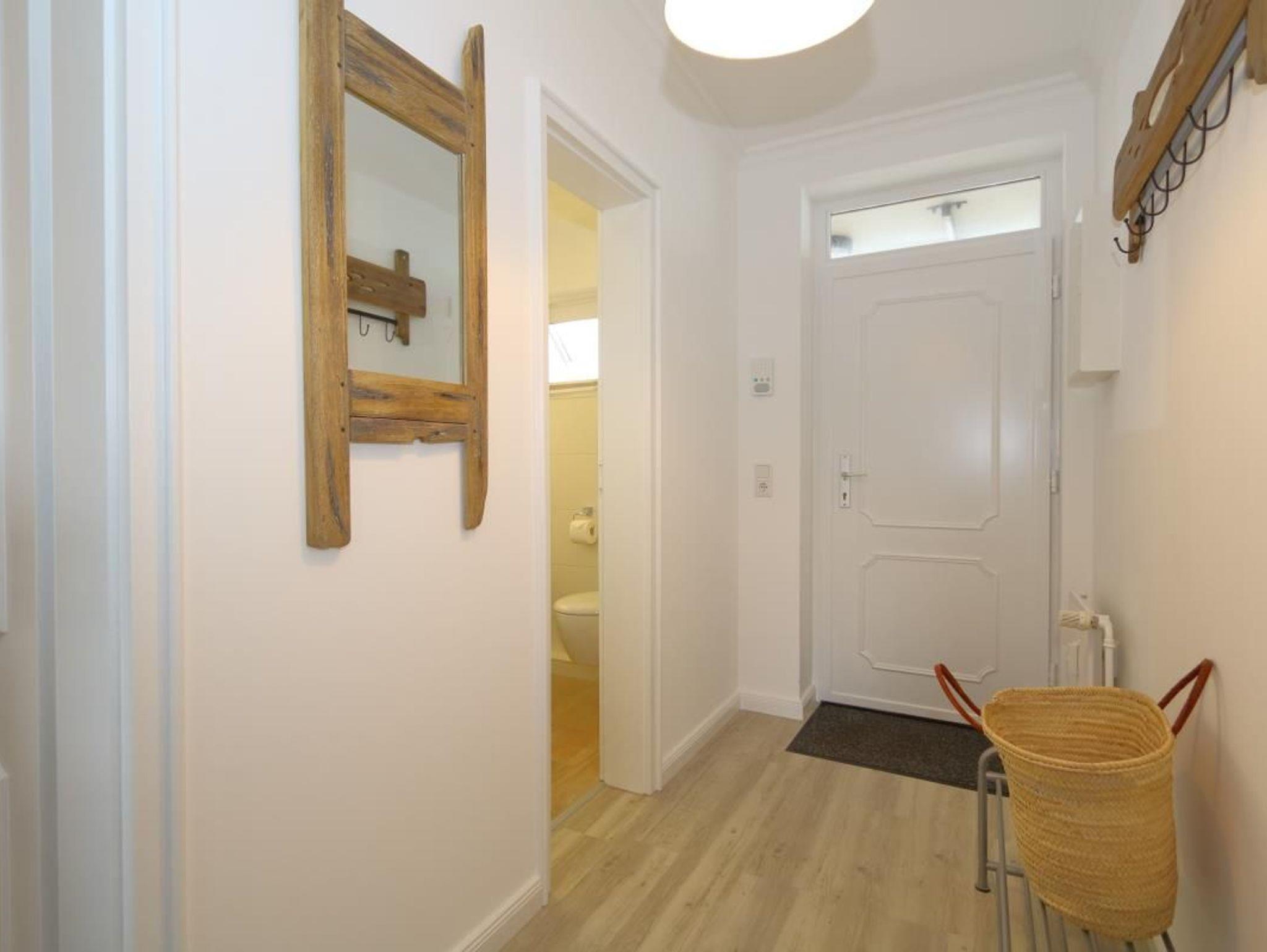 Duschbad/WC, Flurbereich mit Garderobe. Das Wohnzimmer ist mit Designboden ausgelegt.Tierhaltung ist nicht gestattet. Der Strandübergang ist ca 300 Meter entfernt, zur Strandstraße/Innenstadt ca 400 Meter.