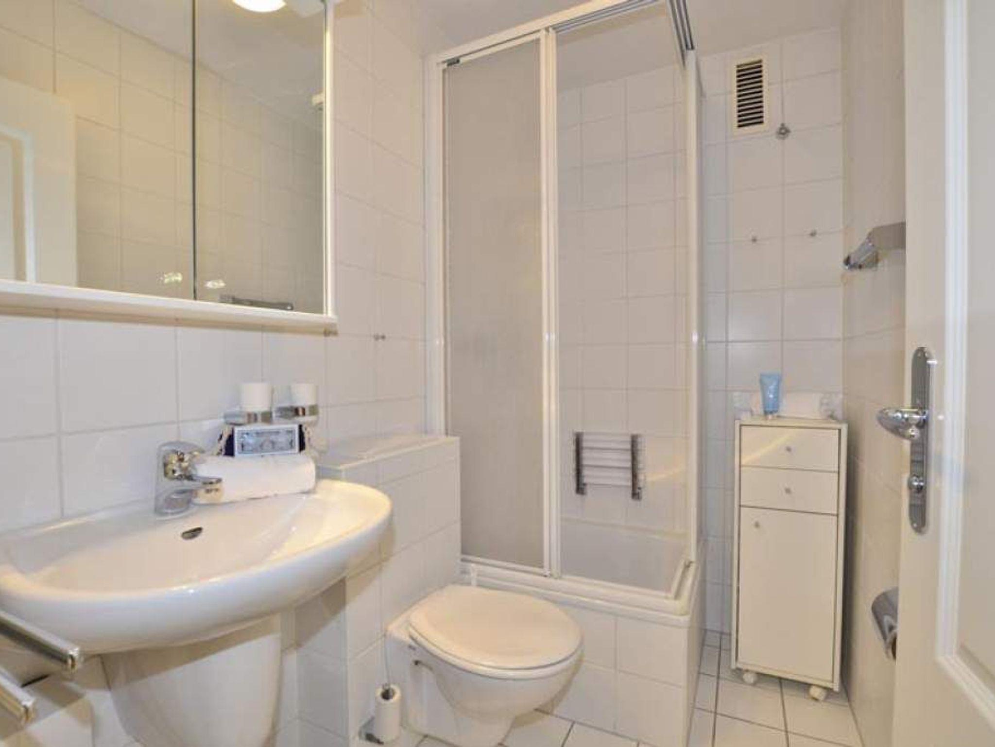 Im Bad befinden sich eine Dusche, ein WC und ein Waschtisch.