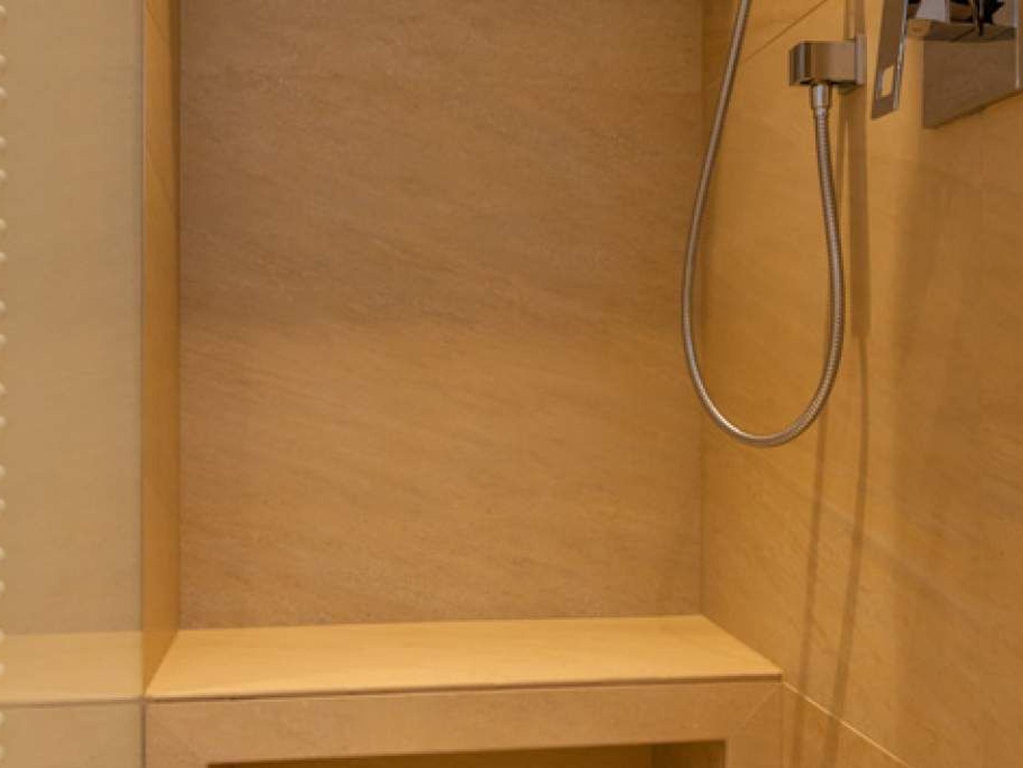 Das neue Bad lässt mit moderner Regendusche, Fön, Kosmetikspiegel, Waschtisch, Handtuchwärmer und WC keine Wünsche offen.