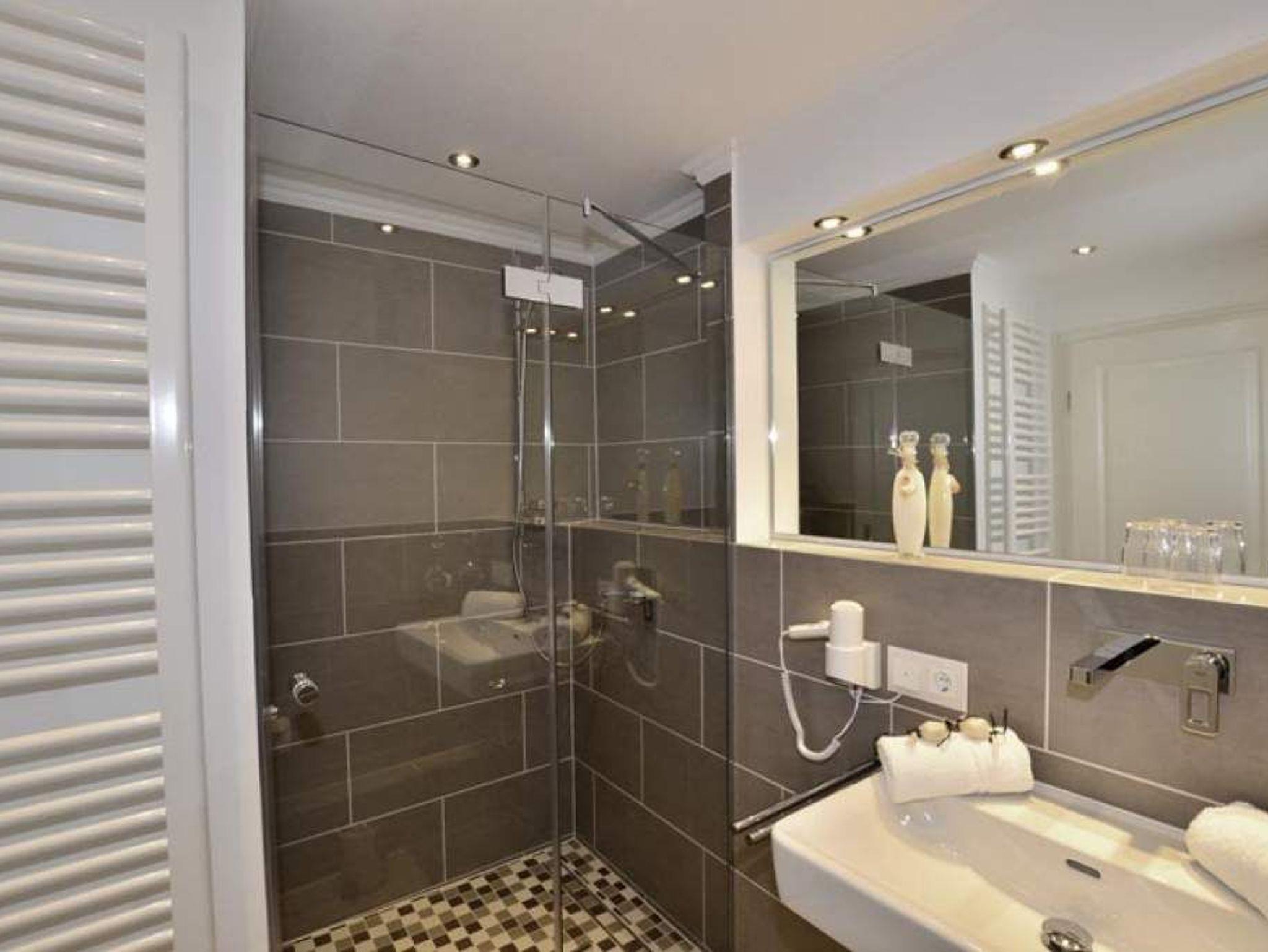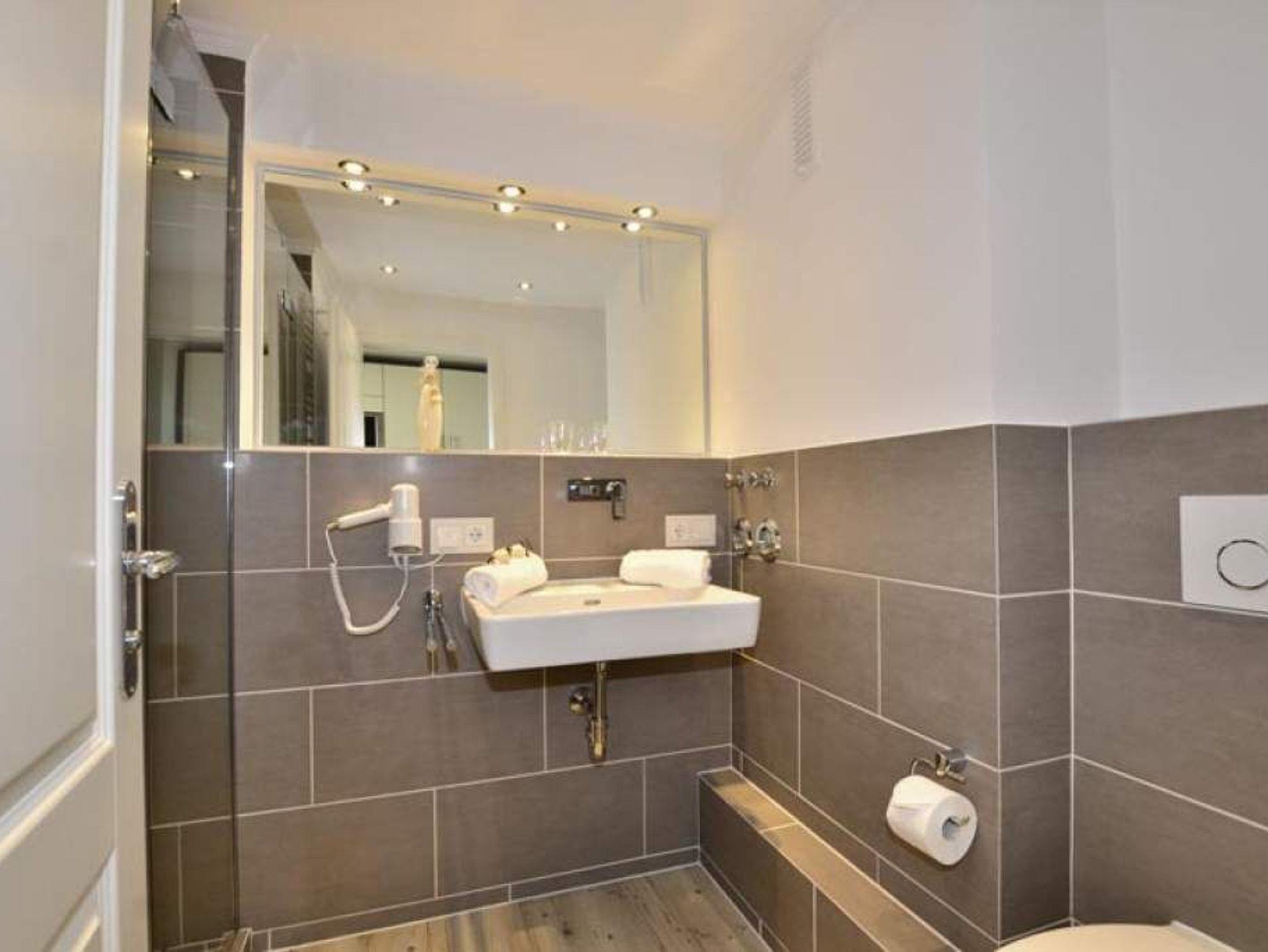 Das neue Duschbad/WC hat einen Waschtisch, einen Handtuchtrockner und einen Föhn.