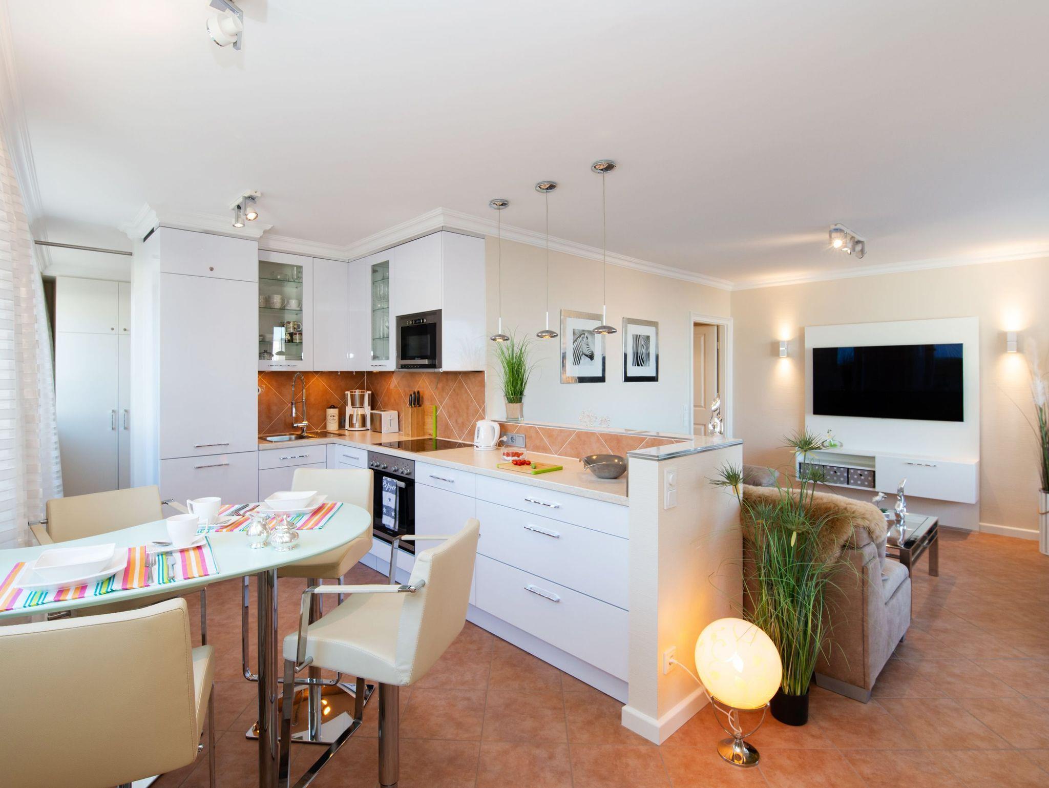 Im hellen Wohnzimmer befindet ein gemütliches Ecksofa, ein großer Kabel-Flachbild-TV, die offene XL-Einbauküche mit separatem Essplatz (Hochtisch mit stylischen Tresenstühlen) vor breiter Fensterfront und der Zutritt zur Nordostloggia.