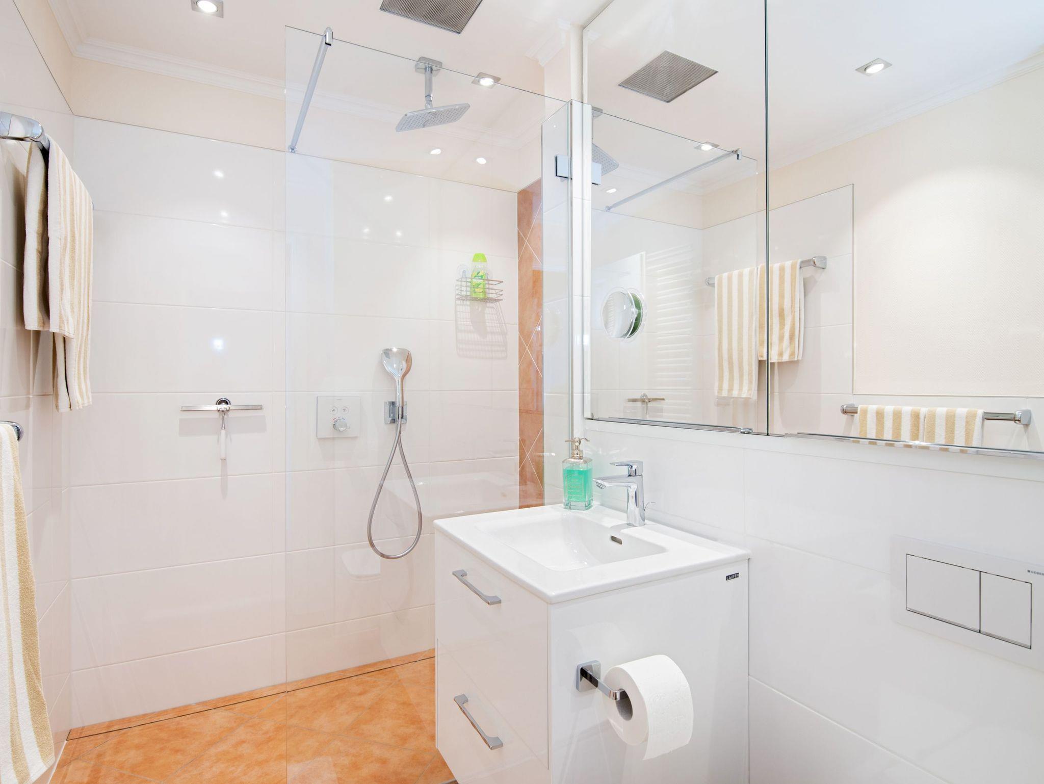 Im neuen Badezimmer mit Fußbodenerwärmung befindet sich eine großzügige Dusche mit extraflachem Einstieg, Handtuchtrockner, Waschtisch und WC.
