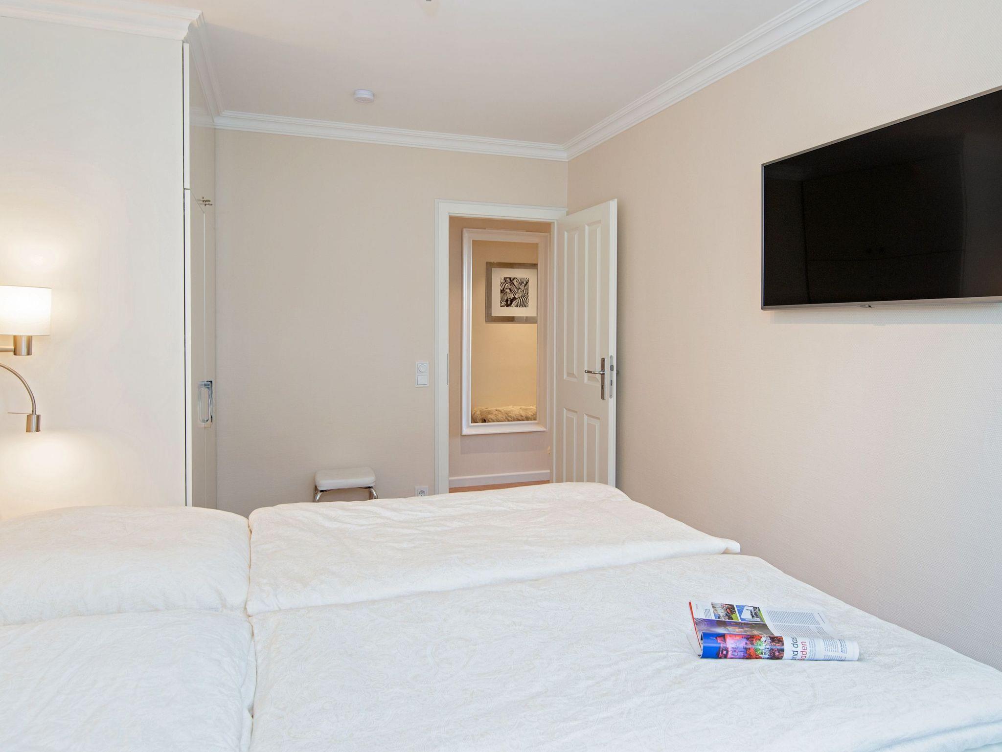 Das von der Küche und der Diele aus begehbare Schlafzimmer ist mit einem guten Doppelbett (2 Einzelmatratzen, jeweils 2 m x 0,90 m) und einem weiteren Kabel-Flachbild-TV (Wandmontage) ausgestattet.