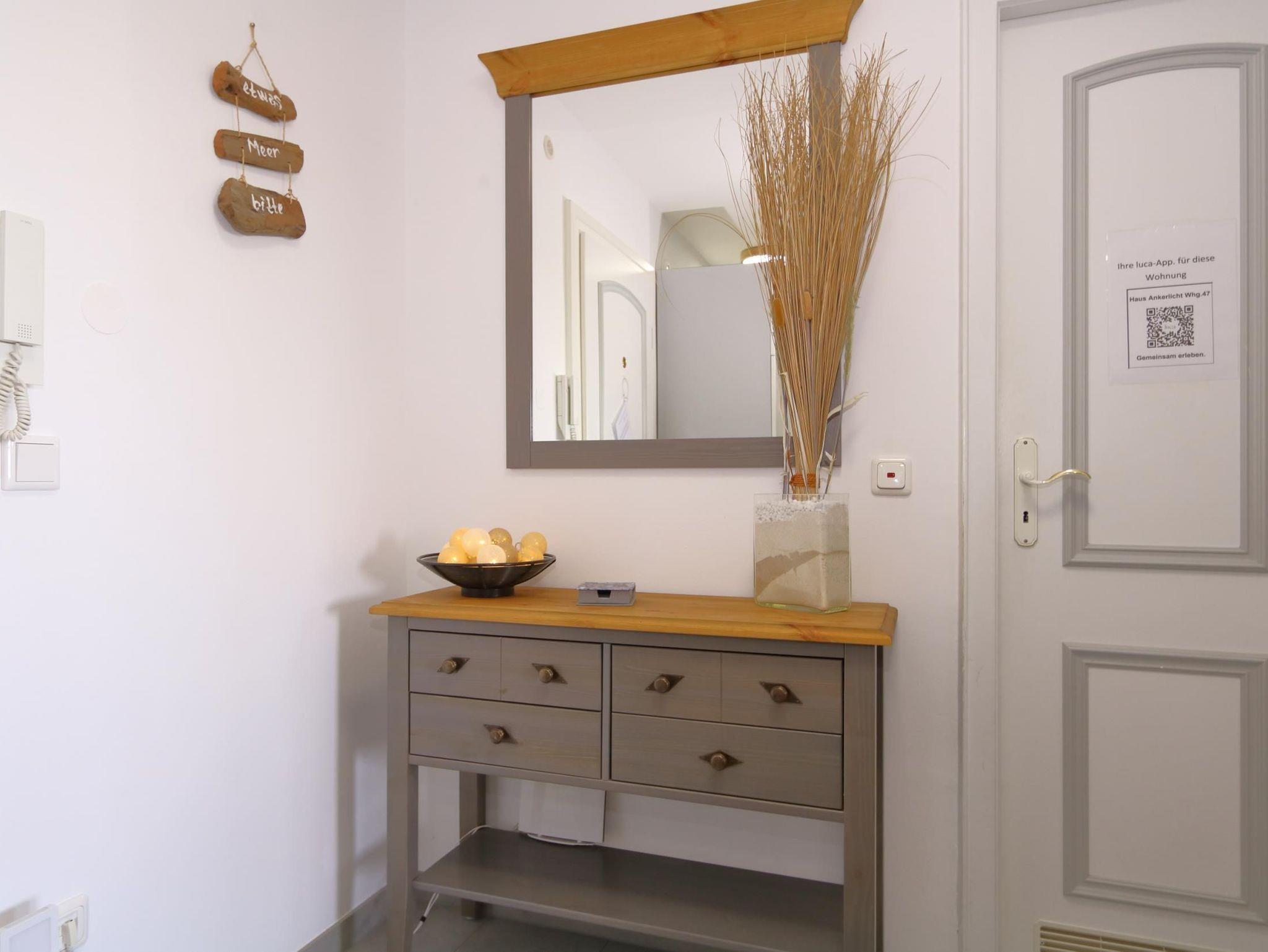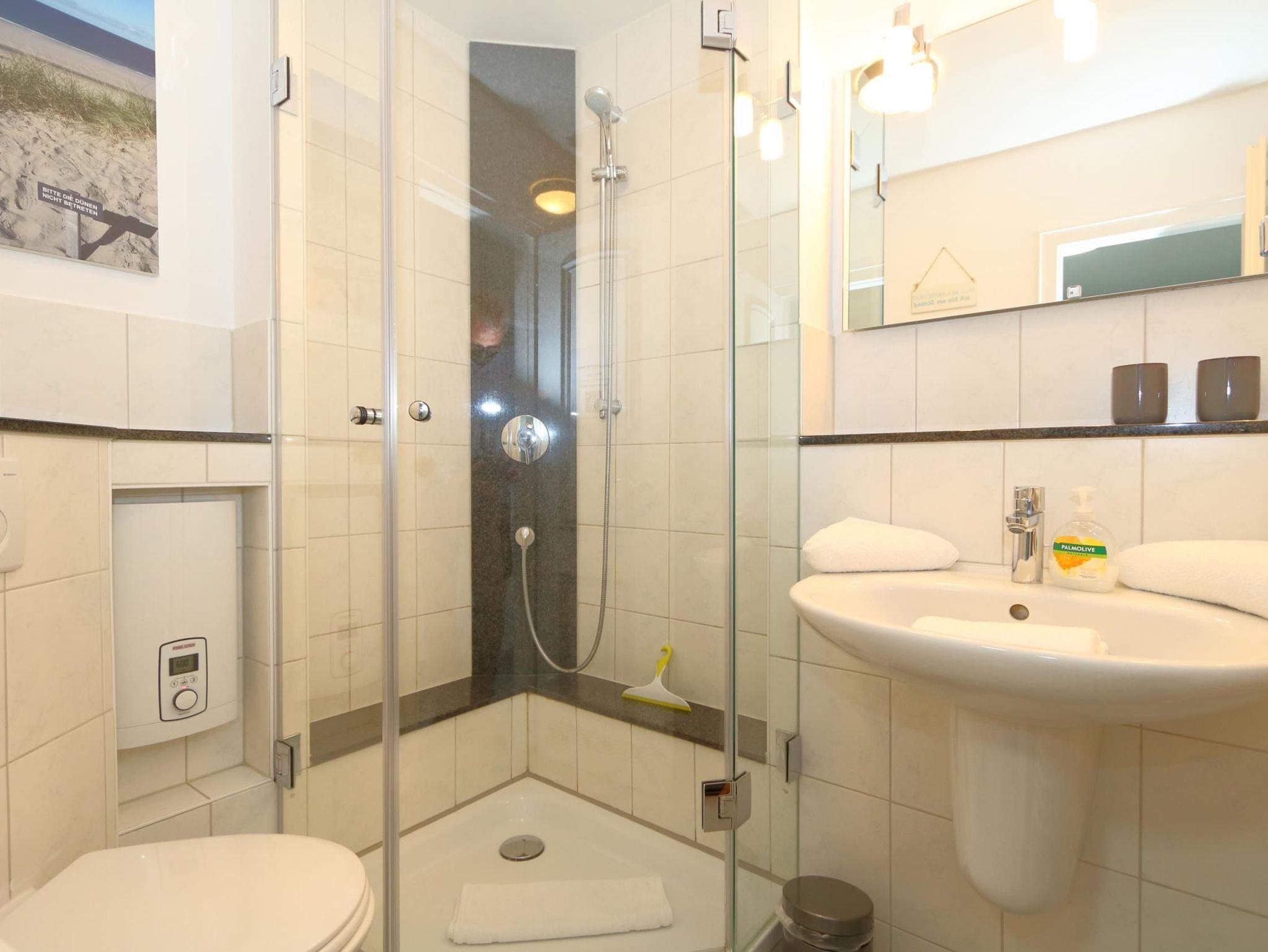 Das Bad spricht für sich selbst und besticht durch die großzügige Dusche mit einer Echtglaskabine. Weiterhin einem großen, beleuchtetem Spiegel, einem zusätzlichen, schwenkbarem Kosmetikspiegel mit Vergrößerung und einem Handtuchwärmer. Ein Echtholzregal für Handtücher und Kosmetik, sowie ein Fön runden diesem Raum ab.