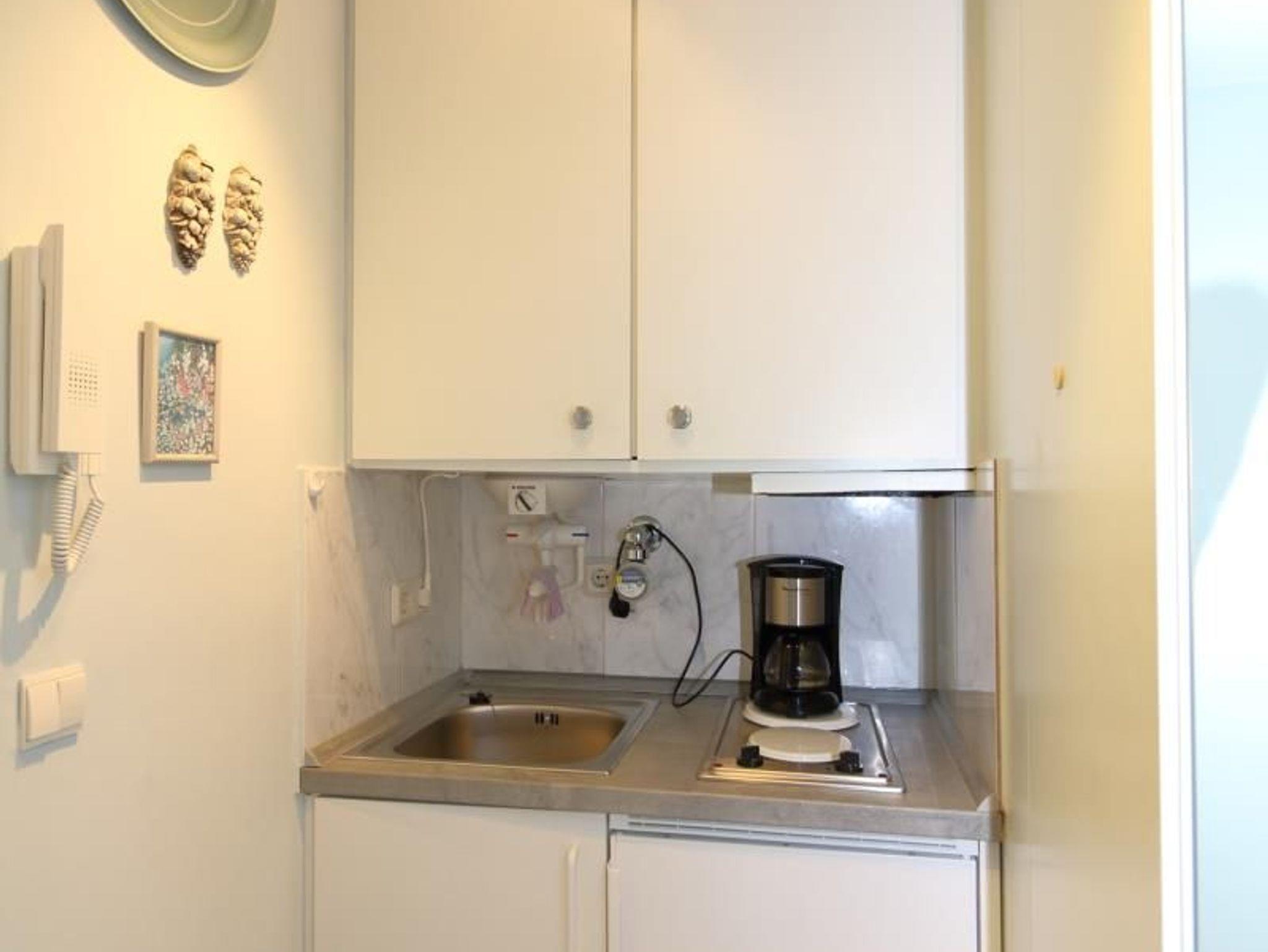 Das helle und praktisch eingerichtete Ferienappartement verfügt über ein Duschbad (Föhn vorhanden), eine kleine Pantry-Küche und über einen Schlaf-und Wohnbereich. Das Appartement hat große Fenster.
