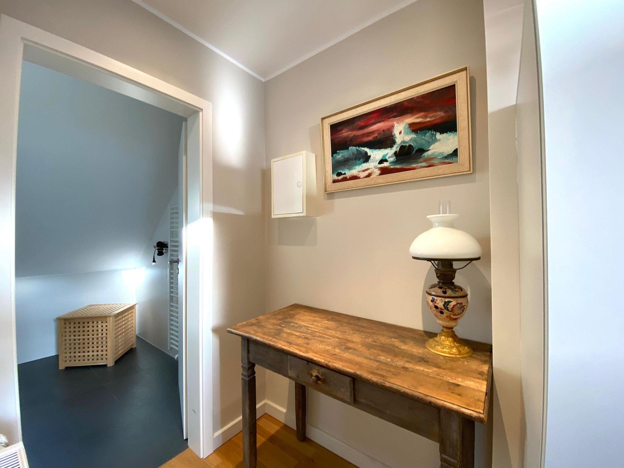 Das moderne Badezimmer ist mit einer Rainshower-Dusche, einem Handtuchwärmer, WC, Waschbecken und einem Haartrockner ausgestattet. Ein Außenfenster sorgt für frische Luft und natürliches Licht.