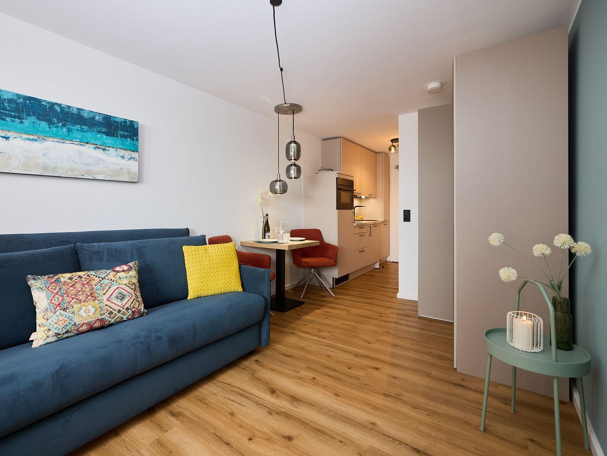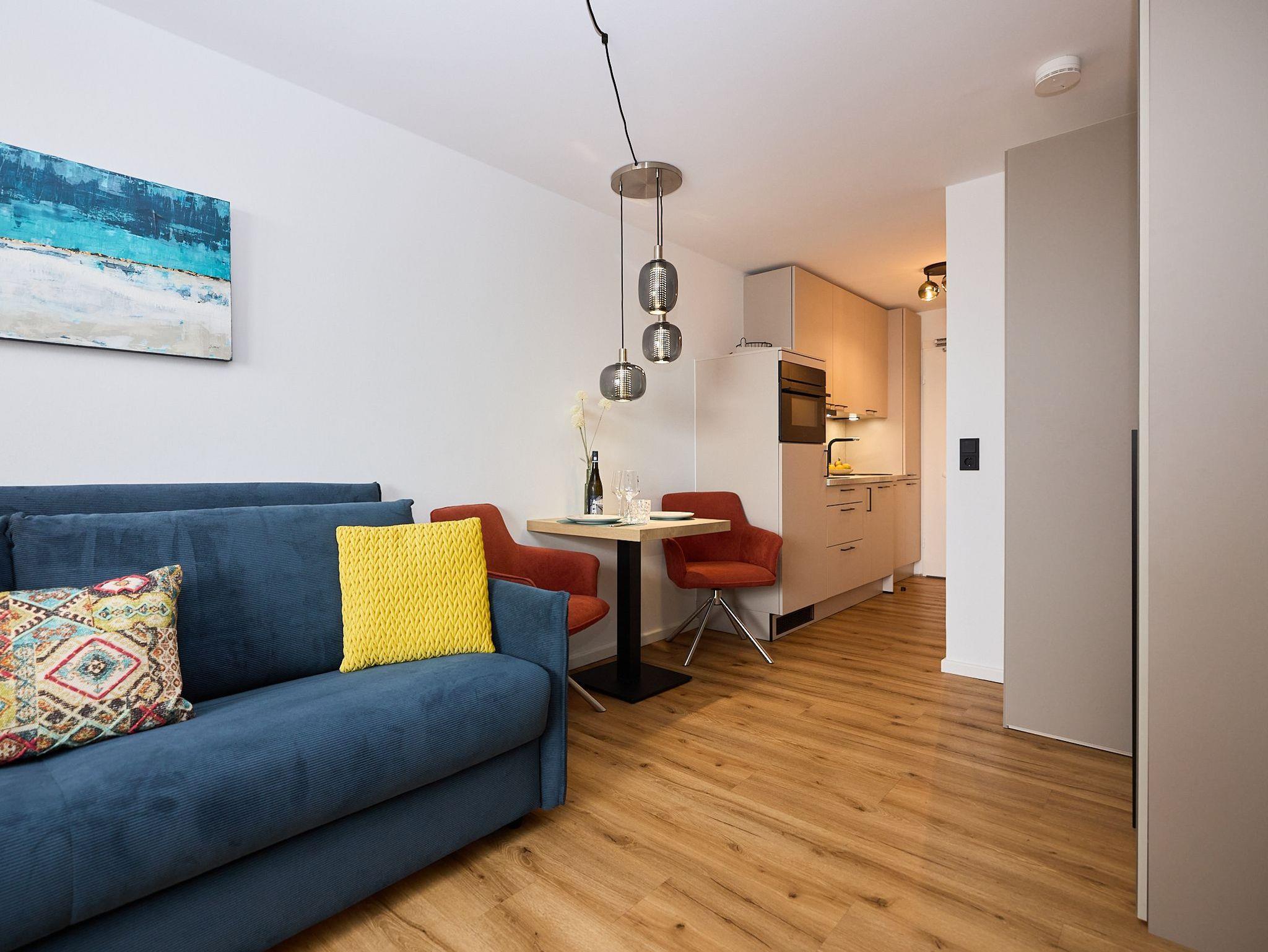 Die Wohnung ist frisch und stilvoll eingerichtet alles perfekt aufeinander abgestimmt. Sie bietet einen Eingangsbereich mit voll ausgestatteter Küche und einem kleinen Esstisch für zwei Personen. Das moderne Duschbad wurde ebenfalls vollständig erneuert. Im Wohnbereich lädt ein bequemes Sofa ein, das sich zu einem vollwertigen Bett umbauen lässt ideal für bis zu zwei Personen.