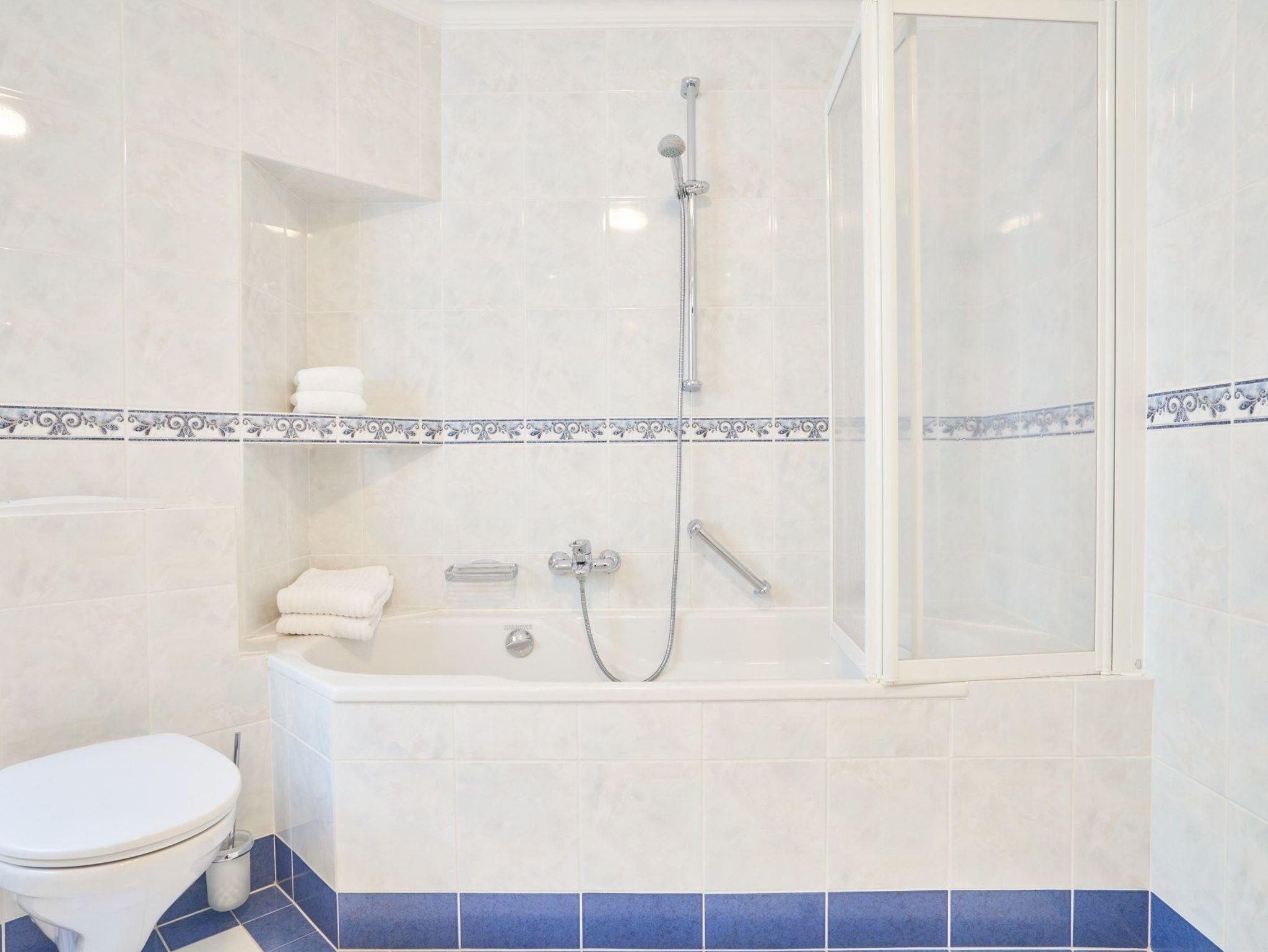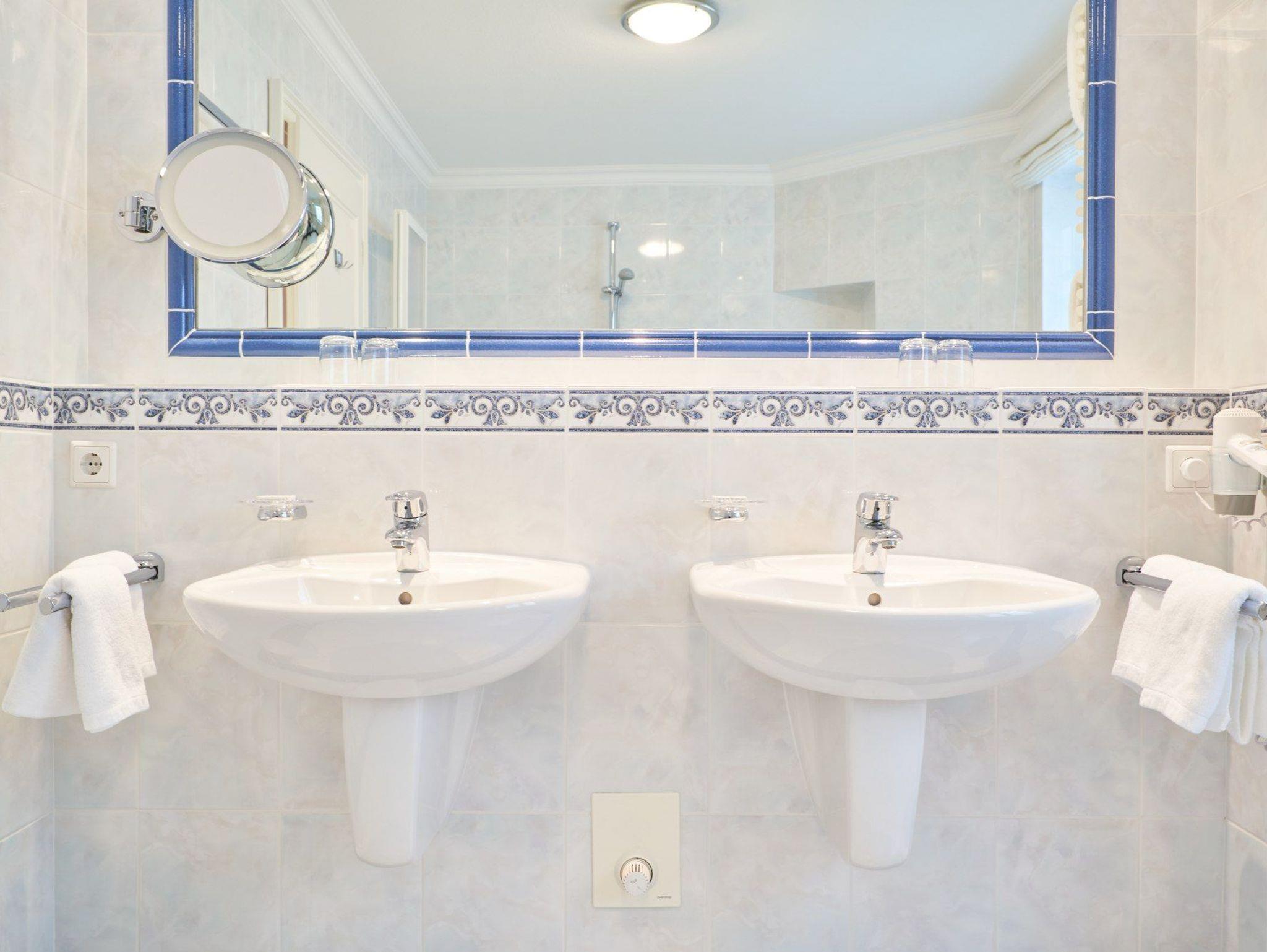 Zwei Badezimmer, einmal mit Wanne, Doppelwaschbecken und WC, und ein Duschbad mit WC.