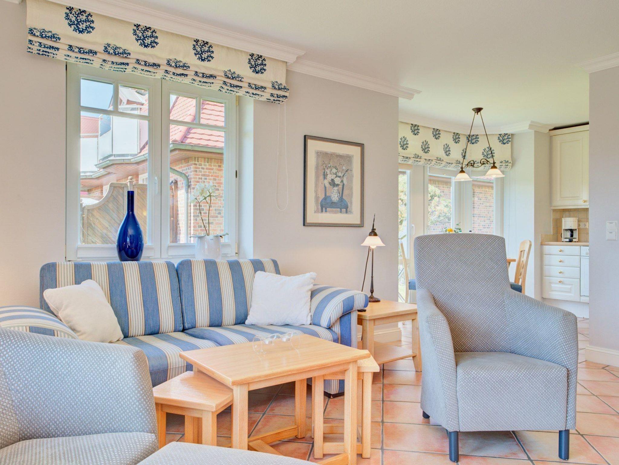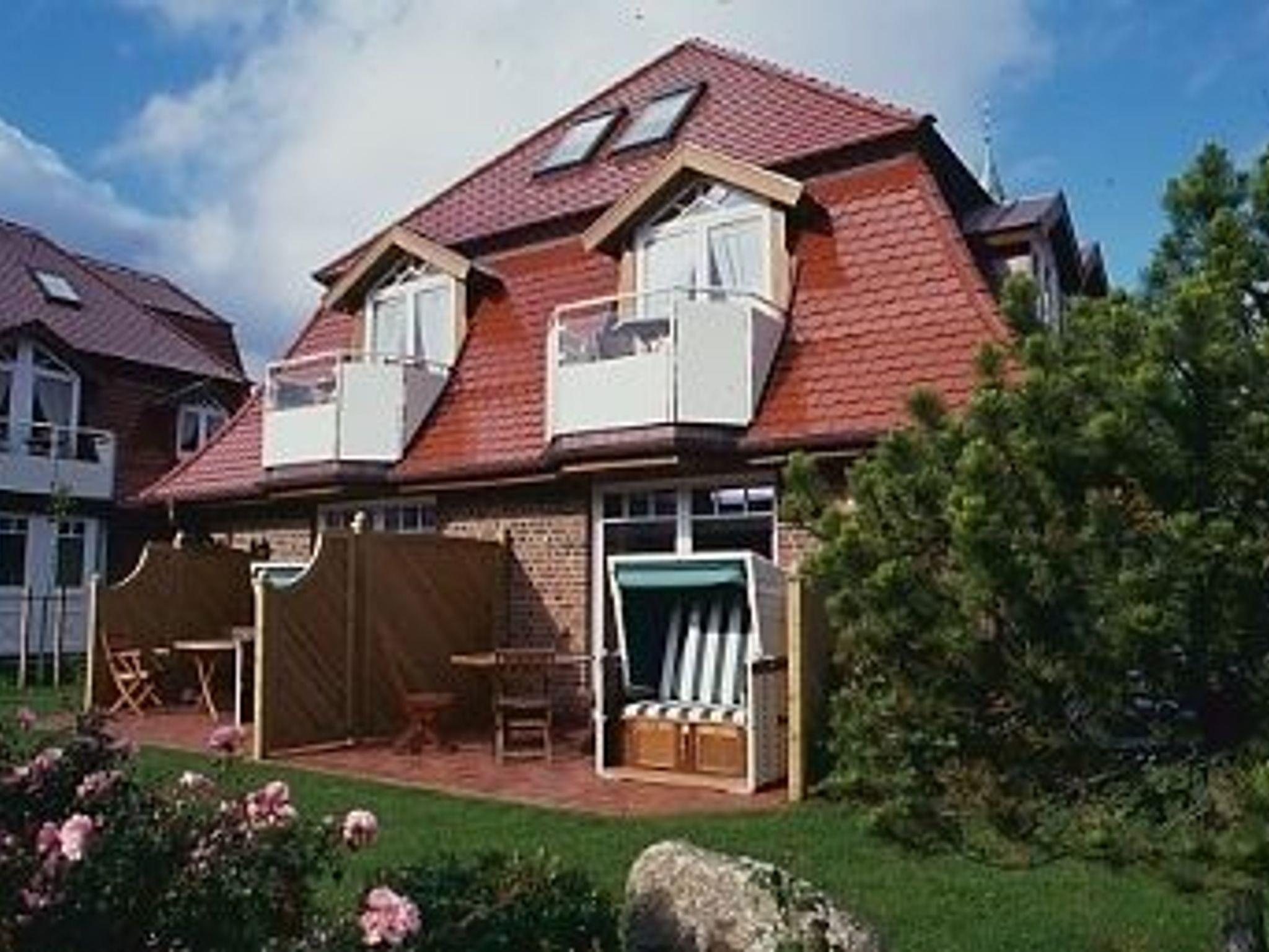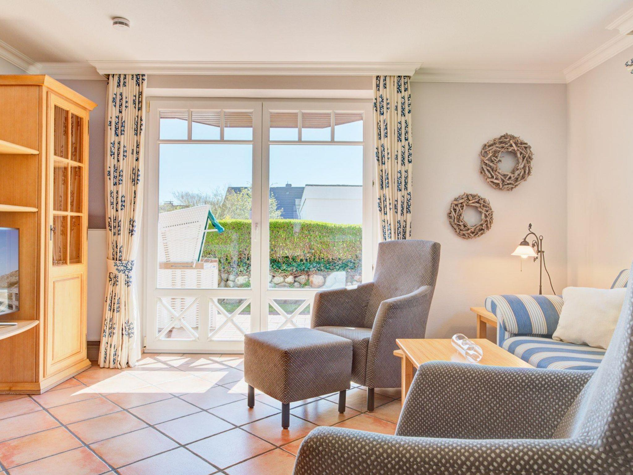Moderne Ferienwohnung Dünenrose in Westerland mit Wellnessbereich, Terrasse und Strandkorb, ideal für entspannte Tage auf Sylt.
