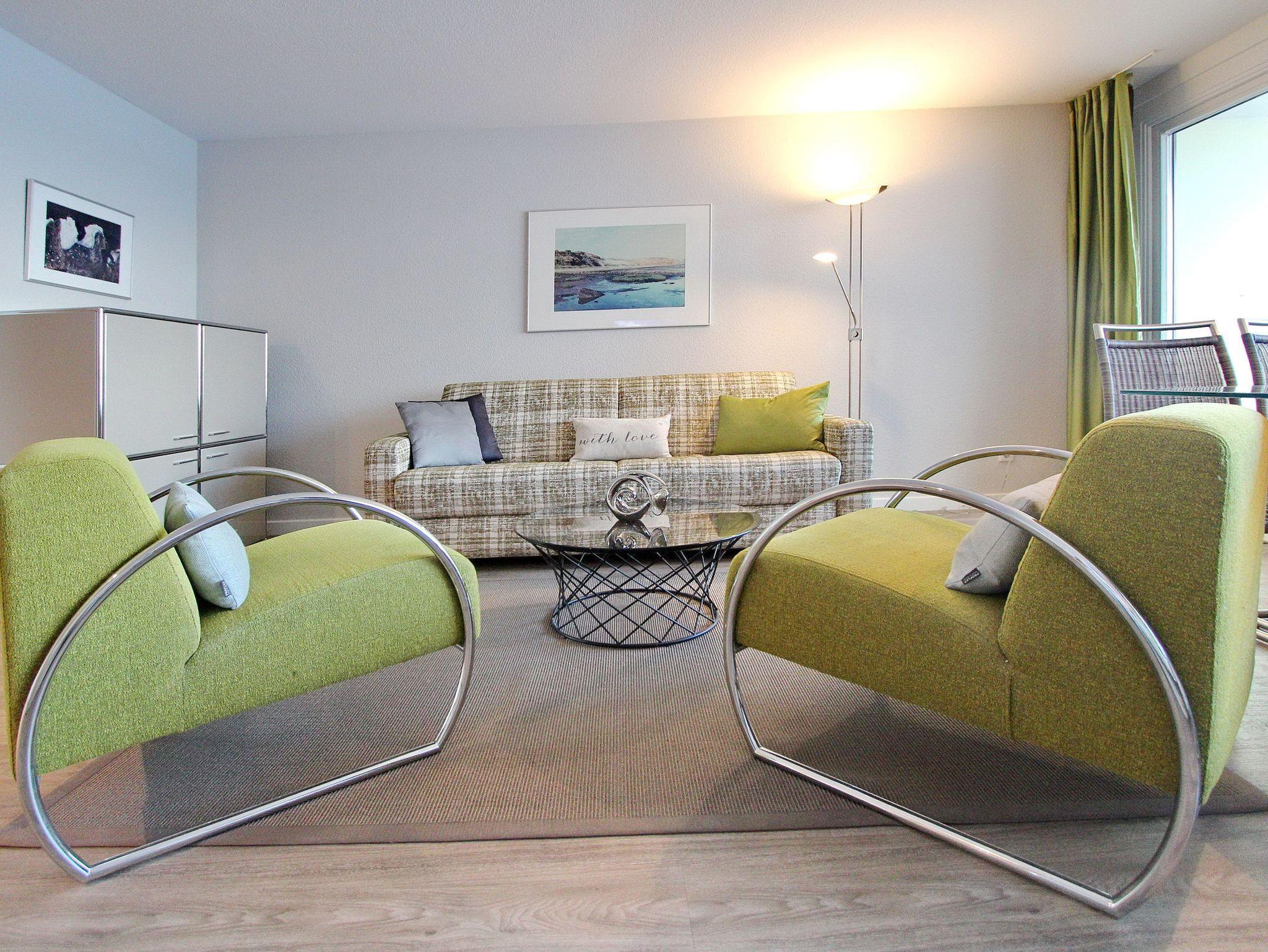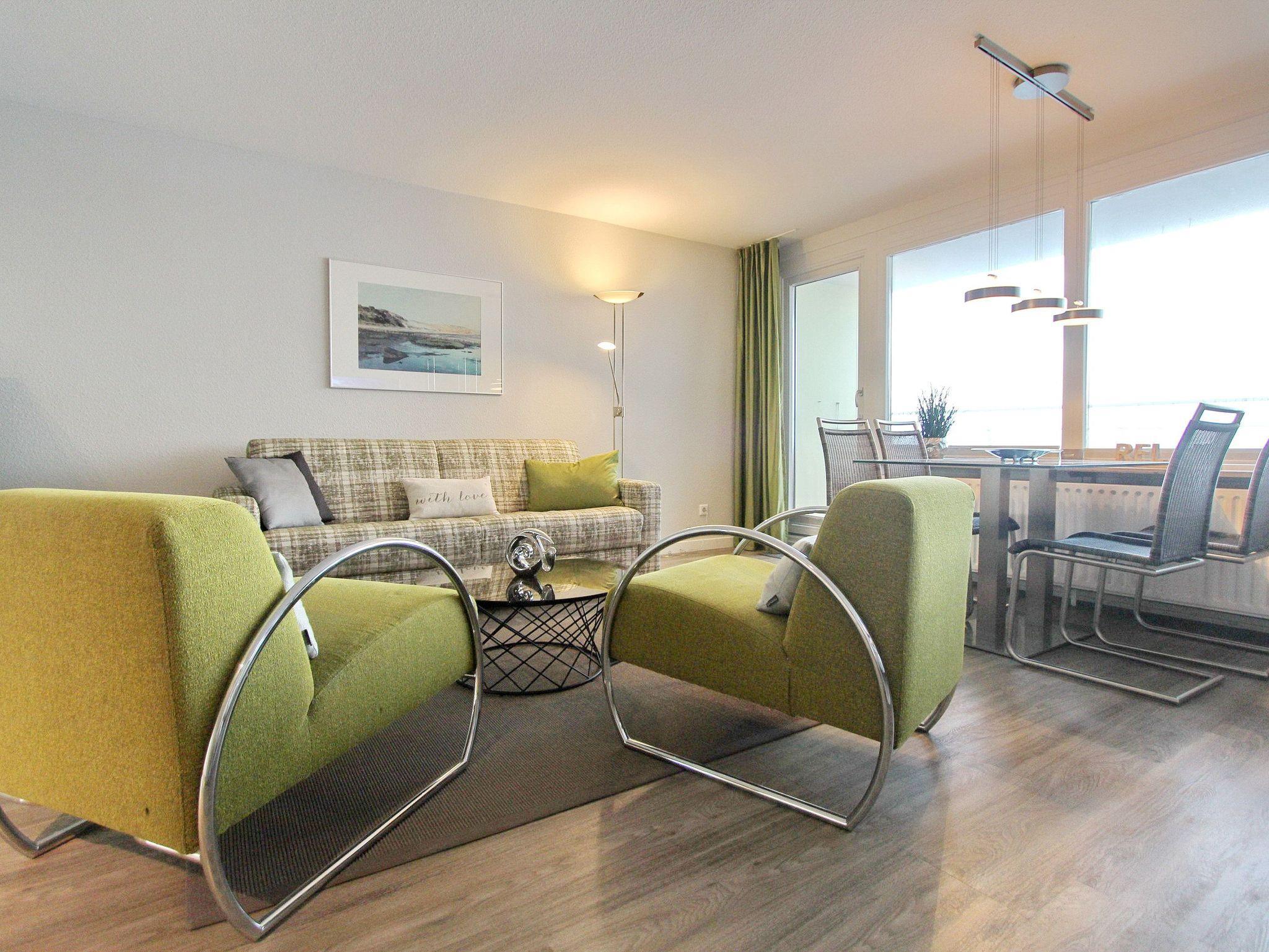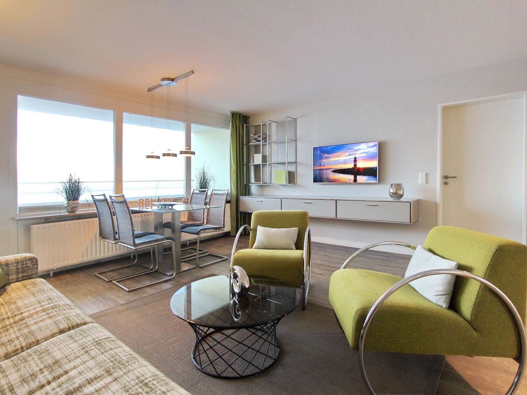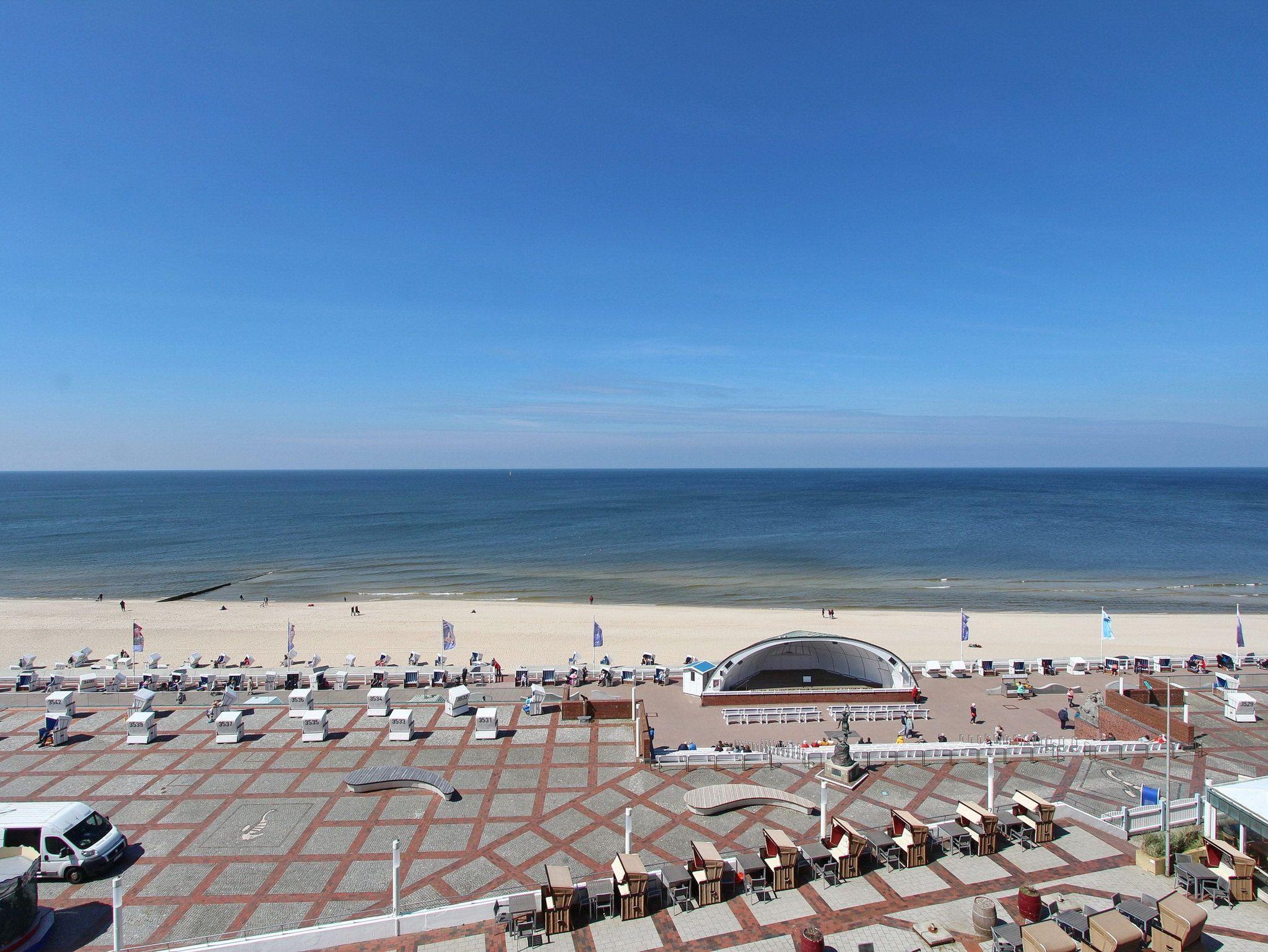 Hier steht einem erholsamen Urlaub nichts mehr im Weg. Die Zweizimmerwohnung in der 4. Etage im Haus Metropol hat einen herrlichen Blick über den Strand und die Nordsee. Das Wohnzimmer, mit vorgelagertem Westbalkon, ist in Grau/Grüntönen eingerichtet. Es gibt eine Sitzgruppe mit Sofa (Schlaffunktion) und 2 Sessel, einen Essplatz am Fenster mit 4 Stühle und Schränke mit viel Stauraum für ihre persönlichen Dinge. Designfußboden in Holzoptik verleiht dem Raum Gemütlichkeit und ist besonders angenehm für das Raumklima. Im Schlafzimmer gibt es einen kleinen Balkon zur Westseite, ein feststehendes Doppelbett mit 2 Matratzen, einen Kleiderschrank und einen zusätzlichen Flachbildfernseher. Das Badezimmer verfügt über eine Dusche, Fön, Kosmetikspiegel, Handtuchtrockner und ein Bidet. Um sich selbst zu verpflegen gibt es eine Küche mit Geschirrspüler, Backofen, Cerankochfeld mit 2 Herdplatten und zusätzlicher Nespressomaschine. Zur technischen Ausstattung gehört ein: Flachbildfernseher, ein Telefon mit Flatrate ins dt. Festnetz und ein Radio mit CD Player. Ein freies WLAN Netzwerk (WEG Haus Metropol - Passwortfrei - ohne Gewähr) steht ihnen kostenfrei zur Verfügung und den WLAN Anschluss des Eigentümers können Sie auch nutzen. Die Zugangsdaten befinden sich auf dem Router. Diese Nichtraucherwohnung hat eine Größe von ca. 67 m².