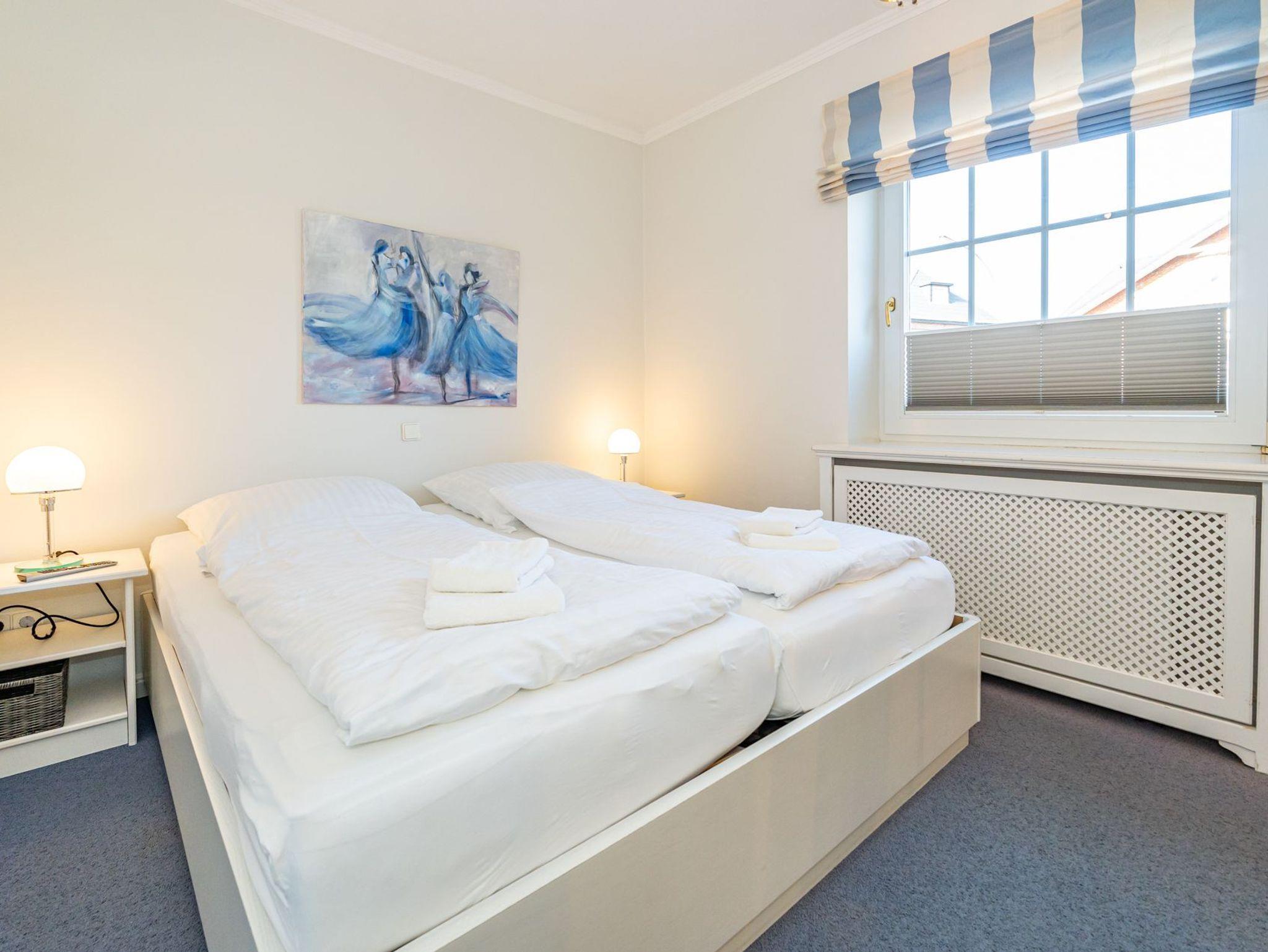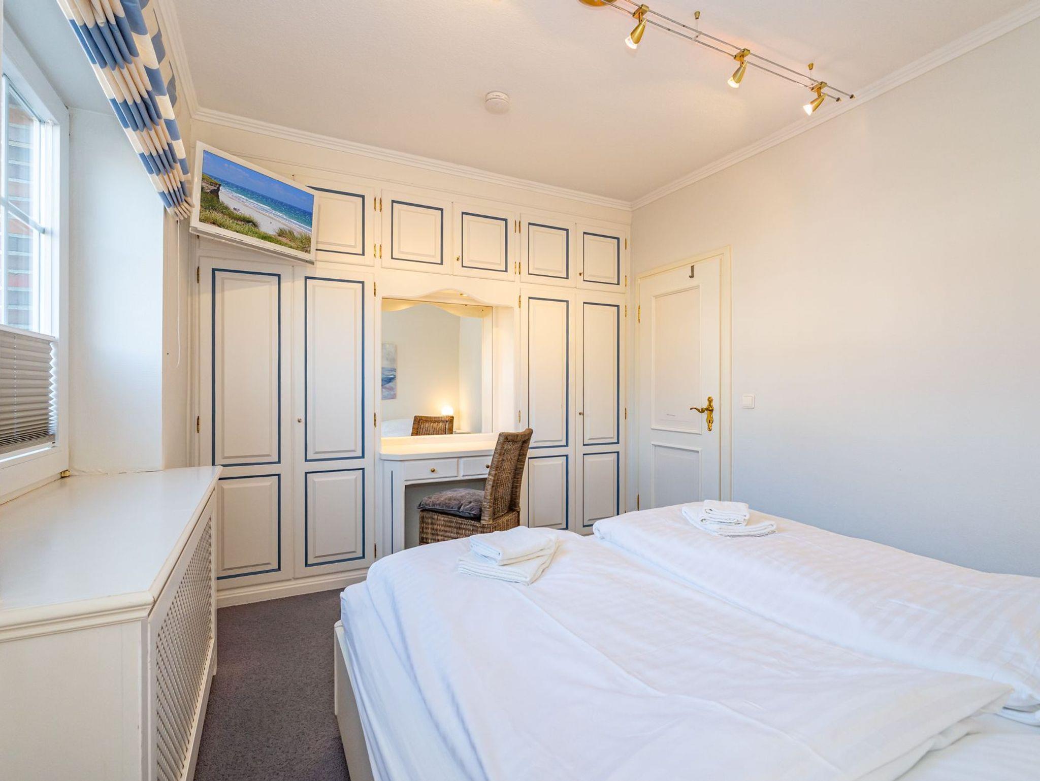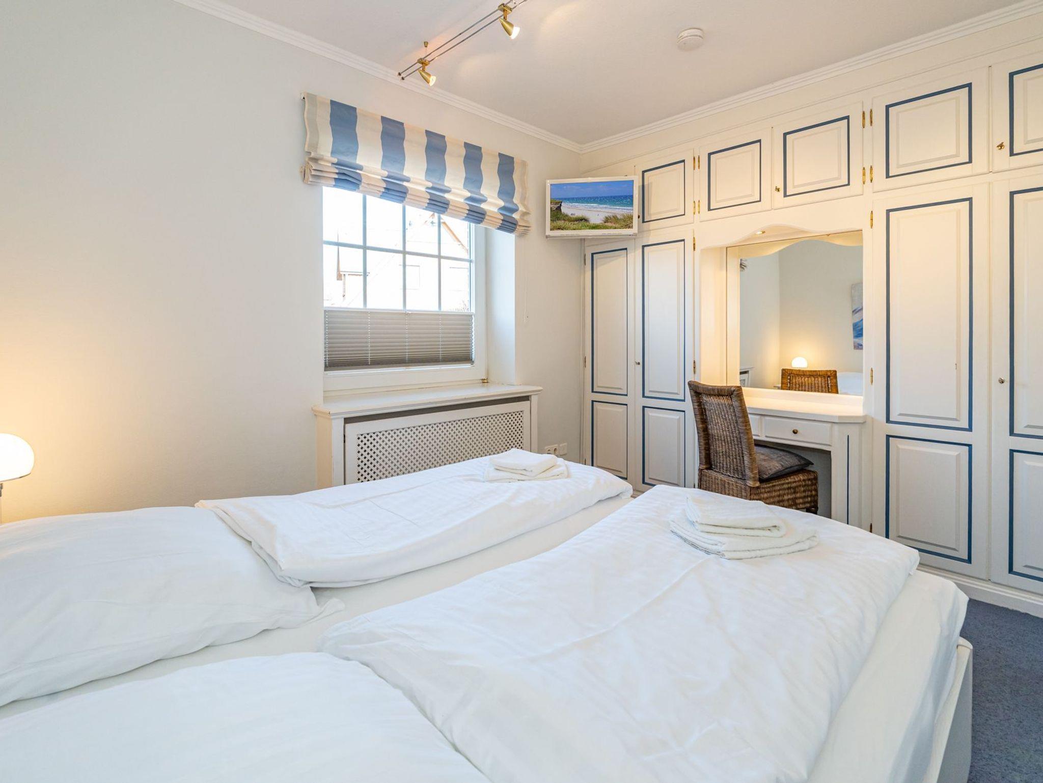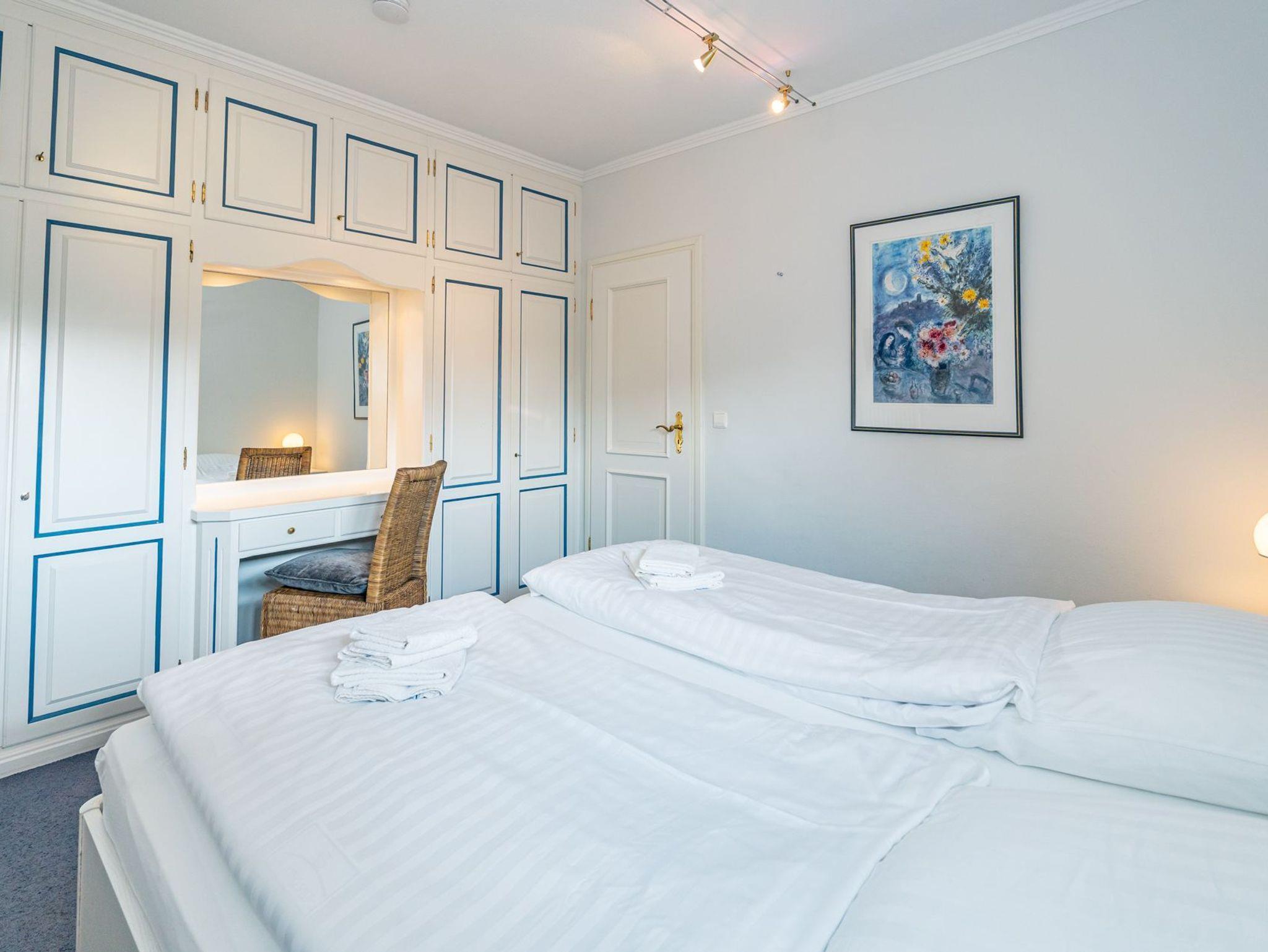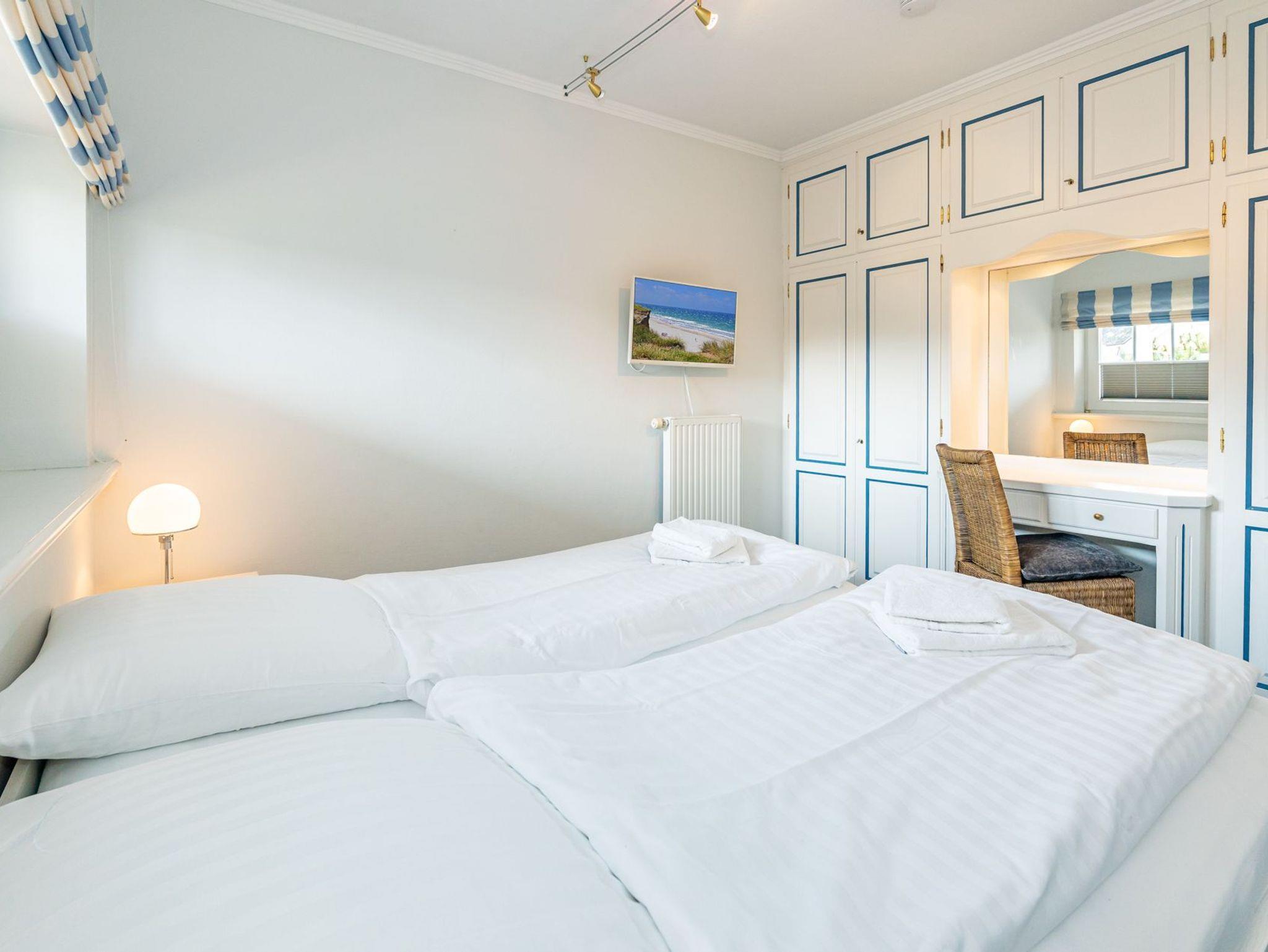 Vom Wohnzimmer gelangt man außerdem in die beiden Schlafzimmer, die jeweils mit guten Doppelbetten (Maß 1,80 x 2 Meter, jeweils mit zwei Einzelmatratzen), Einbauschränken und Kosmetiktischen ausgestattet sind.