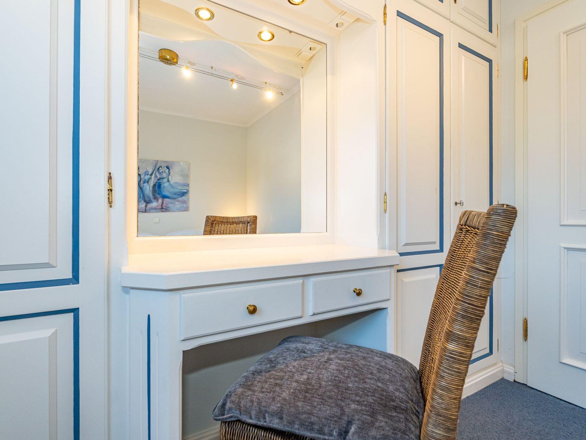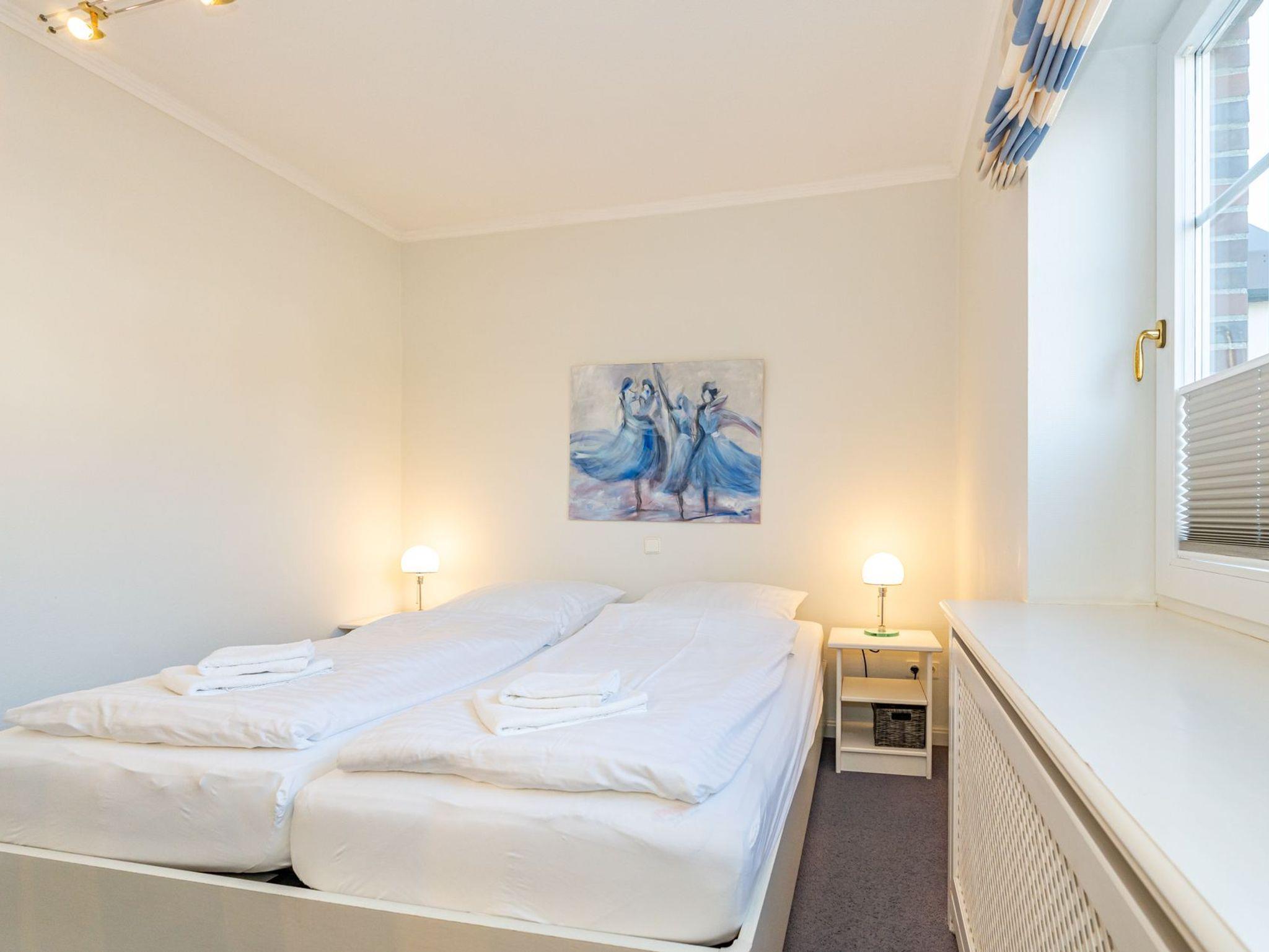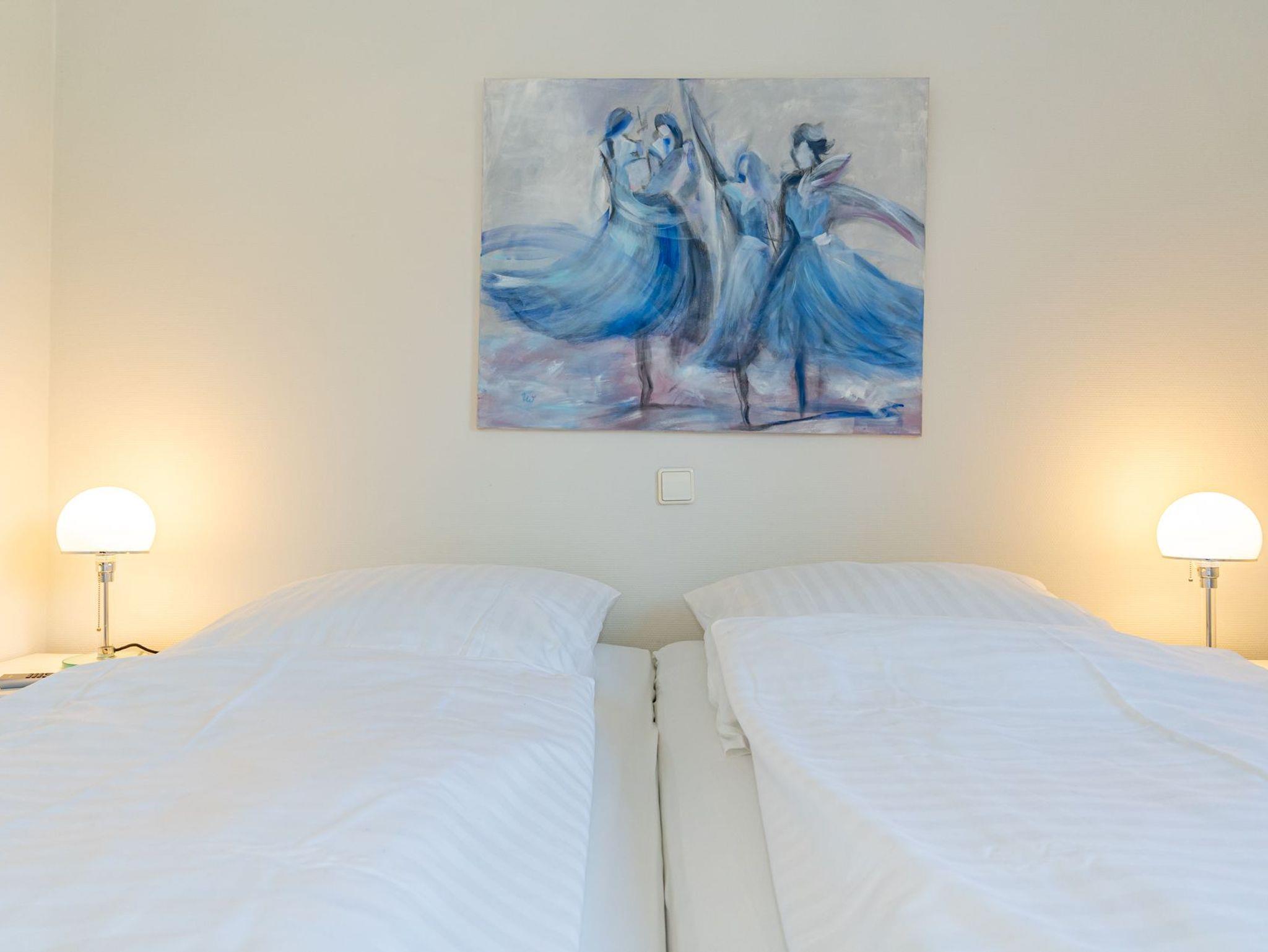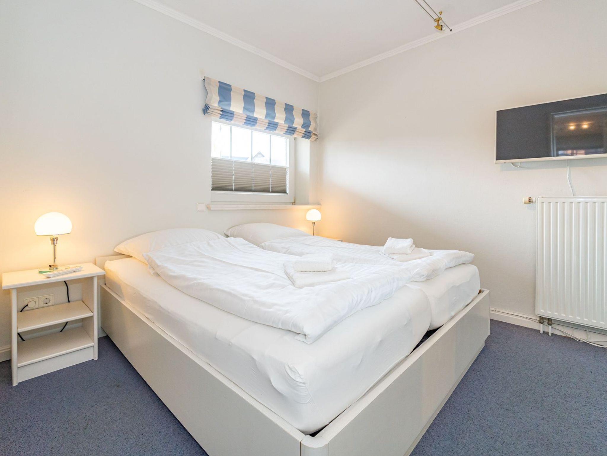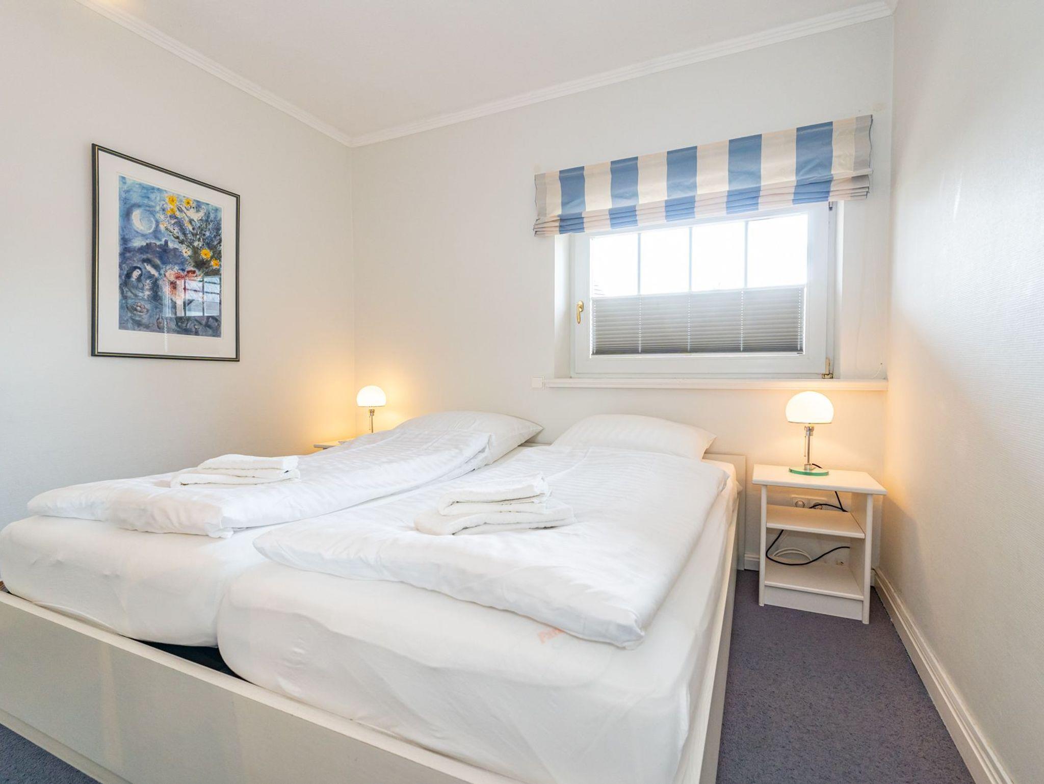 Vom Wohnzimmer gelangt man außerdem in die beiden Schlafzimmer, die jeweils mit guten Doppelbetten (Maß 1,80 x 2 Meter, jeweils mit zwei Einzelmatratzen), Einbauschränken und Kosmetiktischen ausgestattet sind.