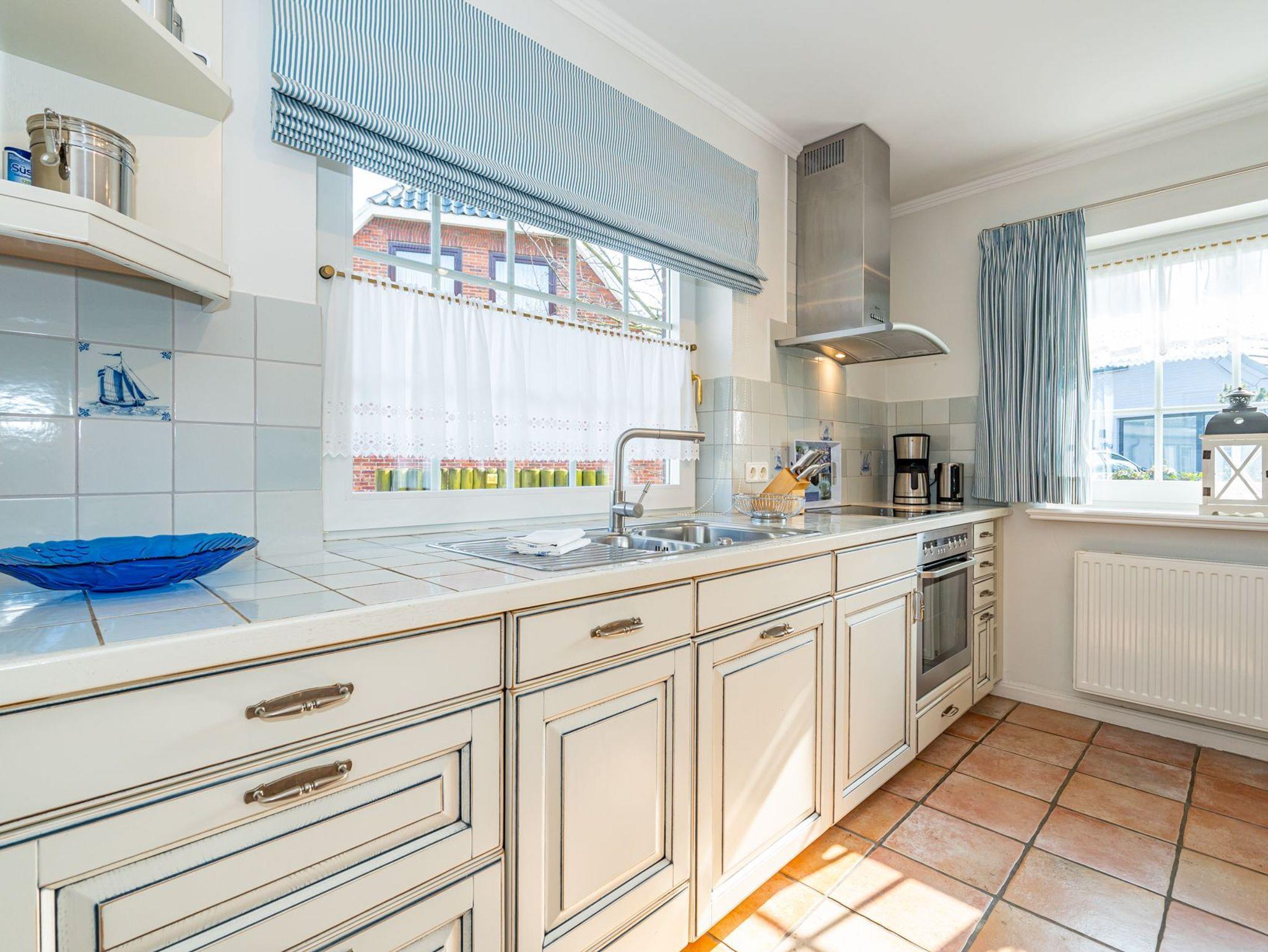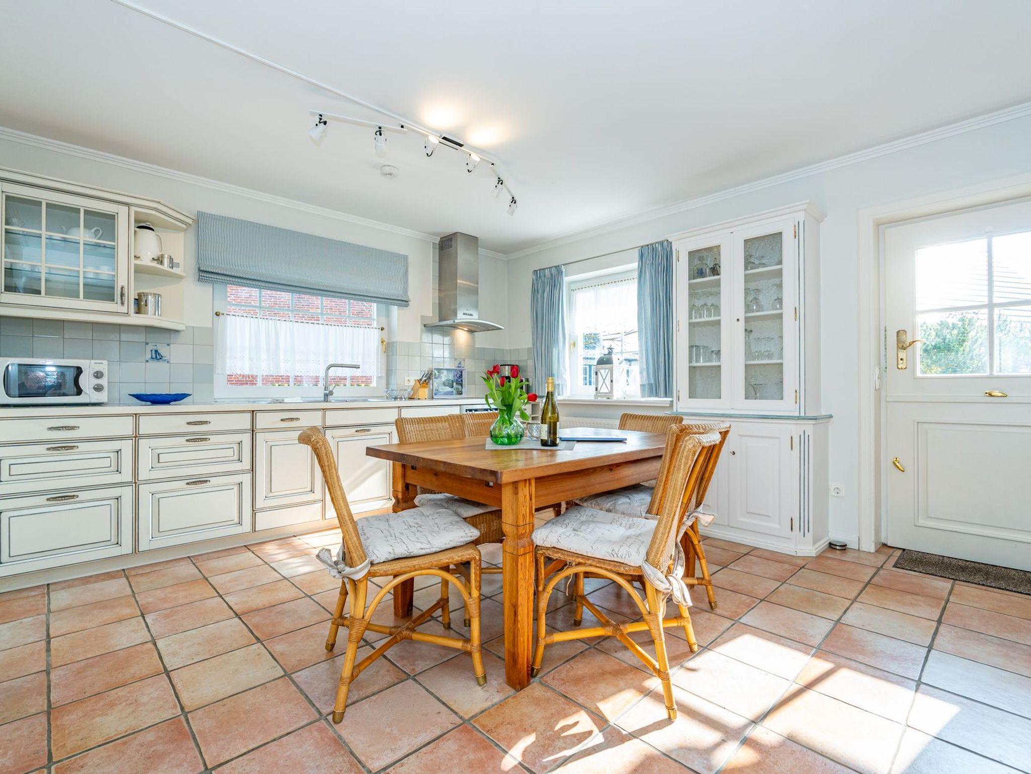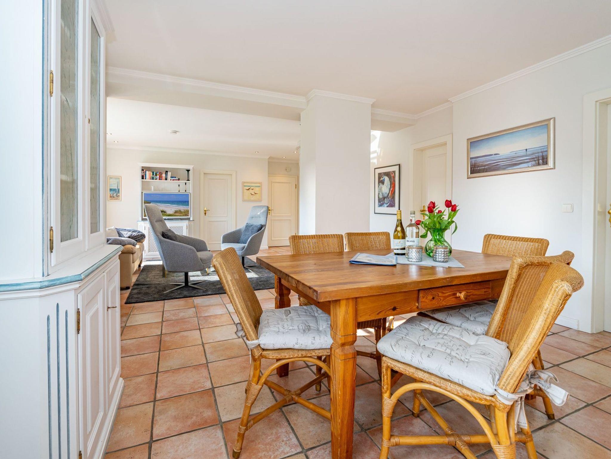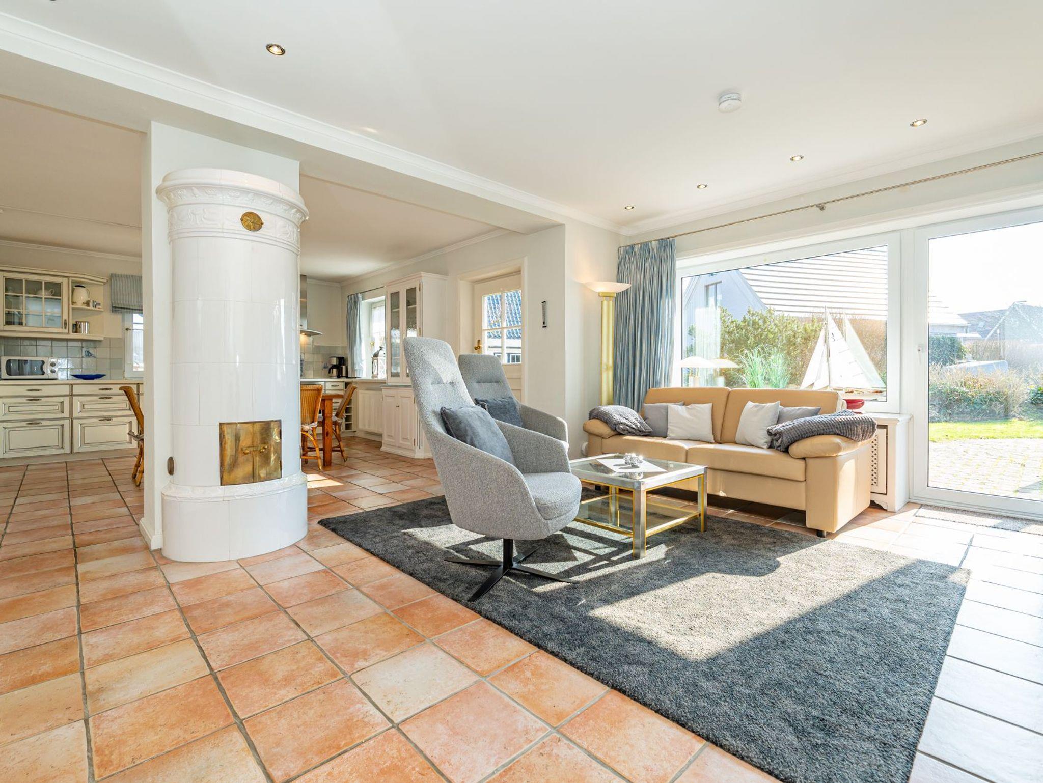 Das großzügige Wohn- und Esszimmer mit Fliesenboden in warmen Terracotta-Tönen ist komplett nach Süden ausgerichtet. Über die typisch friesische Klön-Tür (zweiteilig) oder eine weitere Terrassentür gelangt man auf die windgeschützte Südterrasse, in den Garten und zur separaten Sonnenterrasse.