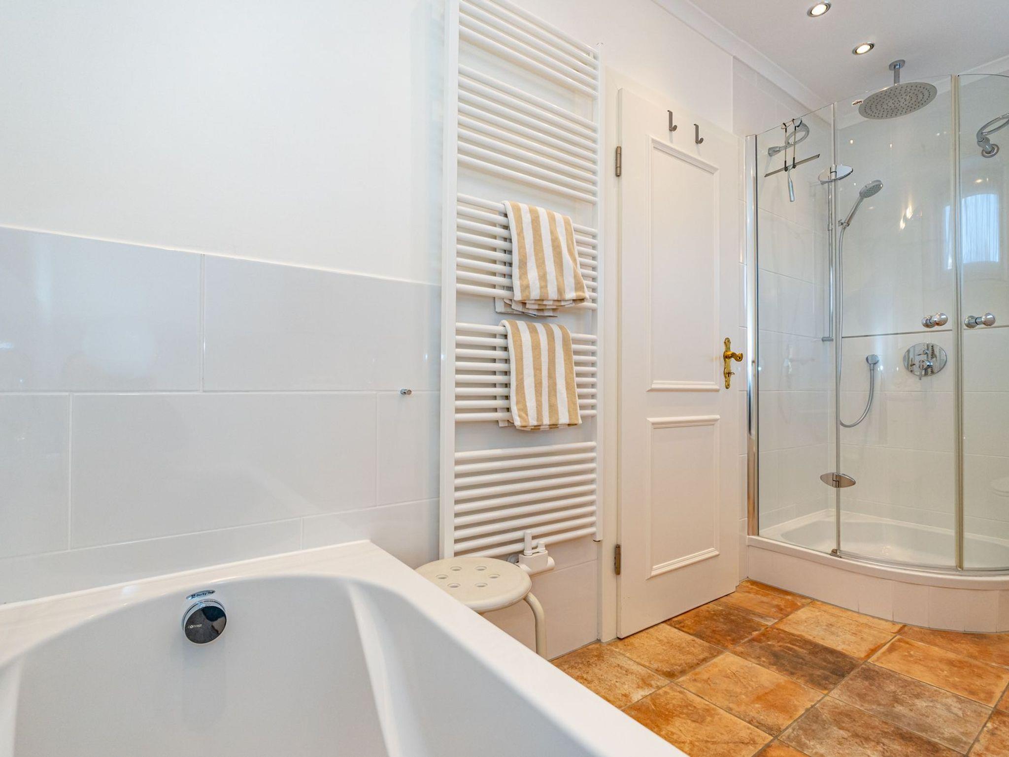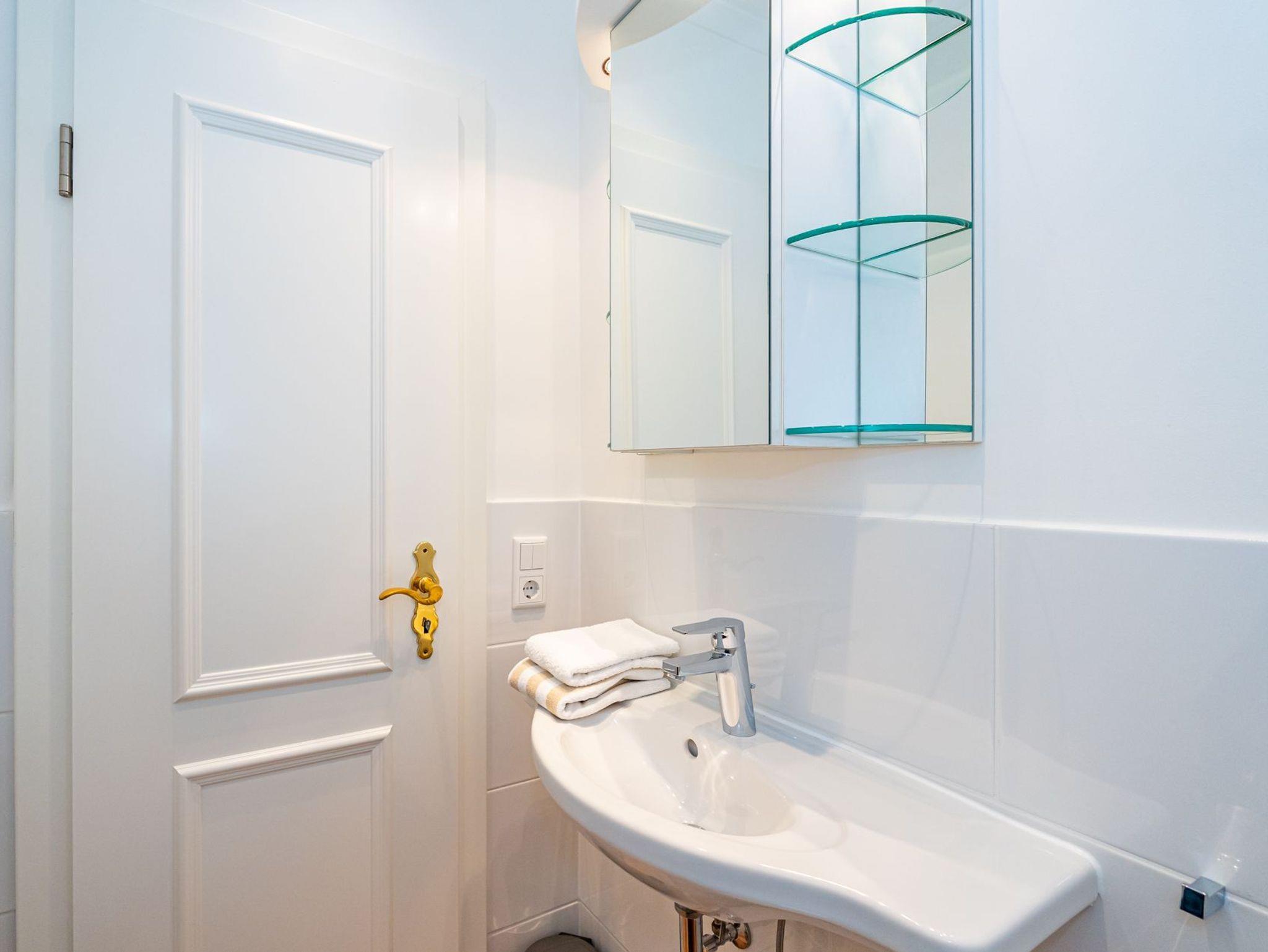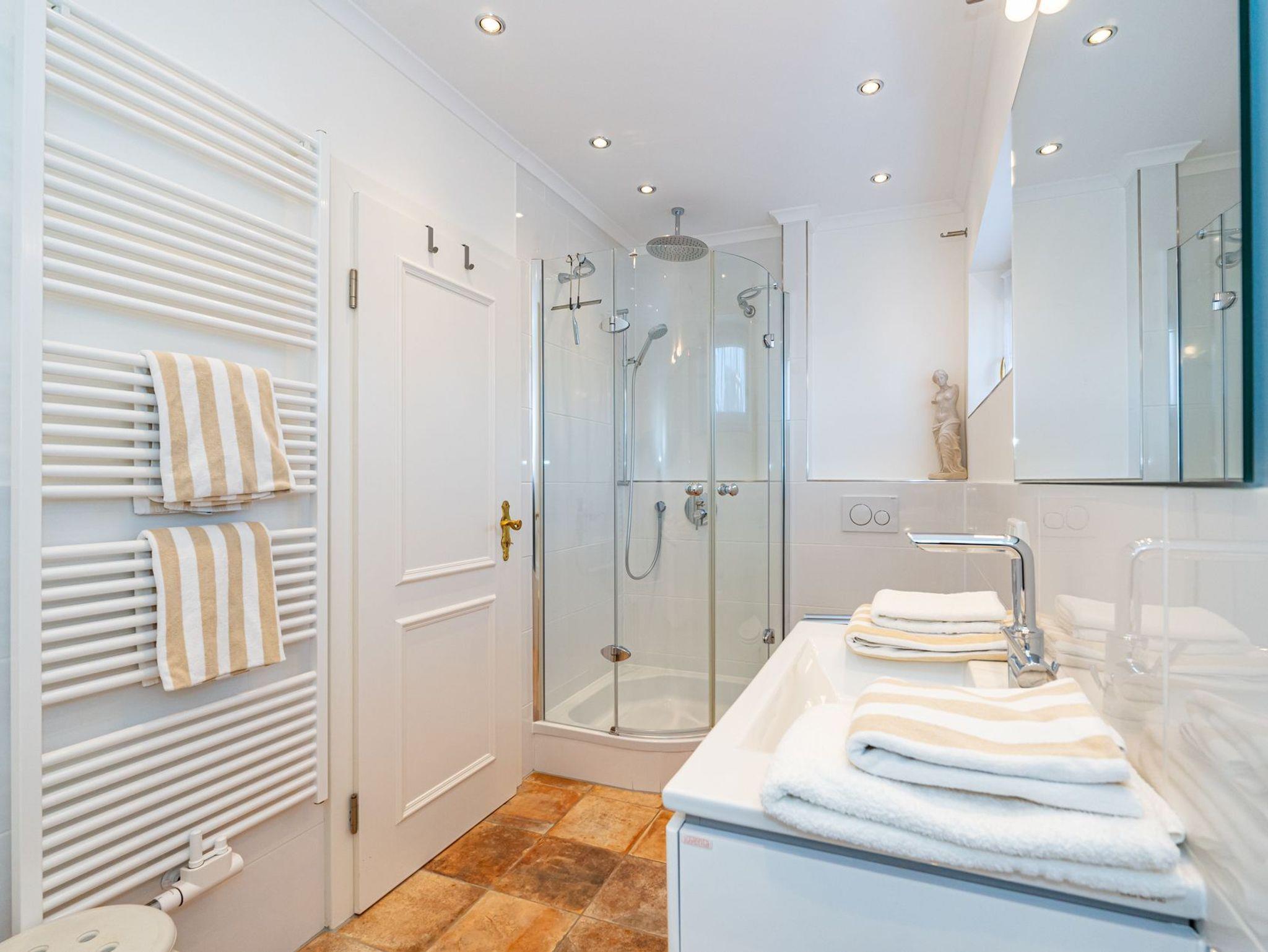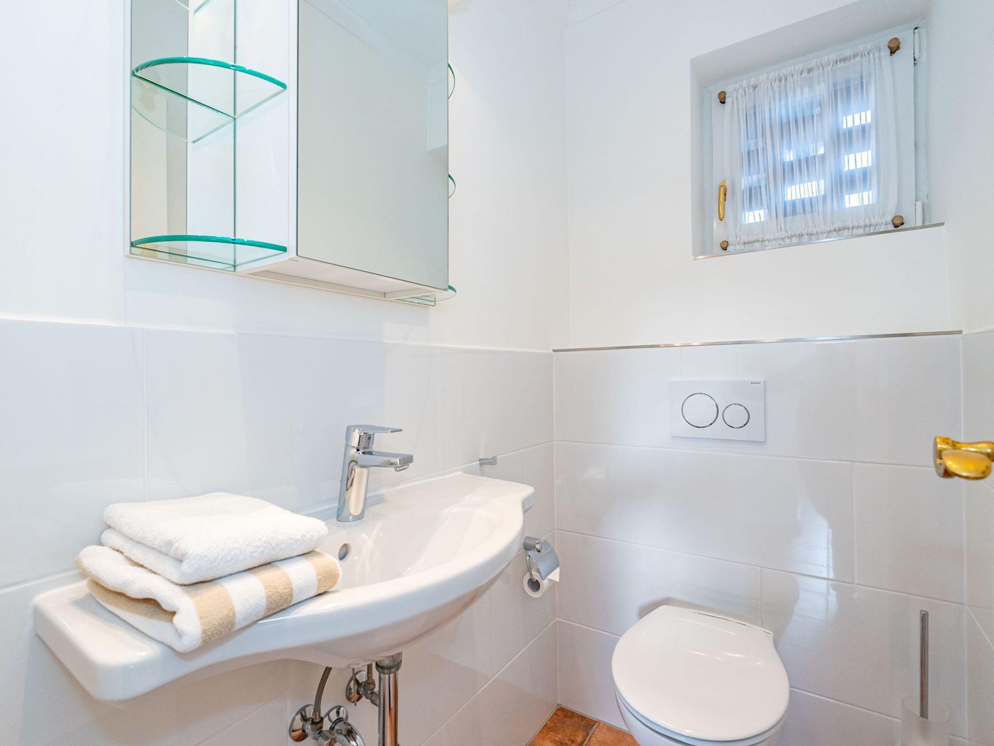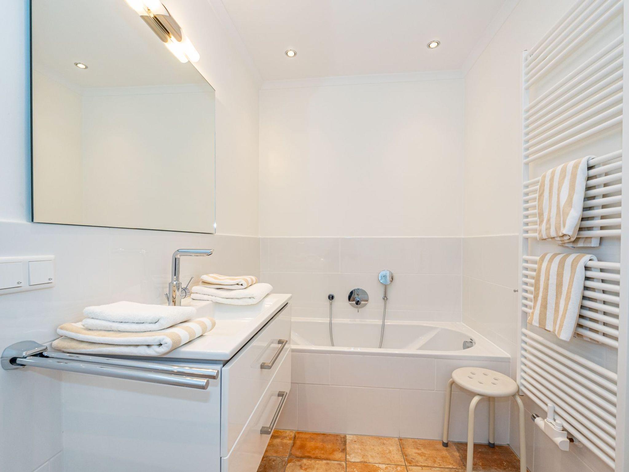 Zudem hat man vom Wohnraum Zugang in das komplett ausgestattete Badezimmer (mit Dusche, Badewanne, Waschtisch, Handtuchtrockner, Föhn, WC) und dem separaten Gäste-WC.