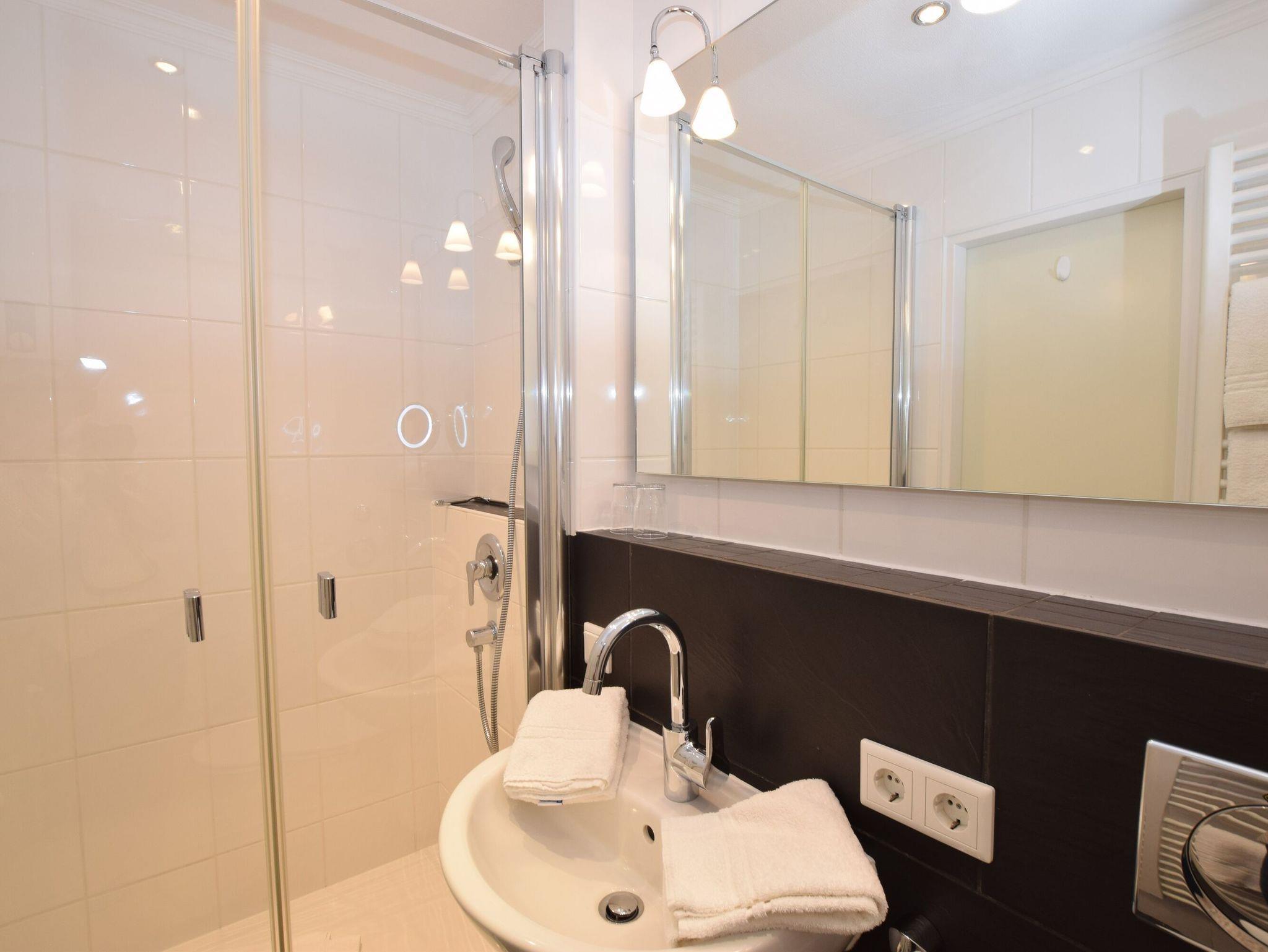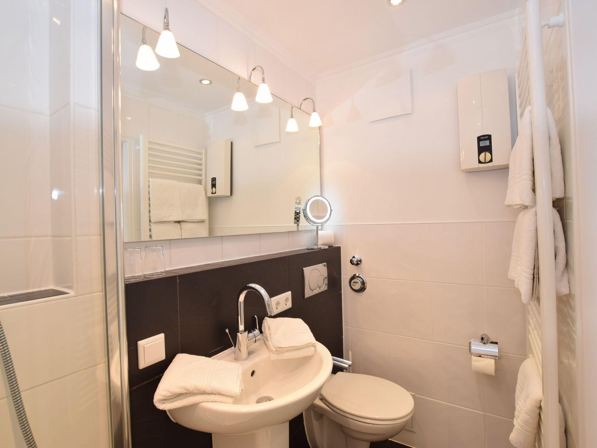 Im Bad befinden sich eine flache Dusche, ein WC, ein Waschtisch, ein Handtuchtrockner und ein Fön.