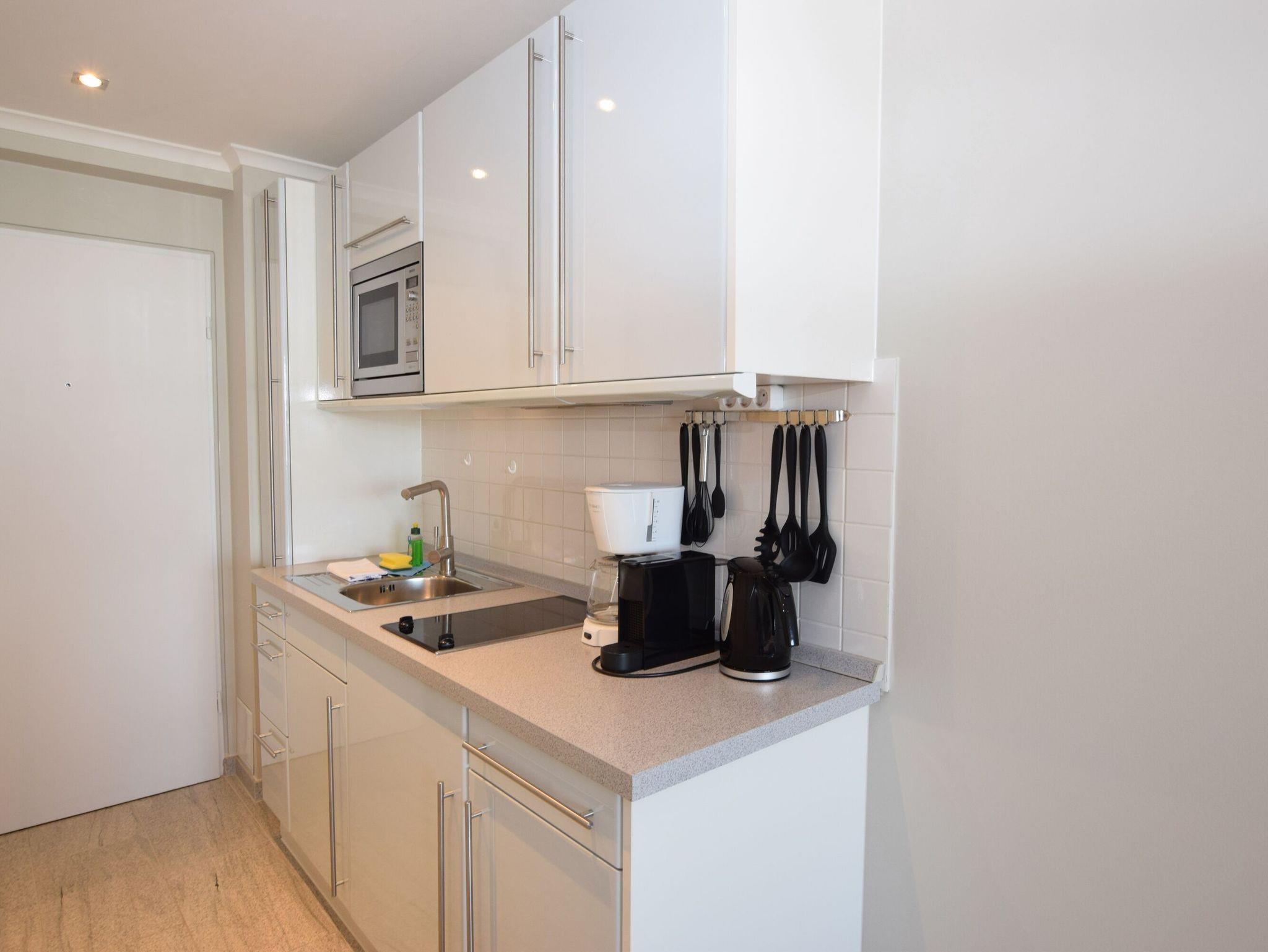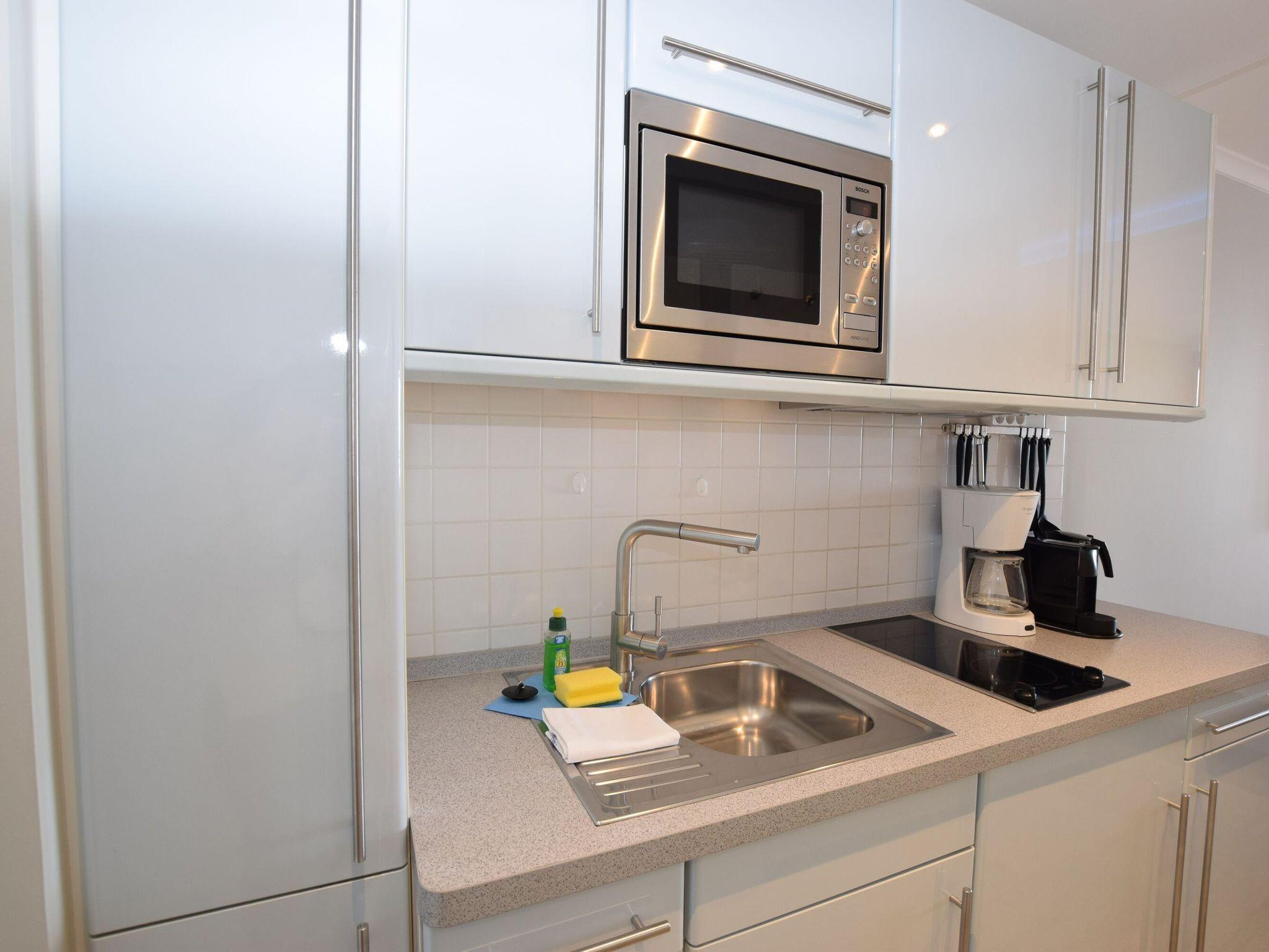 Die moderne Küchenzeile hat ein Cerankochfeld, eine Mikrowelle mit Grillfunktion und einen Kühlschrank mit 3*-Gefrierfach. Nespresso- und Filterkaffeemaschine, Wasserkocher und Toaster gehören zur Grundausstattung.
