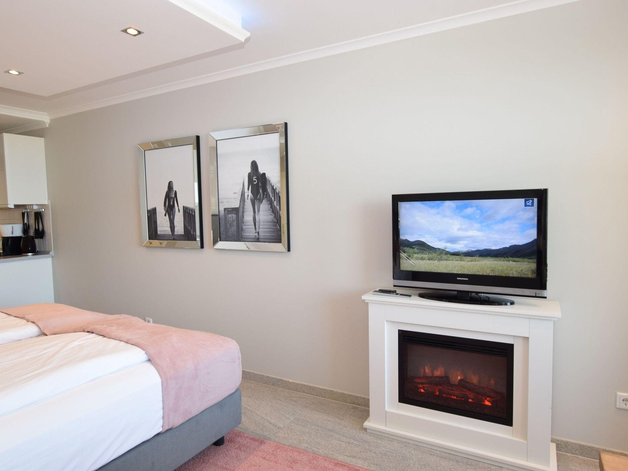 Der gemütliche Wohn-/Schlafraum mit Marmorboden besteht aus einem Essplatz, einem guten feststehenden Doppelbett, Flachbild-TV, Digitalradio.