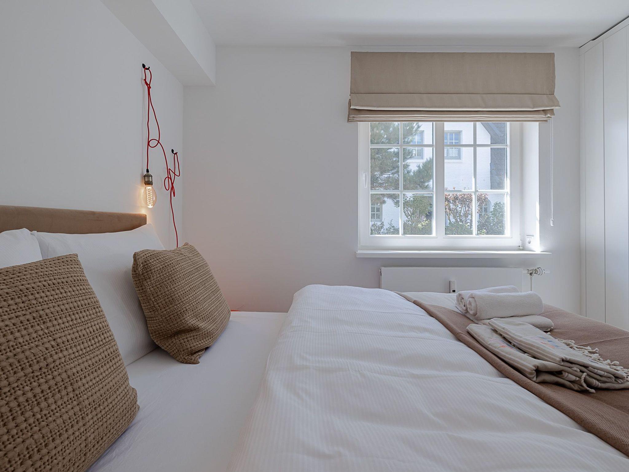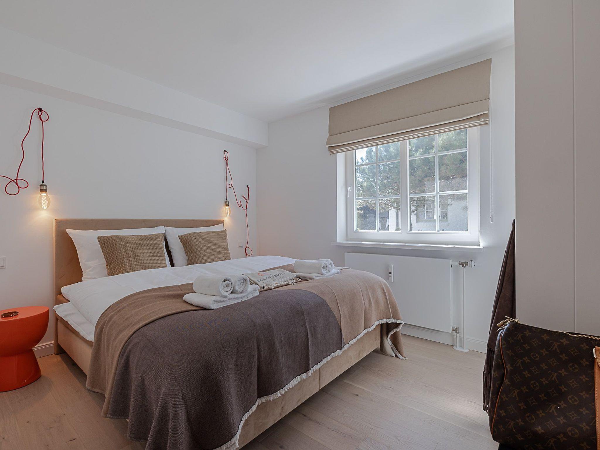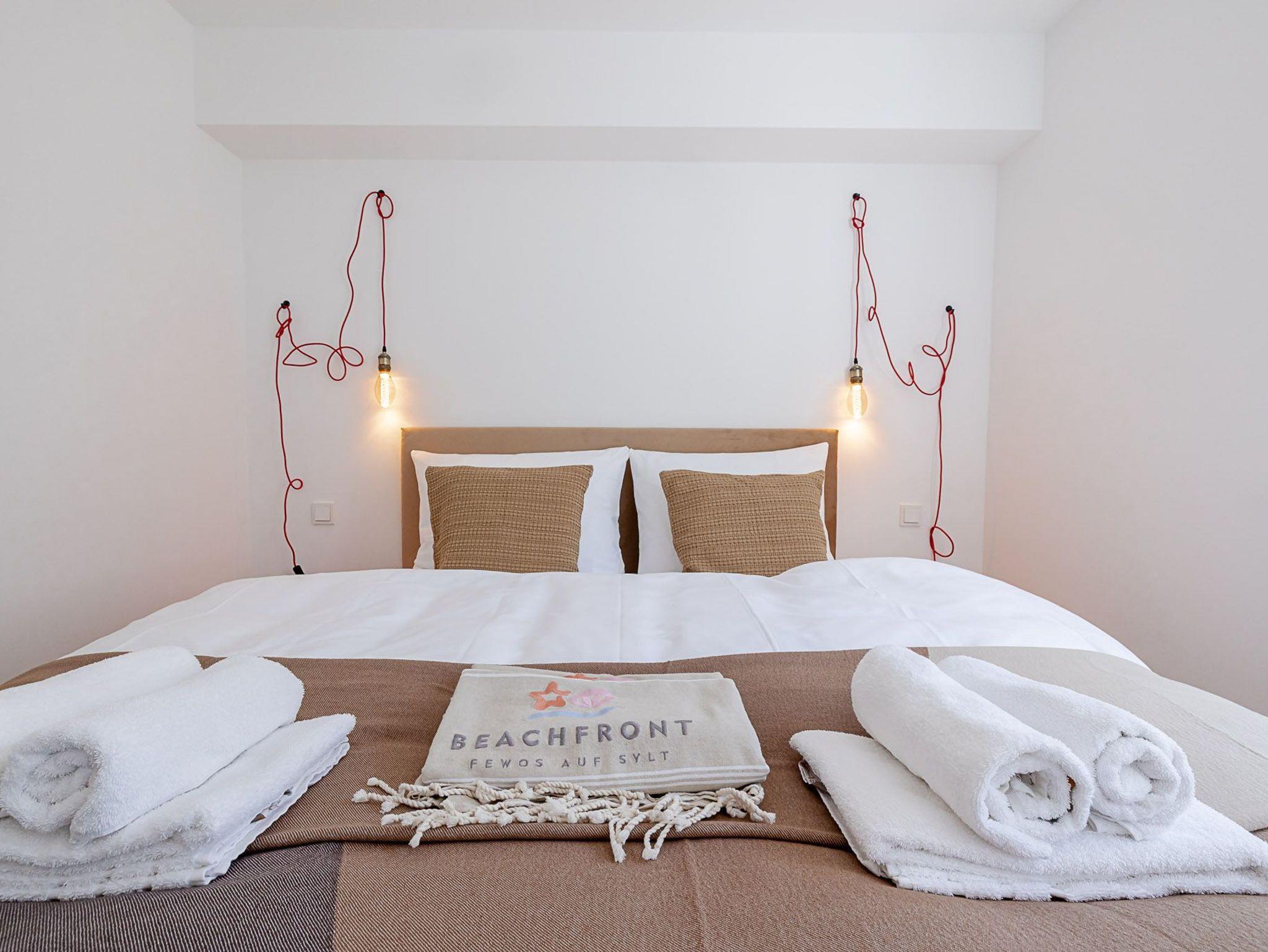 Das Schlafzimmer ist mit einem komfortablen und großen Schramm Boxspringbett ausgestattet, perfekt für die wohlverdiente Erholung nach einem ausgiebigen Strandtag und langen Spaziergängen.