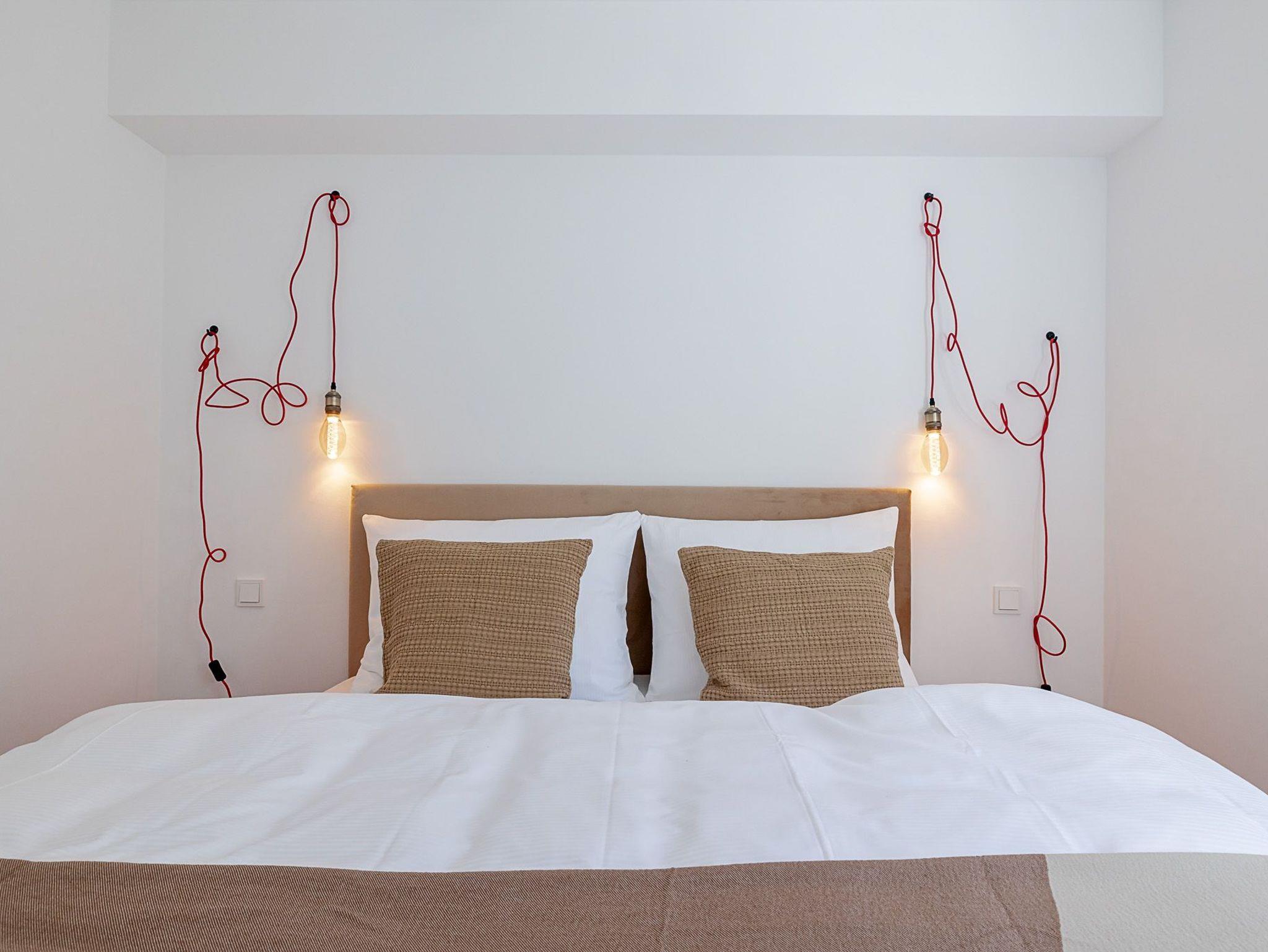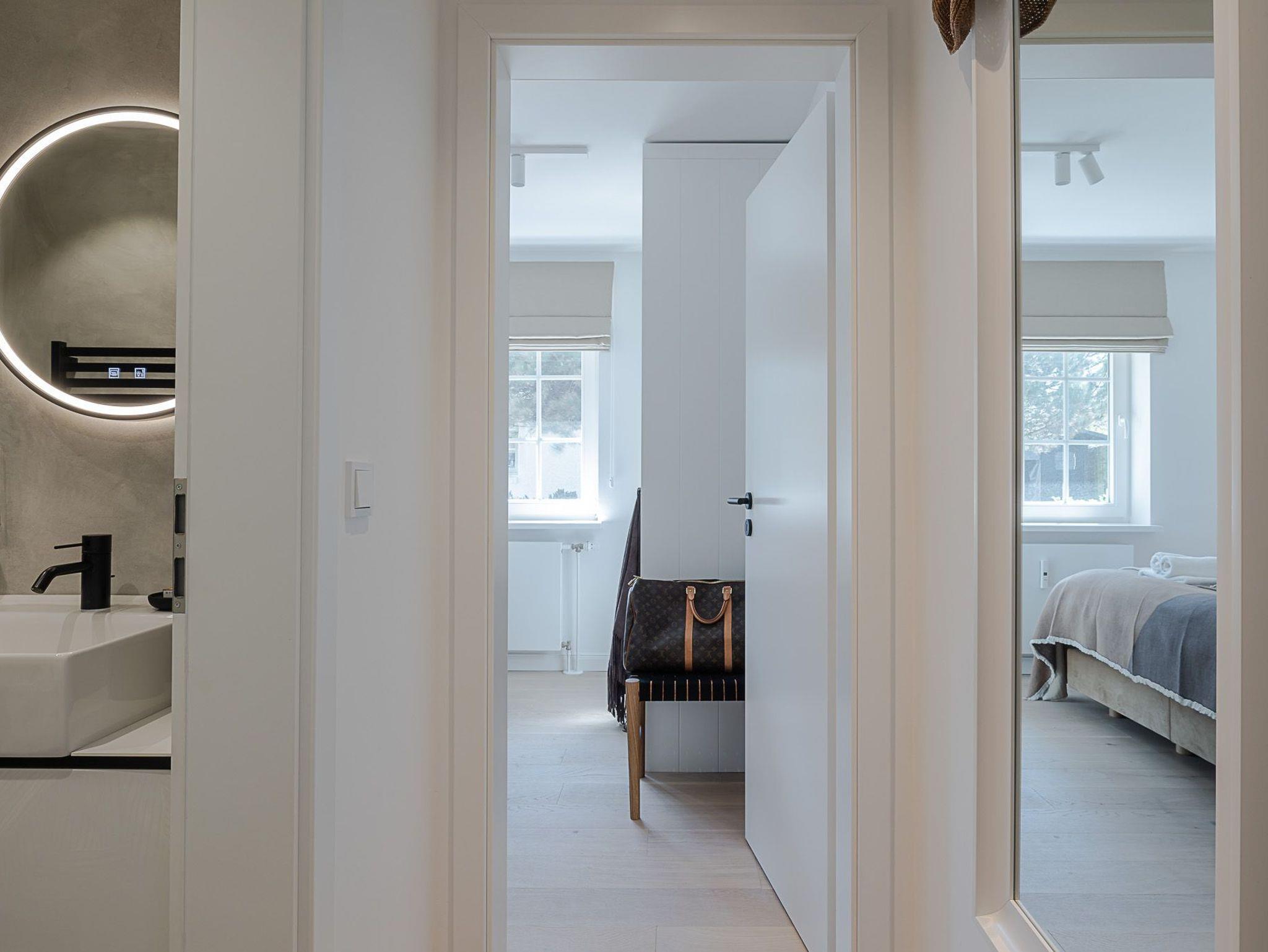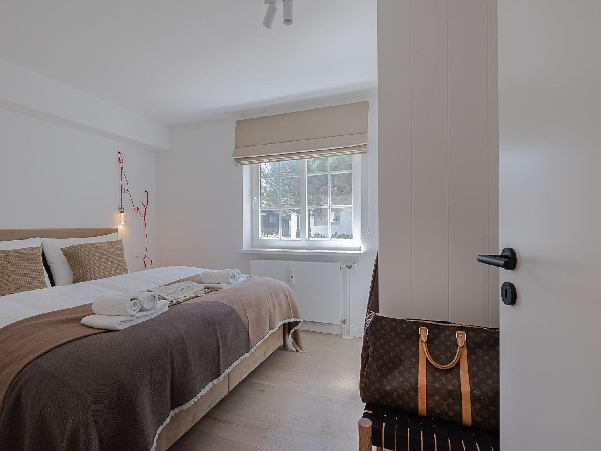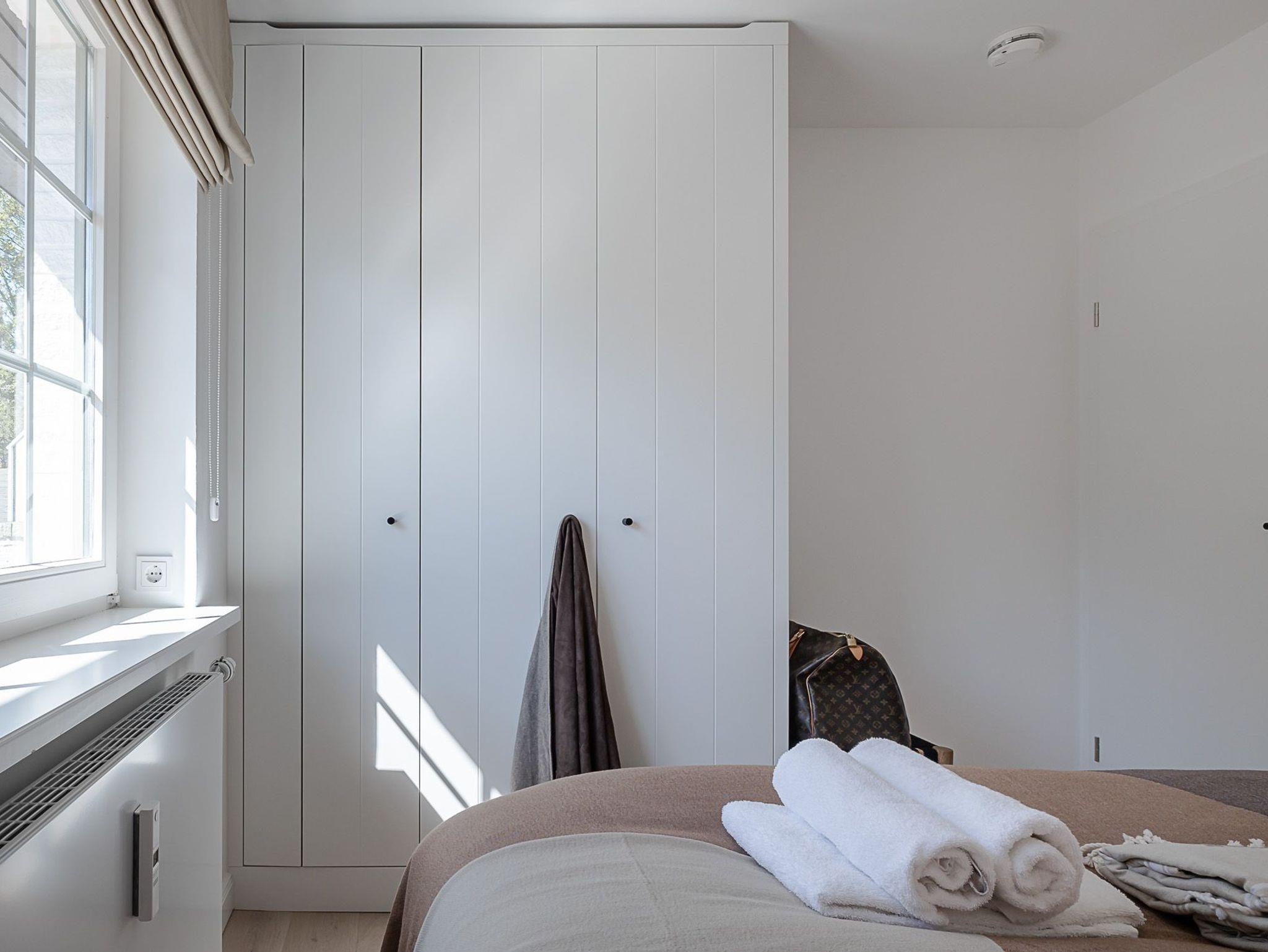 Das Schlafzimmer ist mit einem komfortablen und großen Schramm Boxspringbett ausgestattet, perfekt für die wohlverdiente Erholung nach einem ausgiebigen Strandtag und langen Spaziergängen.