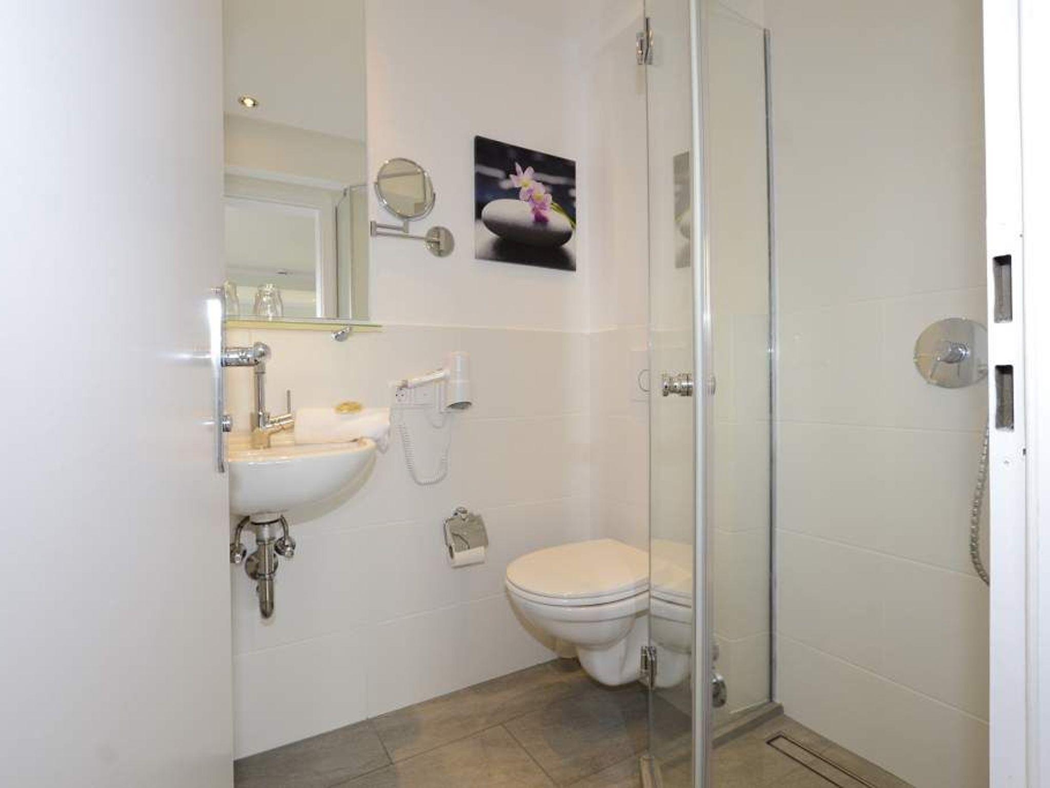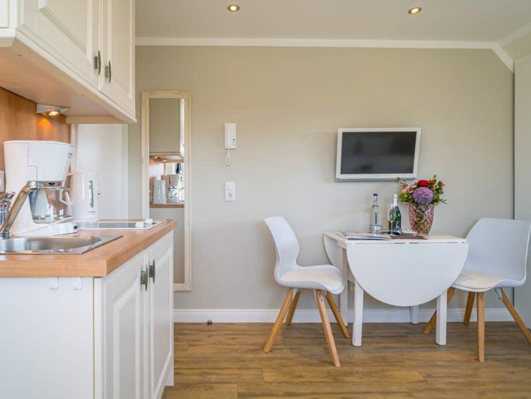 Die kompakte Küchenzeile hat ein Ceranfeld mit 2 Kochfeldern und einen Kühlschrank. Kaffeemaschine, Wasserkocher und Toaster gehören zur Grundausstattung. Im modernisierten Bad befinden sich Dusche, Fön, Kosmetikspiegel, ein WC und ein Waschtisch.