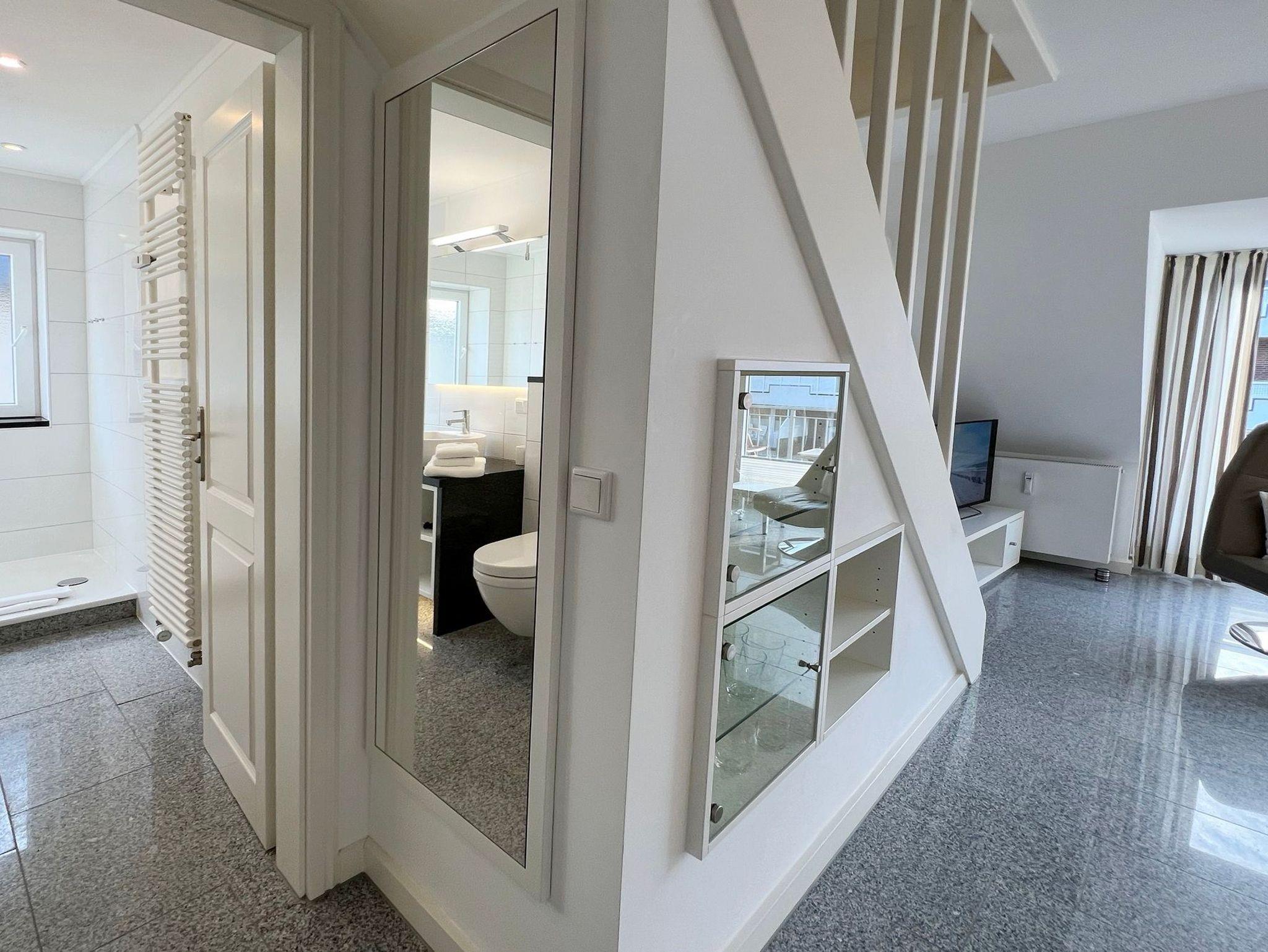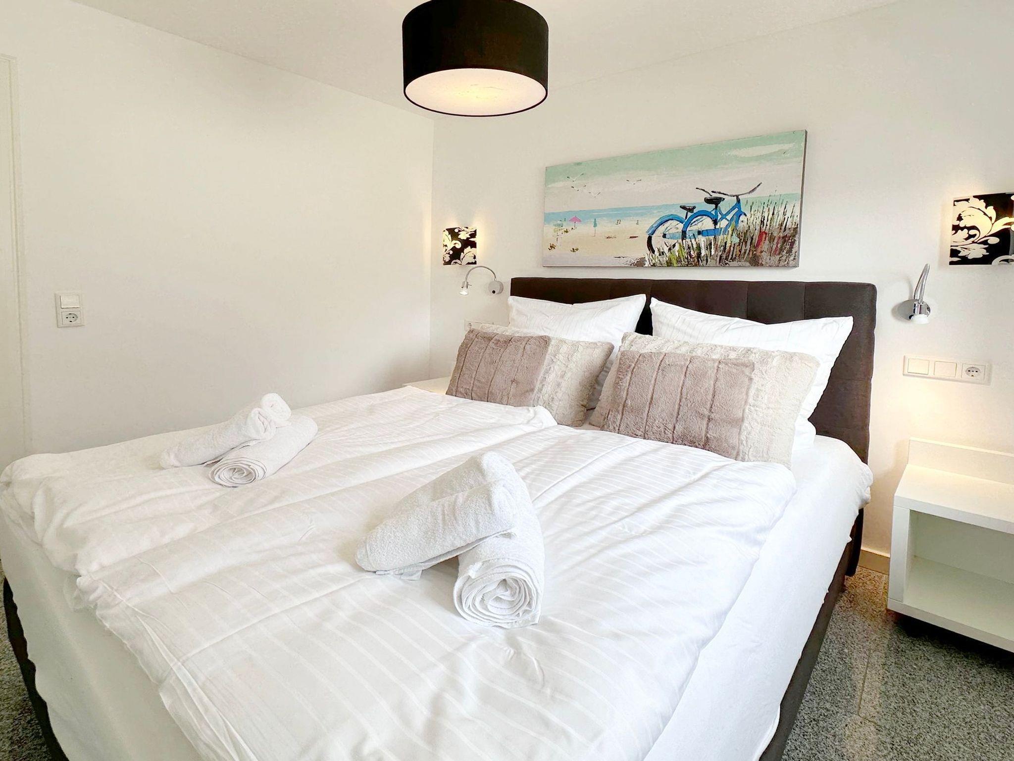 Diese gut geschnittene 3-Zimmer-Ferienwohnung ( OG / SB ) befindet sich nur einen Katzensprung vom nächsten Strandübergang entfernt. Wohnraum mit Sofa und Loungesesseln, offene Küche mit Nespressomaschine, Essplatz und Balkon, Masterbedroom mit zweitem TV und Tischlereinbauten. Duschbad mit WC und Waschbecken. Im Spitzboden befindet sich ein weiterer Raum mit 2 Betten die auch zu einem Doppelbett zusammengestellt werden können und ein zweites Duschbad. Ein TV-Gerät, Blue-Ray-Player und eine Stereoanlage mit iPod-Dockingstation und Bluetooth stehen dort ebenfalls zur Verfügung. Zur Wohnanlage gehört Waschmaschine und Trockner ( mit Münzeinwurf ) zur gemeinschaftlichen Nutzung.