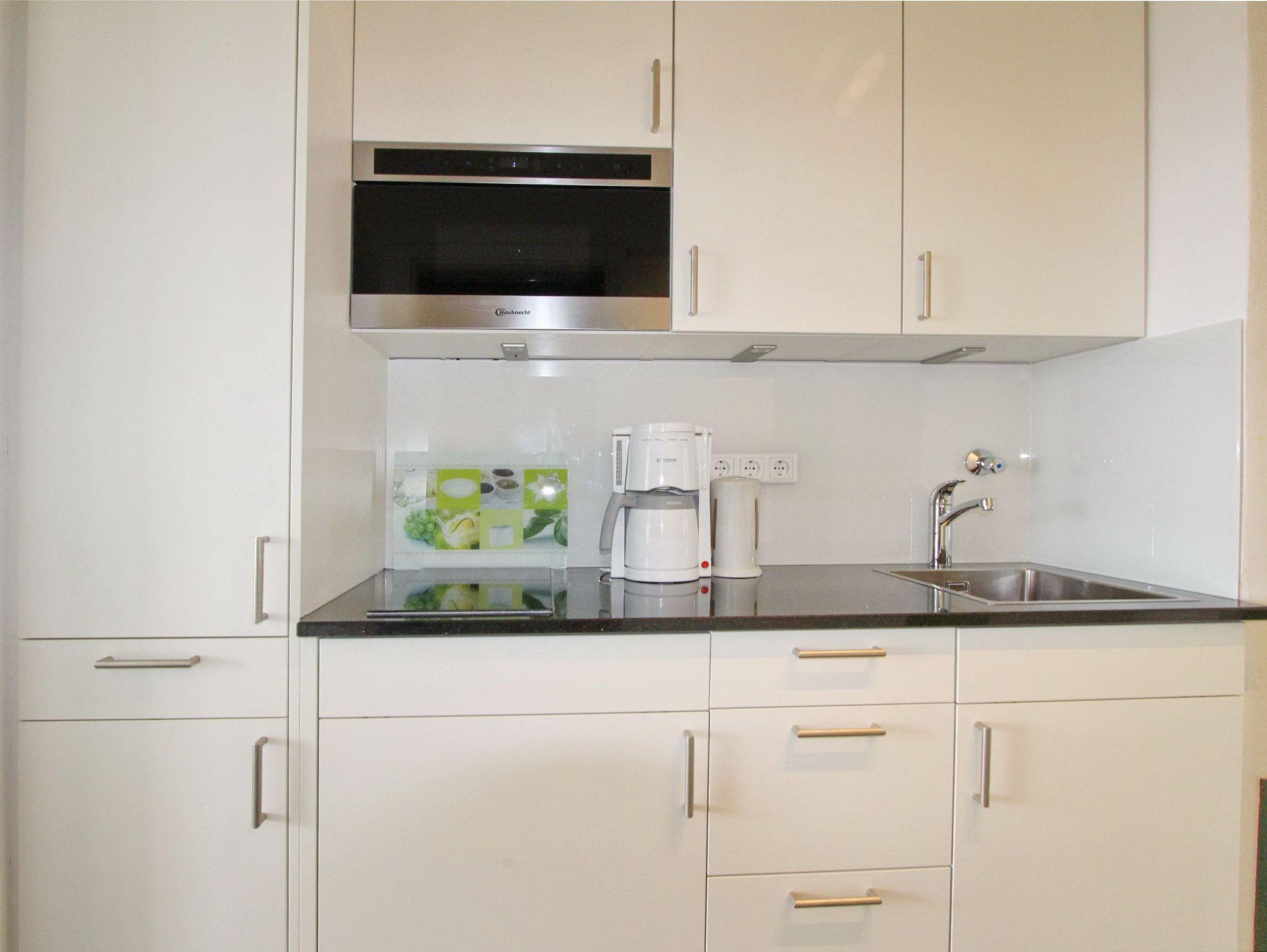 Gemütliche Einzimmerwohnung mitten im Zentrum von Westerland. Nur wenige Gehminuten zu den Fussgängerzonen und zum Strand. Sie befindet sich in der 6. Etage mit Balkon und herrlichem Weitblick über die Insel. Das kombinierte, geflieste Wohn-/Schlafzimmer ist mit einem Doppelschrankbett, einem kleinen Zweisitzersofa und einem Essplatz mit 2 Stühlen am Fenster ausgestattet. Im Flurbereich finden Sie die Küchenzeile mit Ceranfeld und Microwelle vor. Das Badezimmer verfügt über eine Dusche mit WC. Zur technischen Ausstattung dieser Nichtraucherwohnung gehört ein Flachbildfernseher der Marke Sony und eine Stereoanlage mit CD-Player. Haustiere sind nicht gestattet. Wohnungsgröße ca. 28 m².