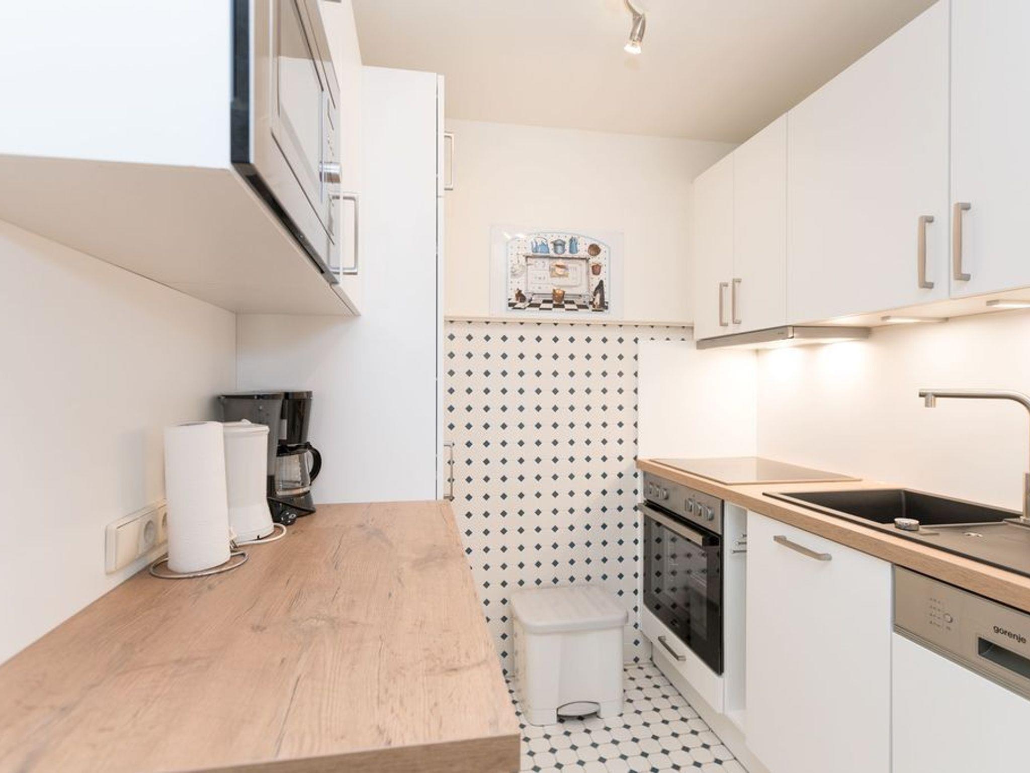Die integrierte Küche bietet jeglichen funktionellen Komfort, Geschirrspüler, Mikrowelle, Maxi-Kühlschrank, Herd mit Backofen, 4er Ceran-Kochfeld.