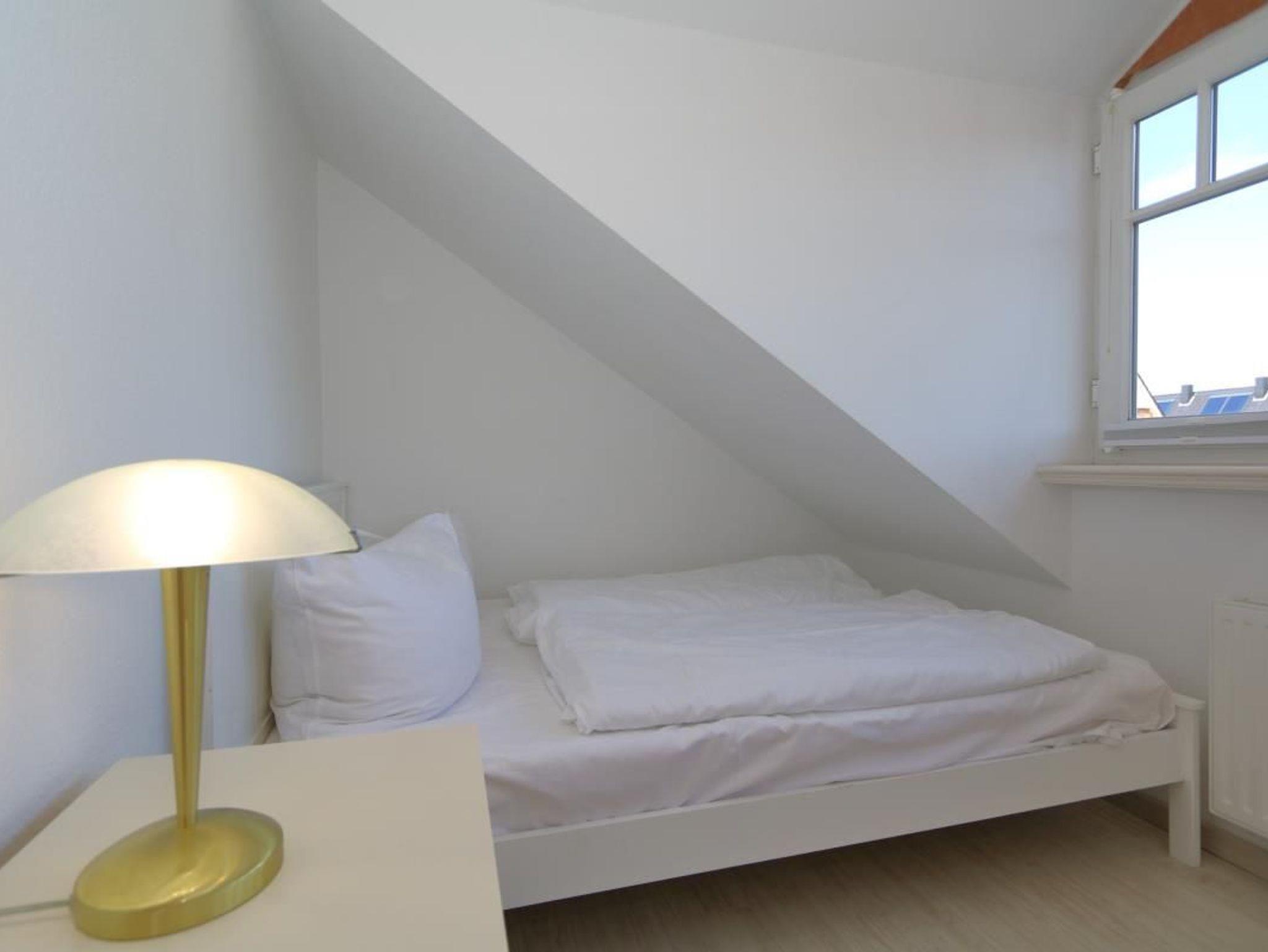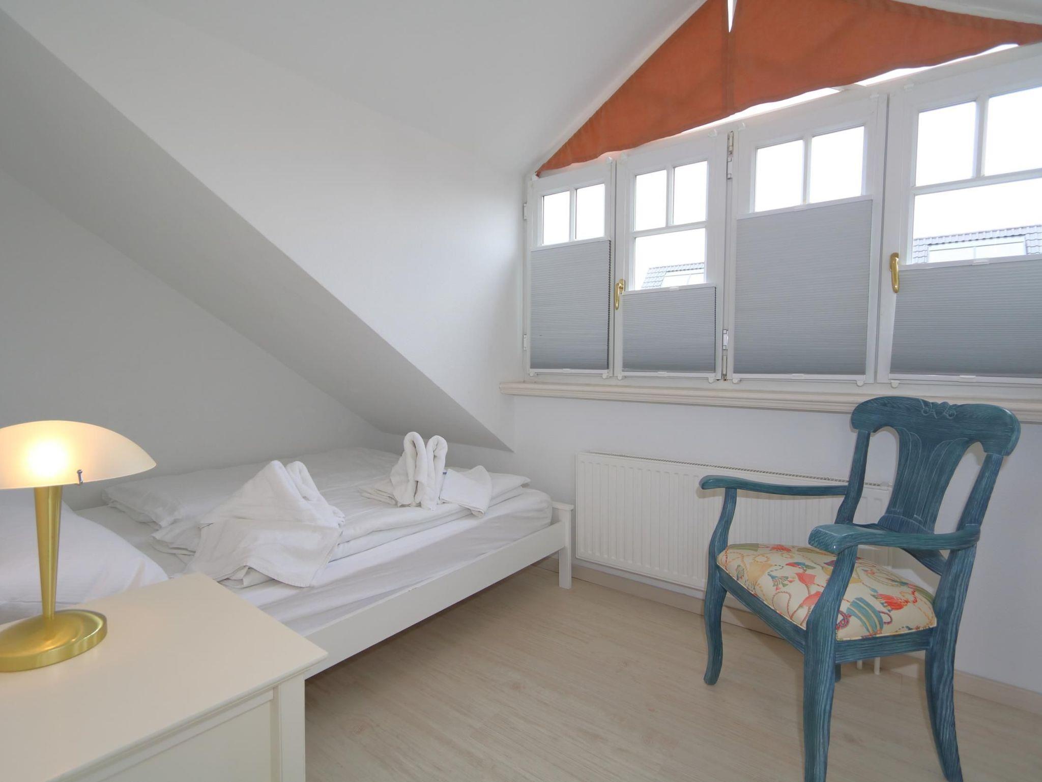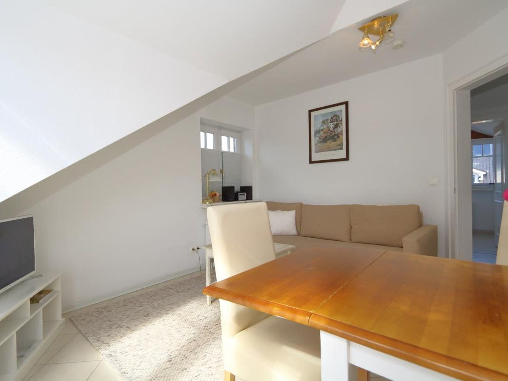 Die helle und freundliche Ferienwohnung hat ein schönes Wohnzimmer mit Zugang zum Balkon. Zur Austattung gehören ein Essplatz und ein Schlafsofa. Ein Flat-TV und eine Stereoanlage tragen zur Unterhaltung bei. Die seperate Küche mit Backofen befindet sich nebenan. Im Schlafzimmer ist das Doppelbett unter Dachschräge, außerdem gibt es im Schlafzimmer einen Einbauschrank mit viel Platz. Das Duschbad hat ein Fenster.