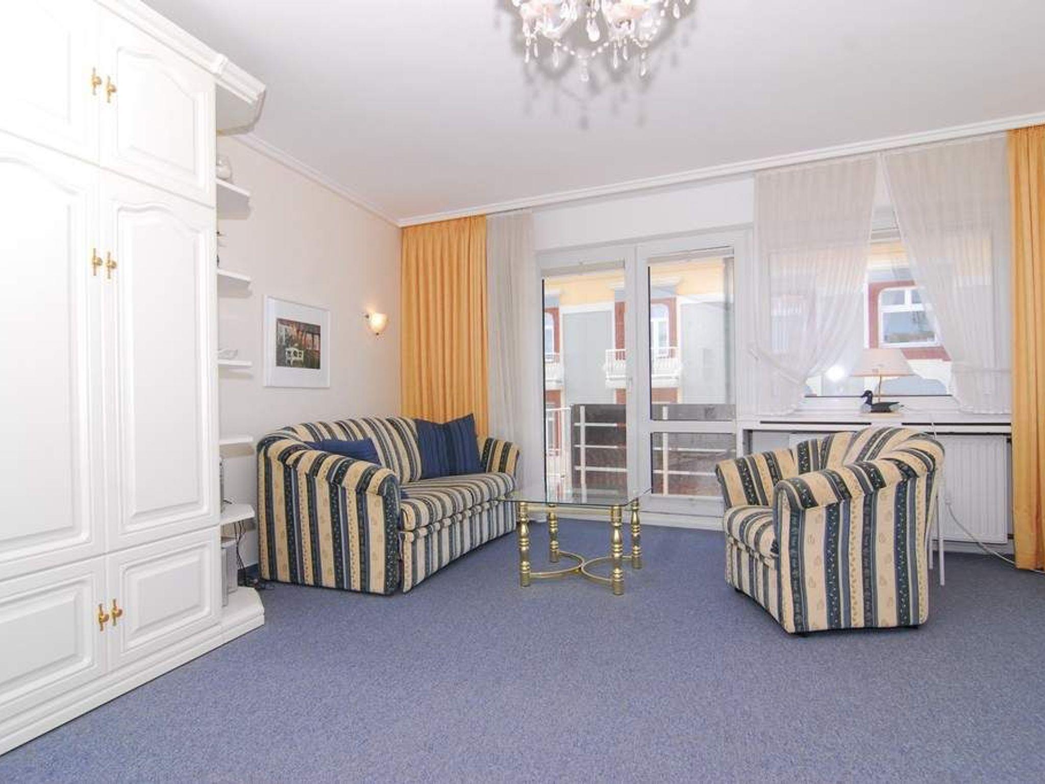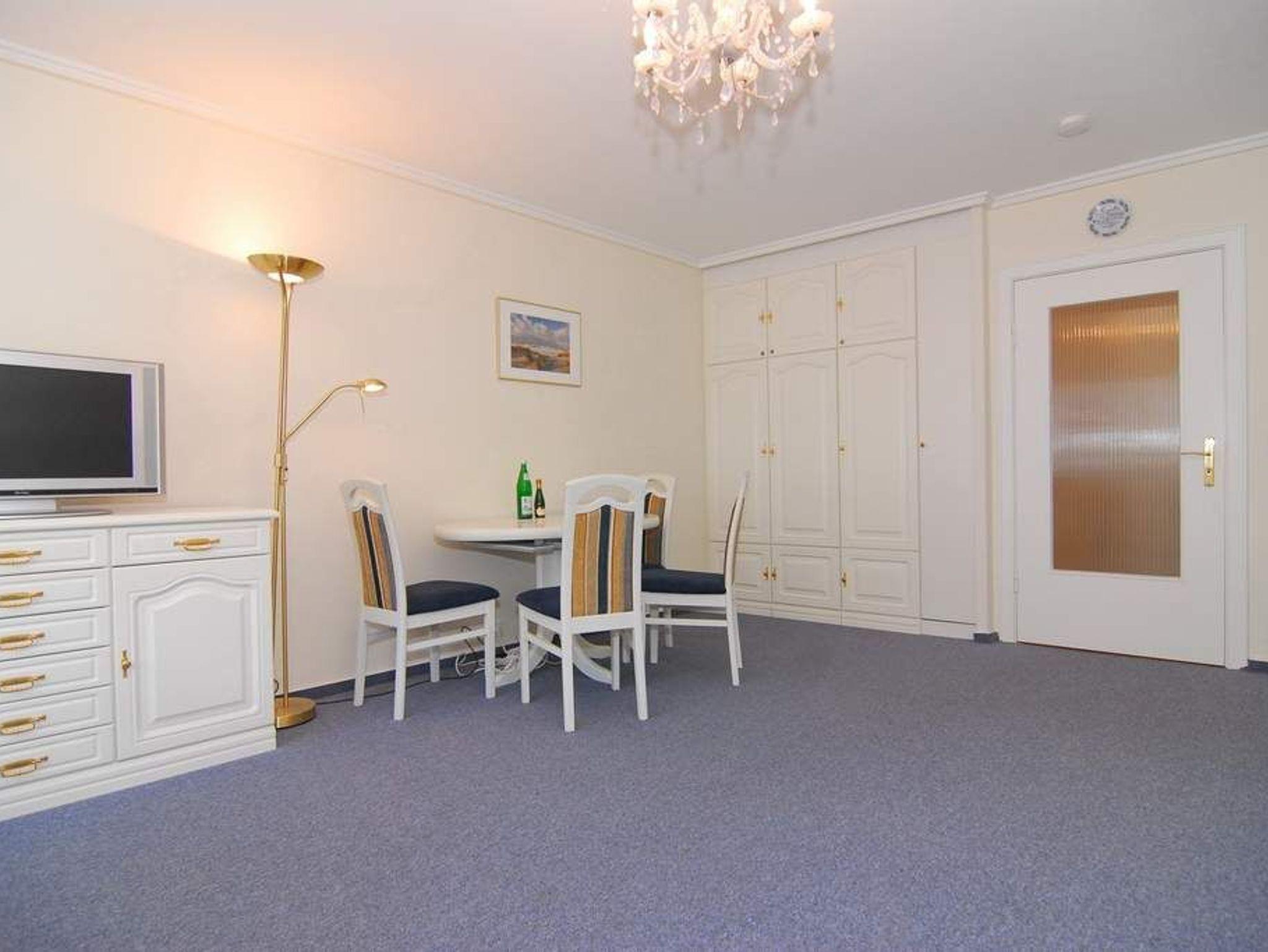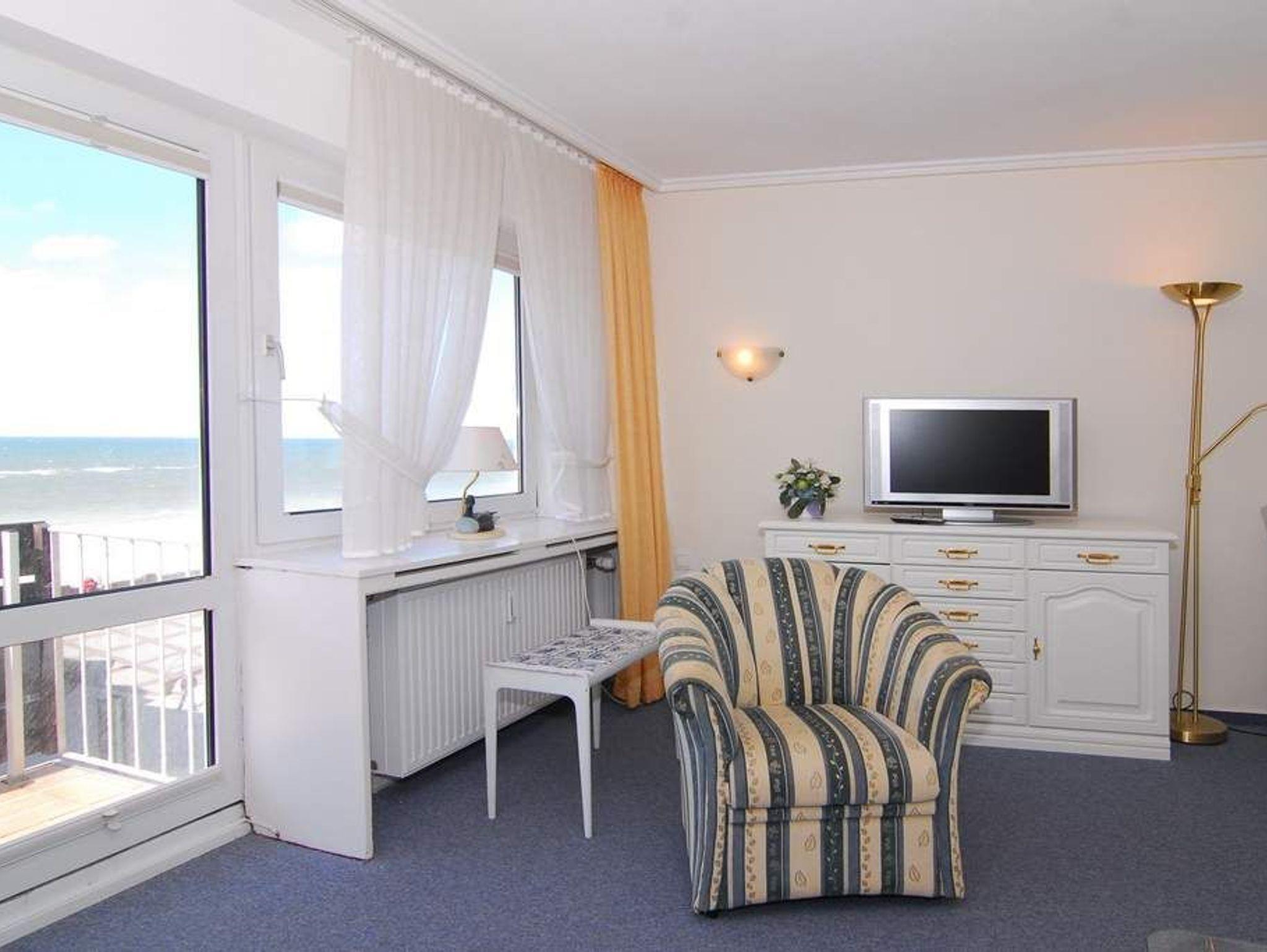 1-Zimmer-Ferienwohnung, ca. 40 m², 4. OG. Nichtraucher. Wohn-/Schlafraum mit kleinem Westbalkon und teilweisem Meeresblick, Schrankwand mit Einzelschrankbetten, Eßtisch mit 3 Stühlen, 2 Sitzer-Couch, Sessel und Couchtisch, Sideboard, Kabel-Flat-TV, Radio, separate Küche mit 2 Platten Cerankochfeld, Mikrowelle und Geschirrspüler, Duschbad mit kleiner Runddusche, Fön und WC. Fahrstuhl vorhanden. Tierhaltung ist nicht gestattet. Pkw-Stellplatz kann kostenpflichtig hinzugebucht werden. Bettwäsche und Handtücher sind zur Anreise aufgezogen!