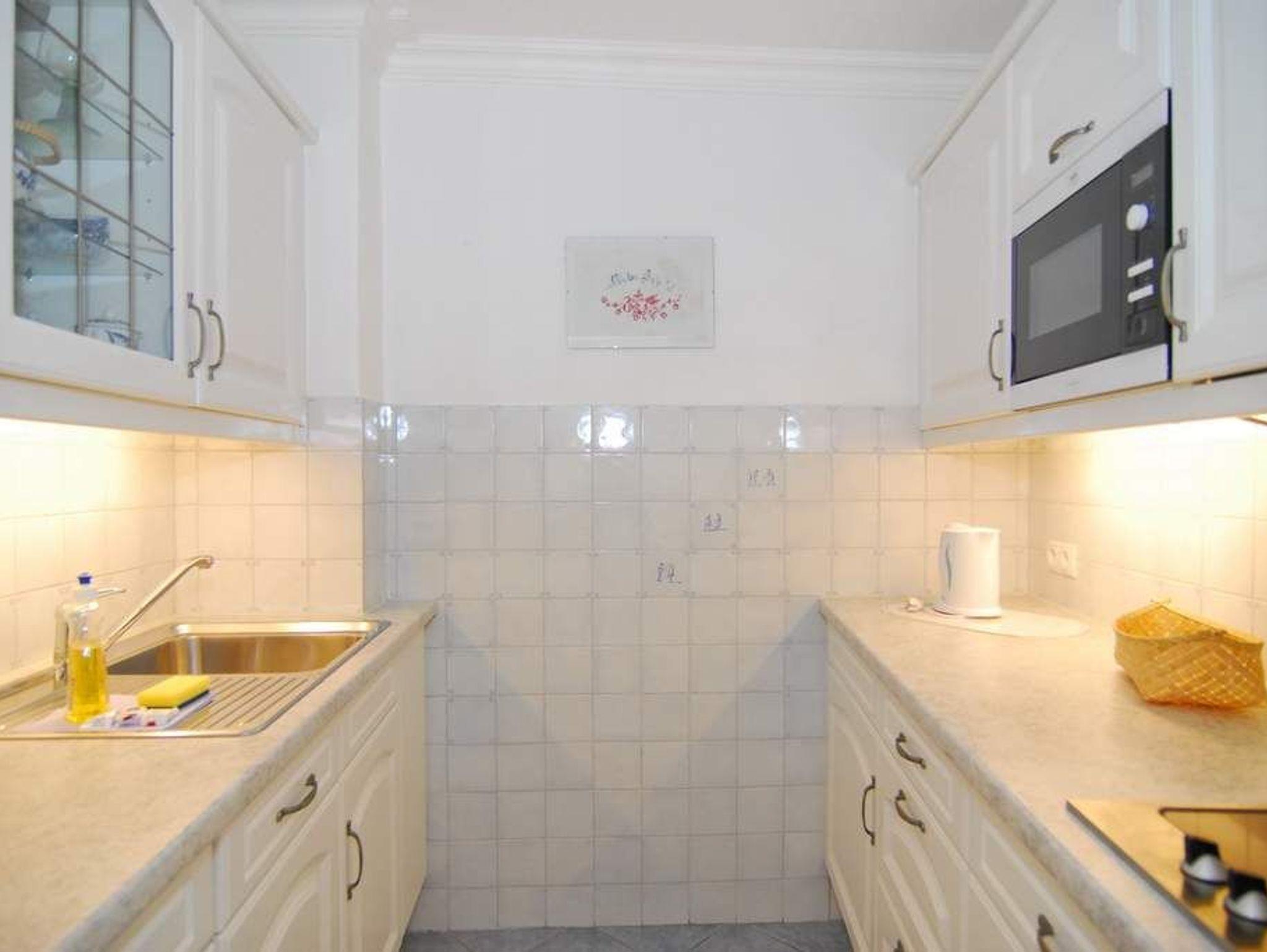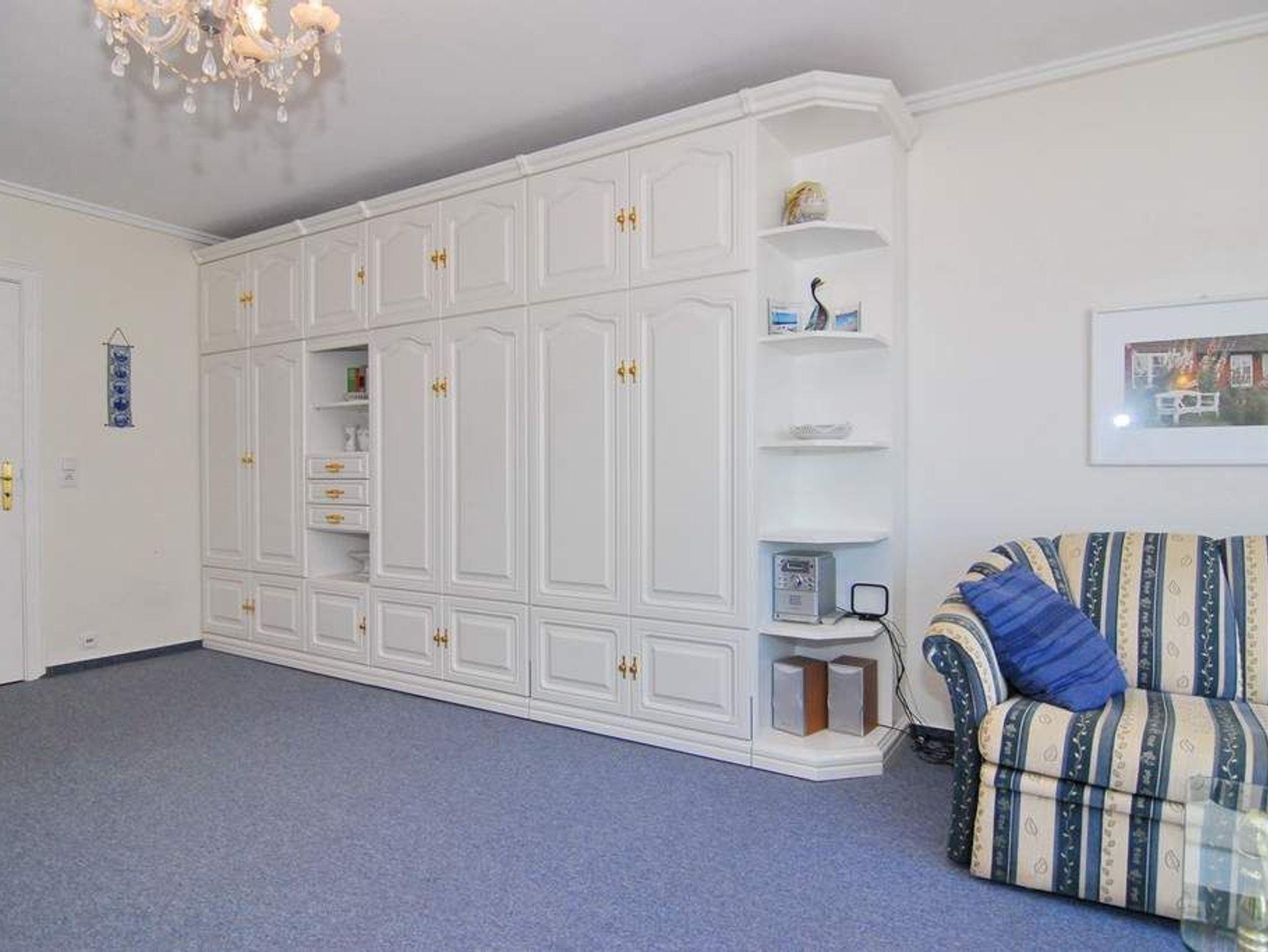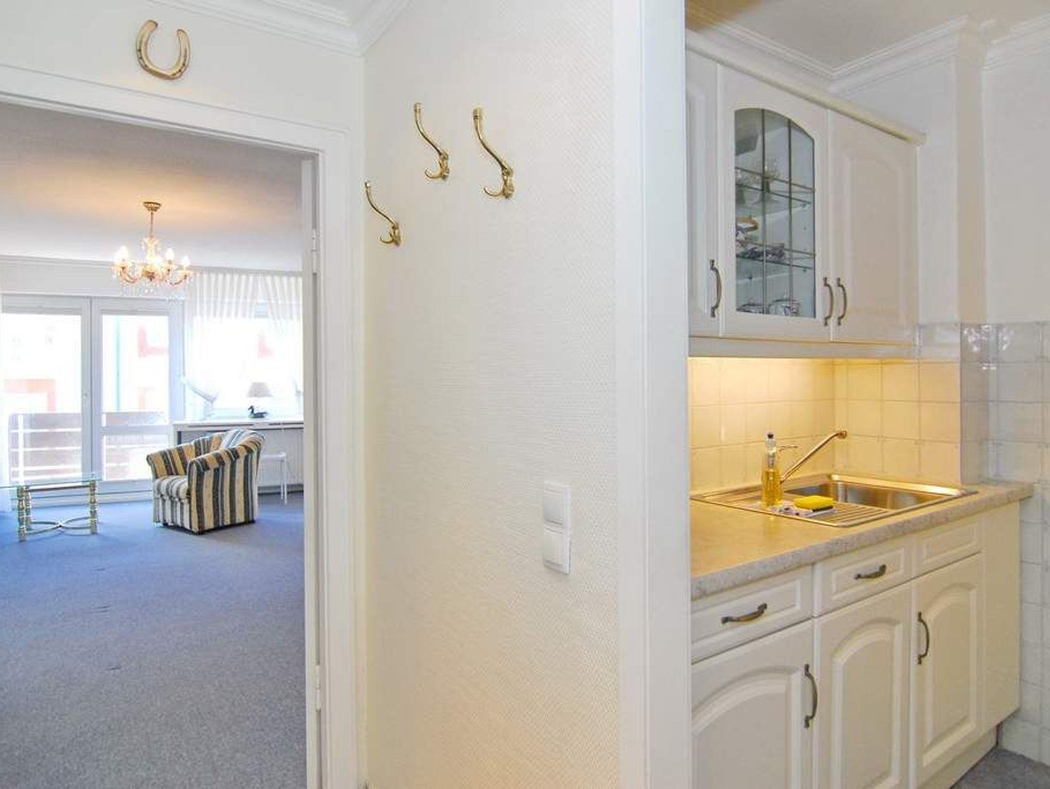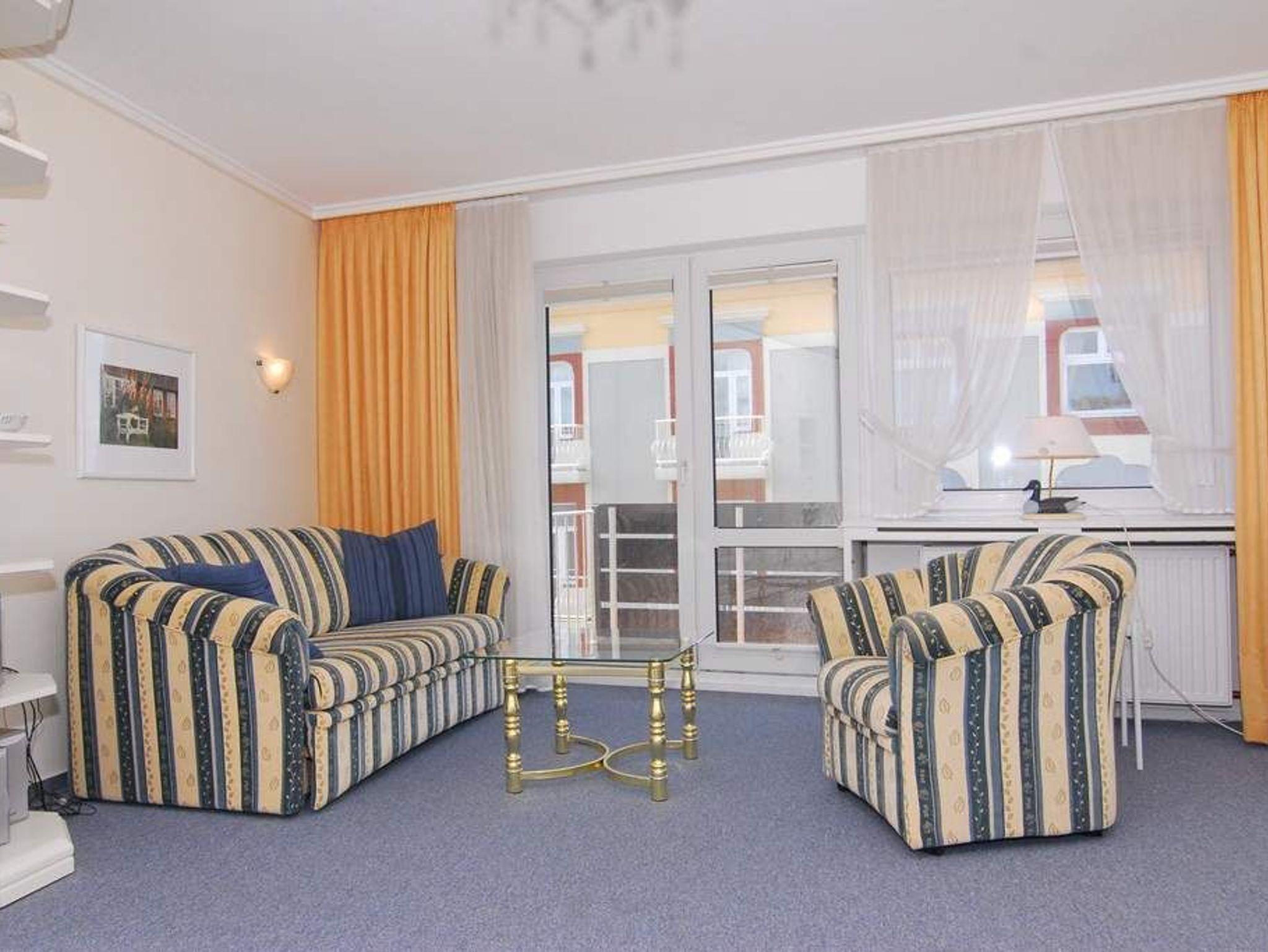 1-Zimmer-Ferienwohnung, ca. 40 m², 4. OG. Nichtraucher. Wohn-/Schlafraum mit kleinem Westbalkon und teilweisem Meeresblick, Schrankwand mit Einzelschrankbetten, Eßtisch mit 3 Stühlen, 2 Sitzer-Couch, Sessel und Couchtisch, Sideboard, Kabel-Flat-TV, Radio, separate Küche mit 2 Platten Cerankochfeld, Mikrowelle und Geschirrspüler, Duschbad mit kleiner Runddusche, Fön und WC. Fahrstuhl vorhanden. Tierhaltung ist nicht gestattet. Pkw-Stellplatz kann kostenpflichtig hinzugebucht werden. Bettwäsche und Handtücher sind zur Anreise aufgezogen!