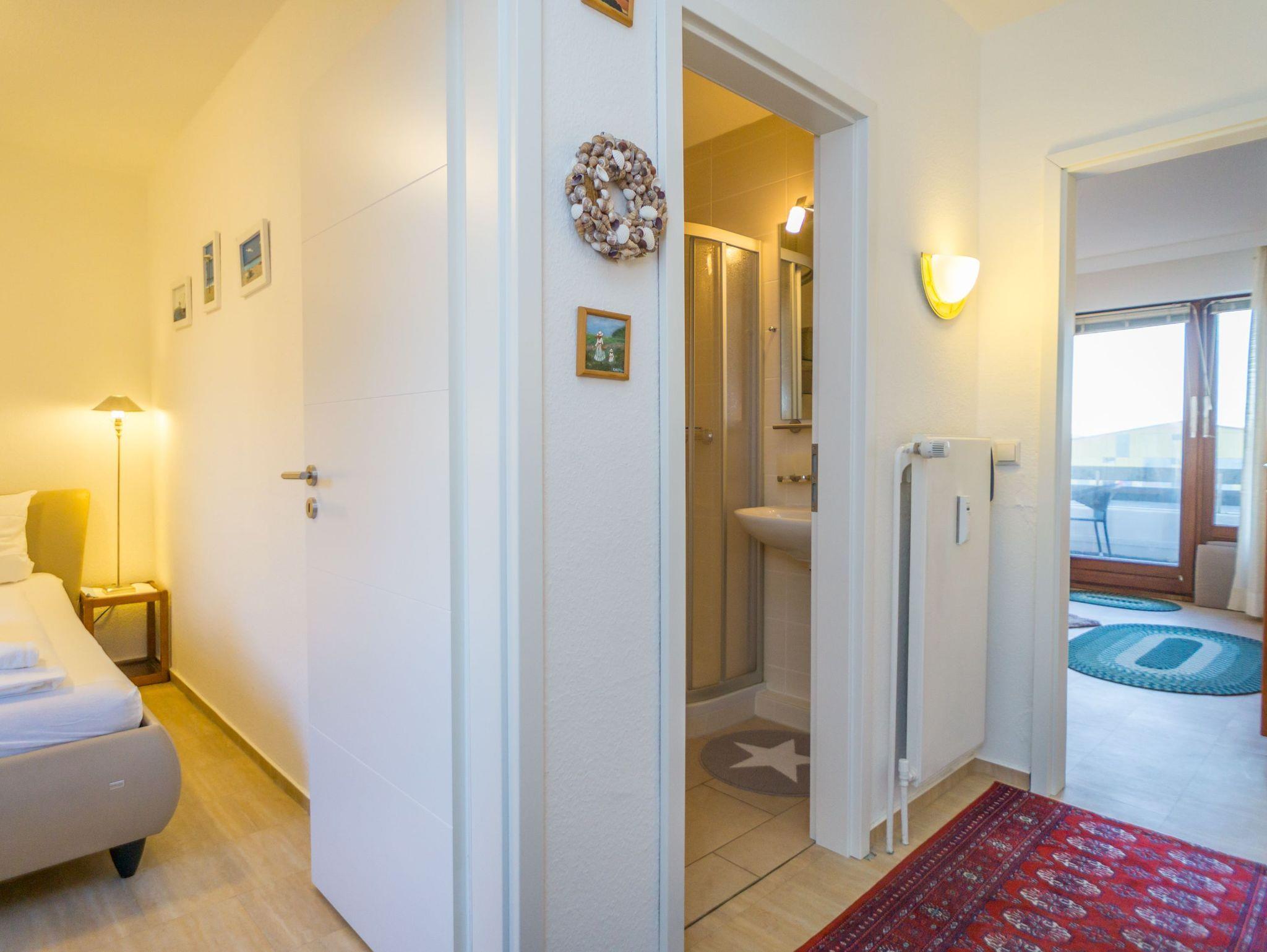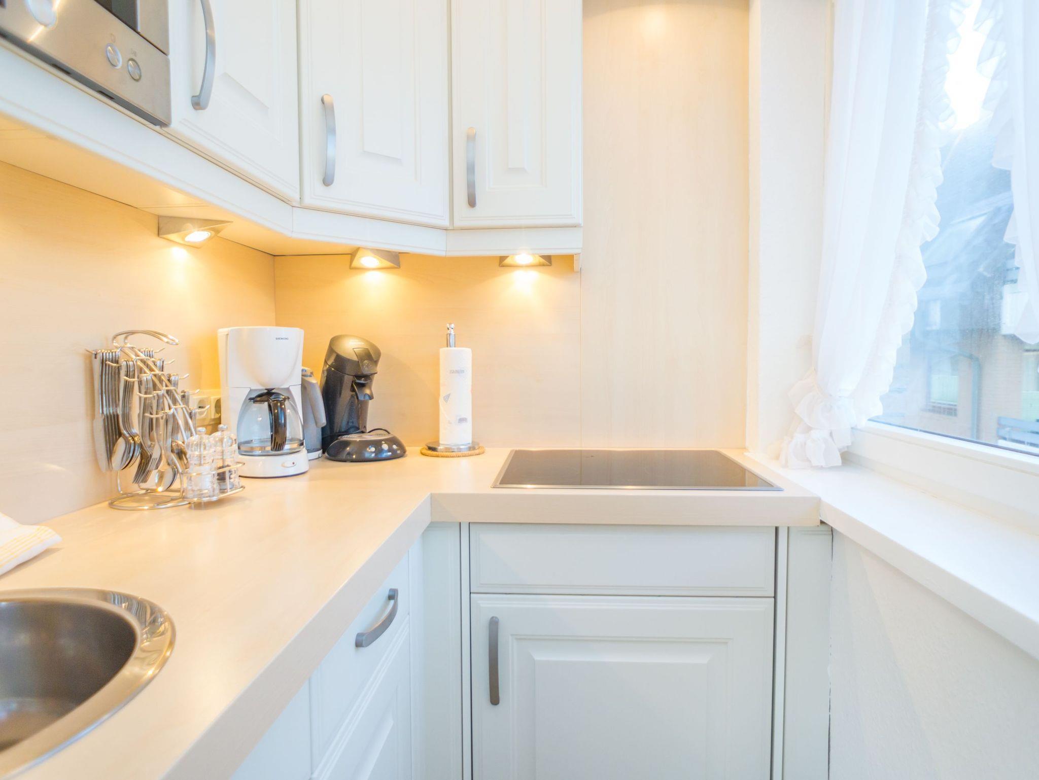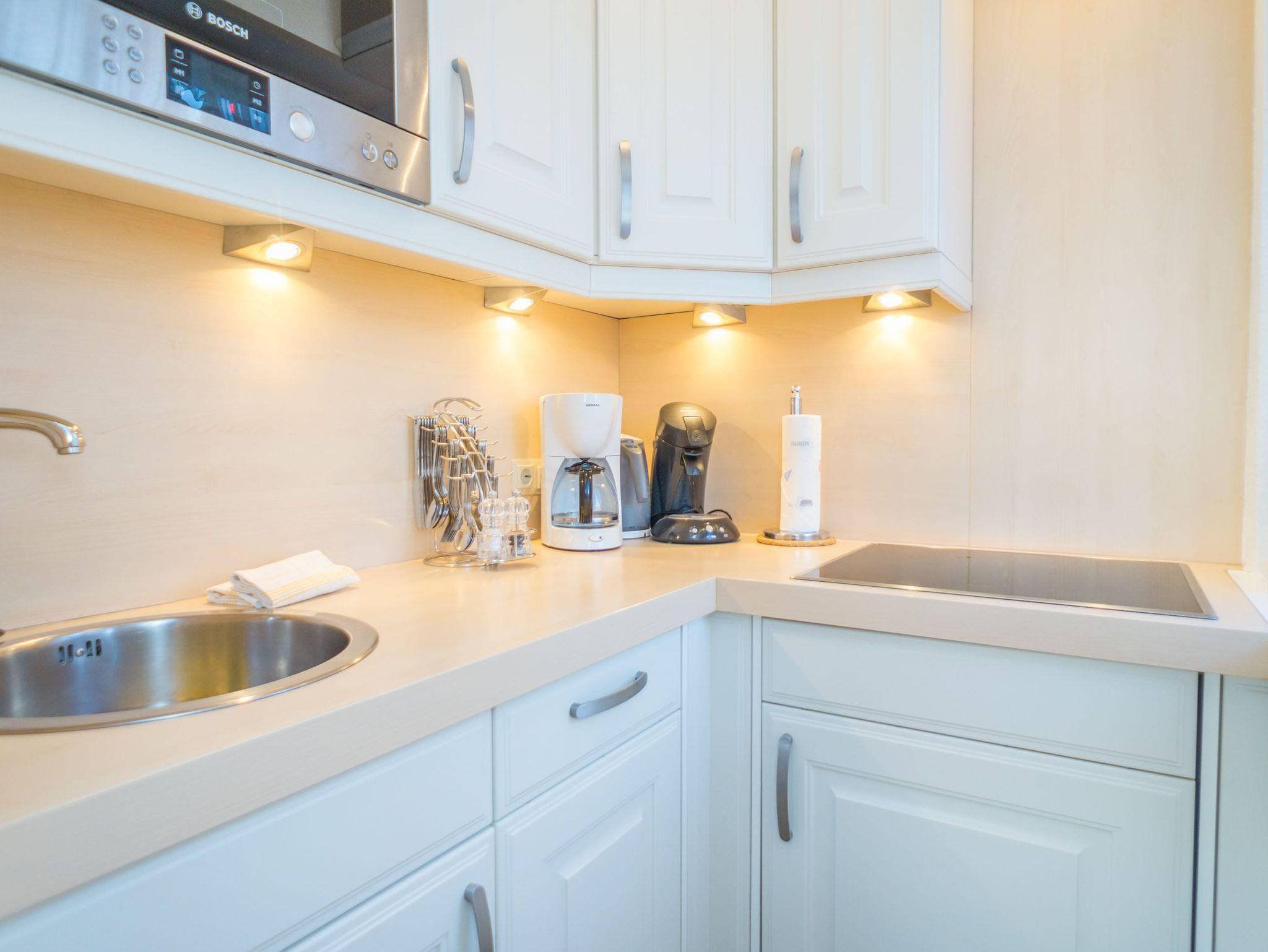 Die moderne Kochnische verfügt über eine Mikrowelle, einen Geschirrspüler, ein Cerankochfeld und hat ein Fenster. Kaffeemaschine, Wasserkocher und Toaster gehören selbstverständlich zur Grundausstattung. Das separate Schlafzimmer ist mit einem feststehenden Doppelbett ausgestattet, das aus zwei Einzelmatratzen (86 x 200 cm) besteht. Das helle Duschbad/WC bietet eine Dusche, ein WC und einen Waschtisch.