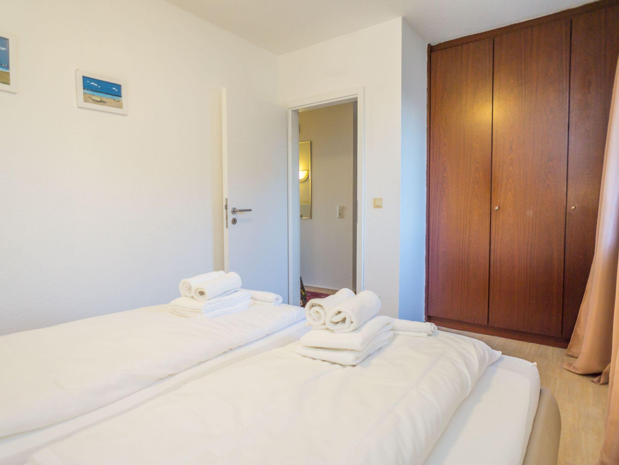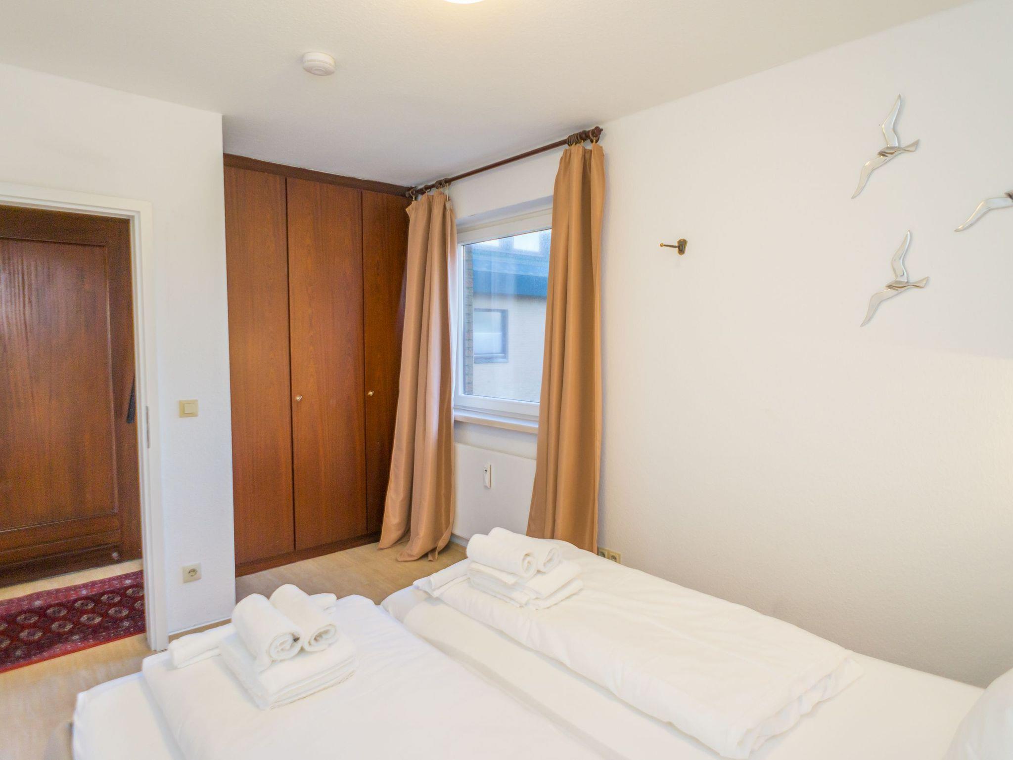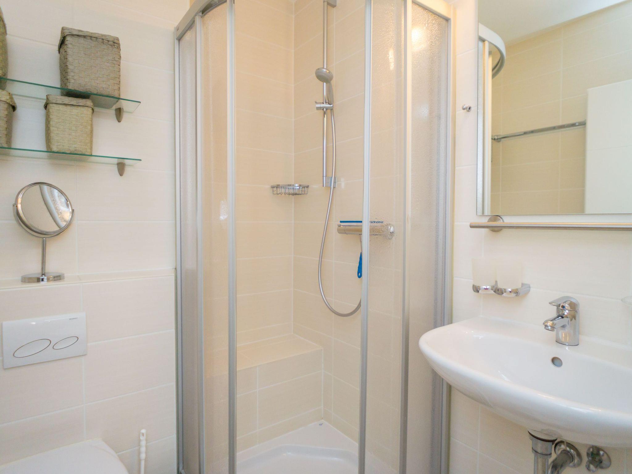 Die moderne Kochnische verfügt über eine Mikrowelle, einen Geschirrspüler, ein Cerankochfeld und hat ein Fenster. Kaffeemaschine, Wasserkocher und Toaster gehören selbstverständlich zur Grundausstattung. Das separate Schlafzimmer ist mit einem feststehenden Doppelbett ausgestattet, das aus zwei Einzelmatratzen (86 x 200 cm) besteht. Das helle Duschbad/WC bietet eine Dusche, ein WC und einen Waschtisch.