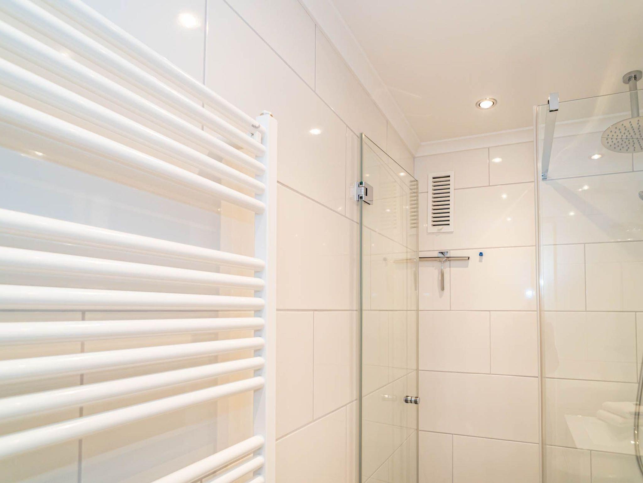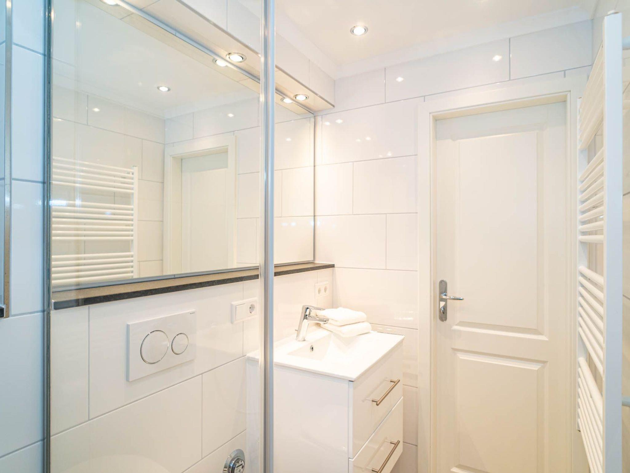 Das neue, moderne Badezimmer mit Dusche mit extraflachem Einstieg, Waschtisch, Handtuchtrockner und WC lässt Sie gut in den Tag starten.