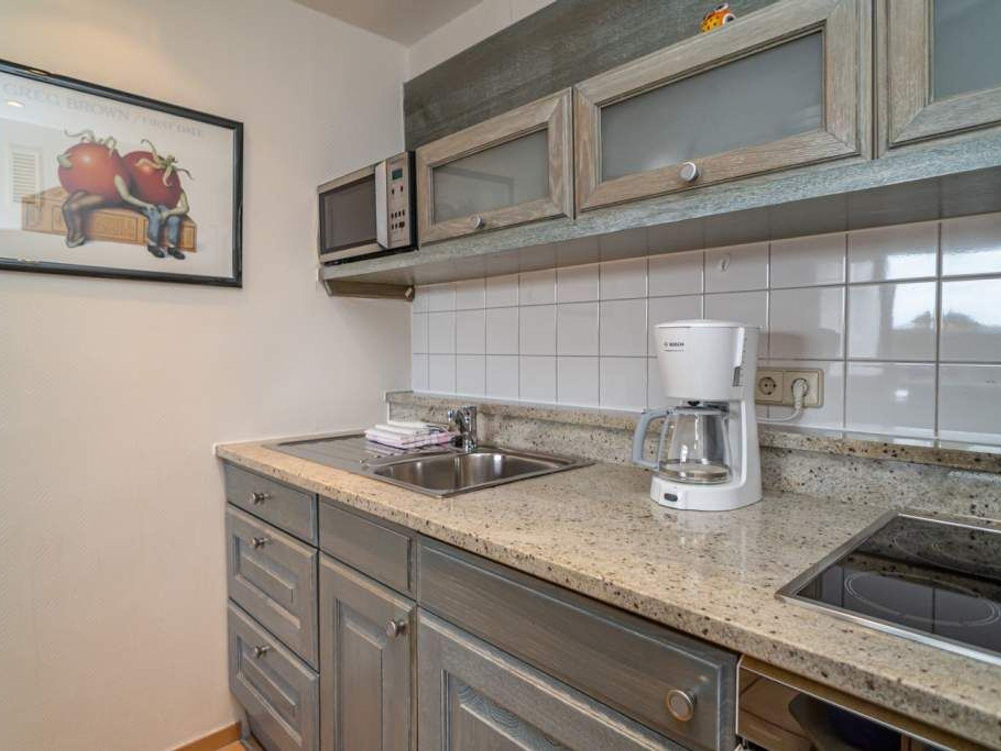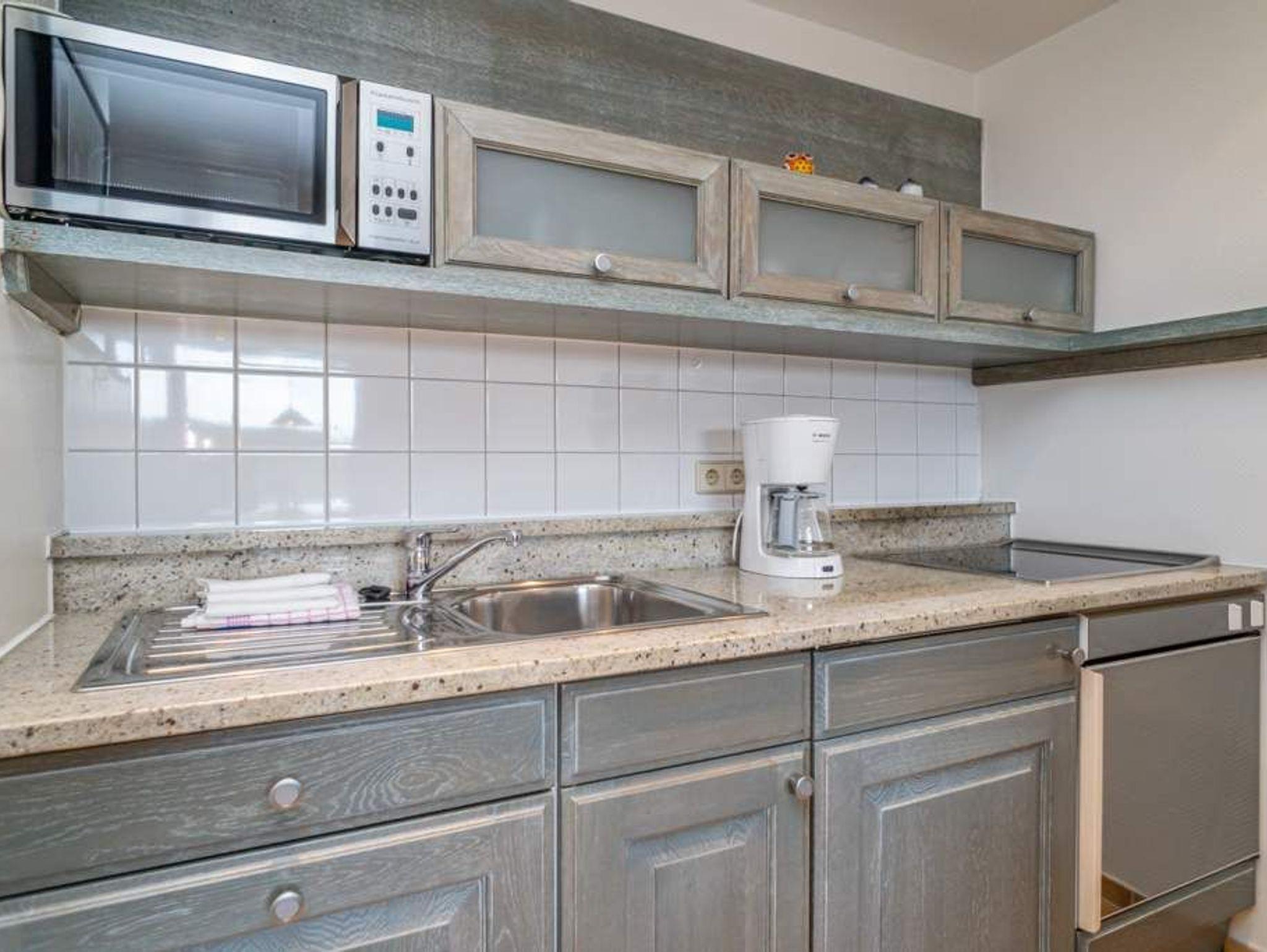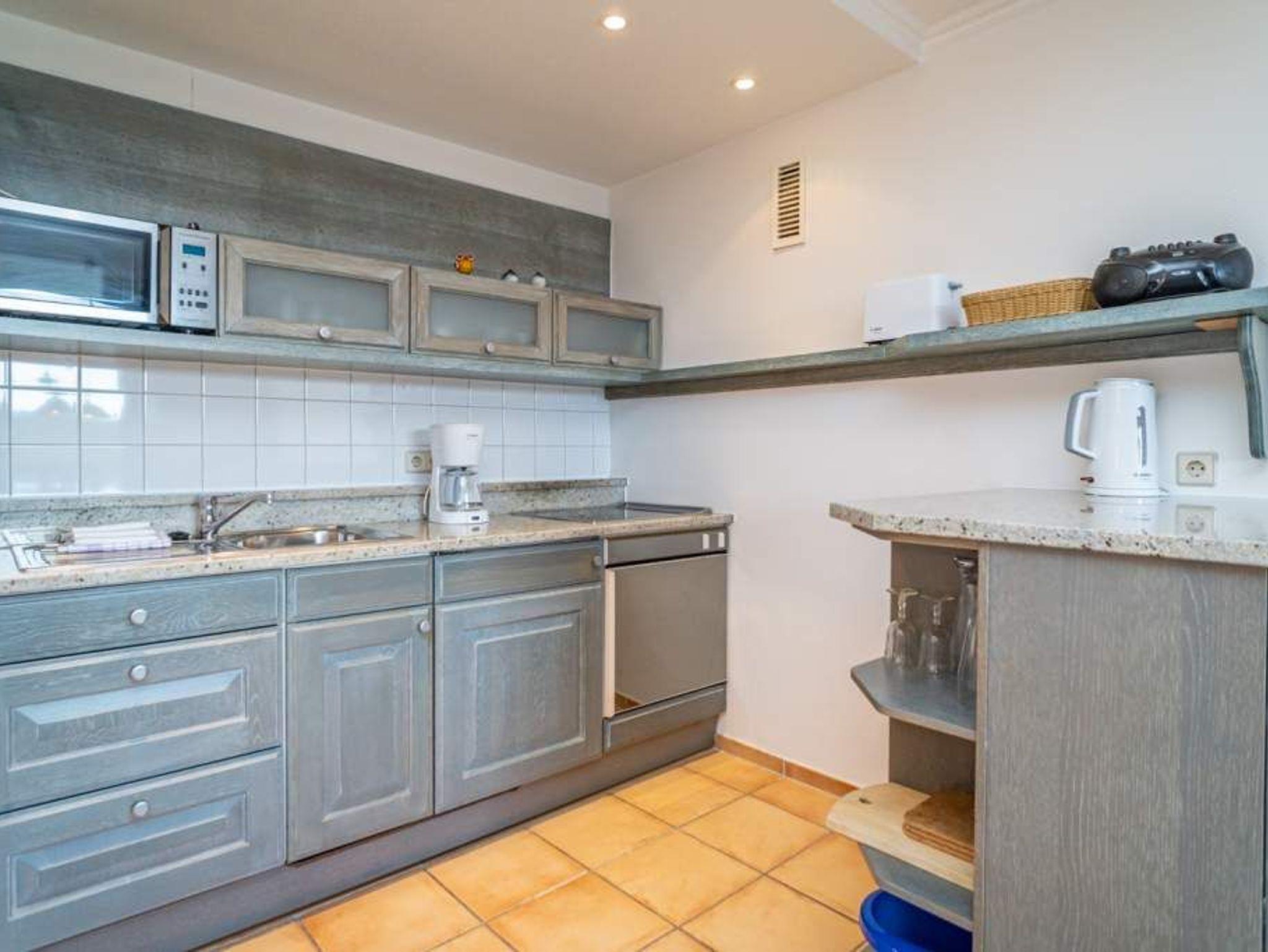 Die moderne, offene Einbauküche besitzt eine Mikrowelle, einen Herd mit Backofen und Ceran-Kochfeld sowie einen Kühlschrank mit 3*-Gefrierfach.