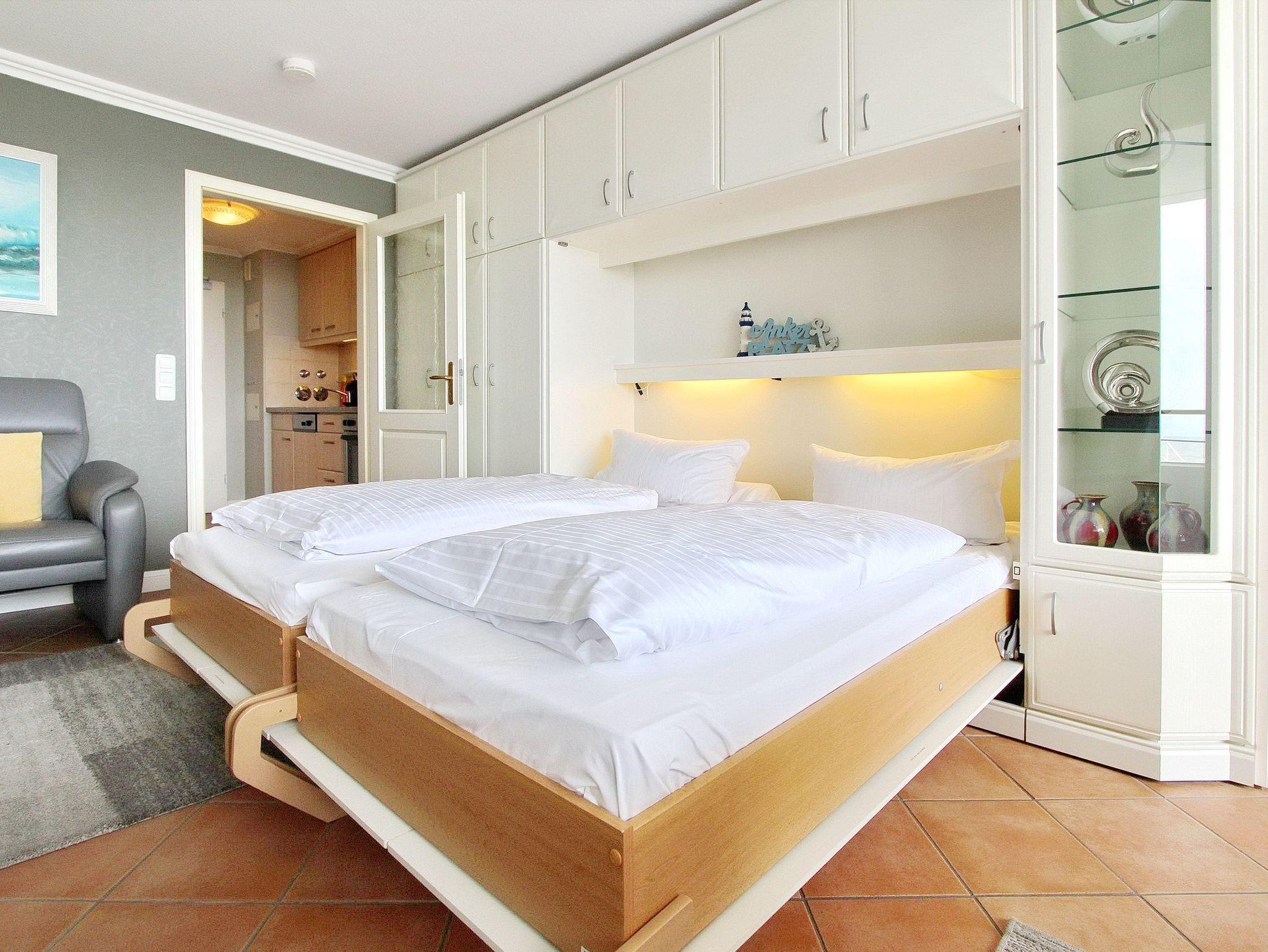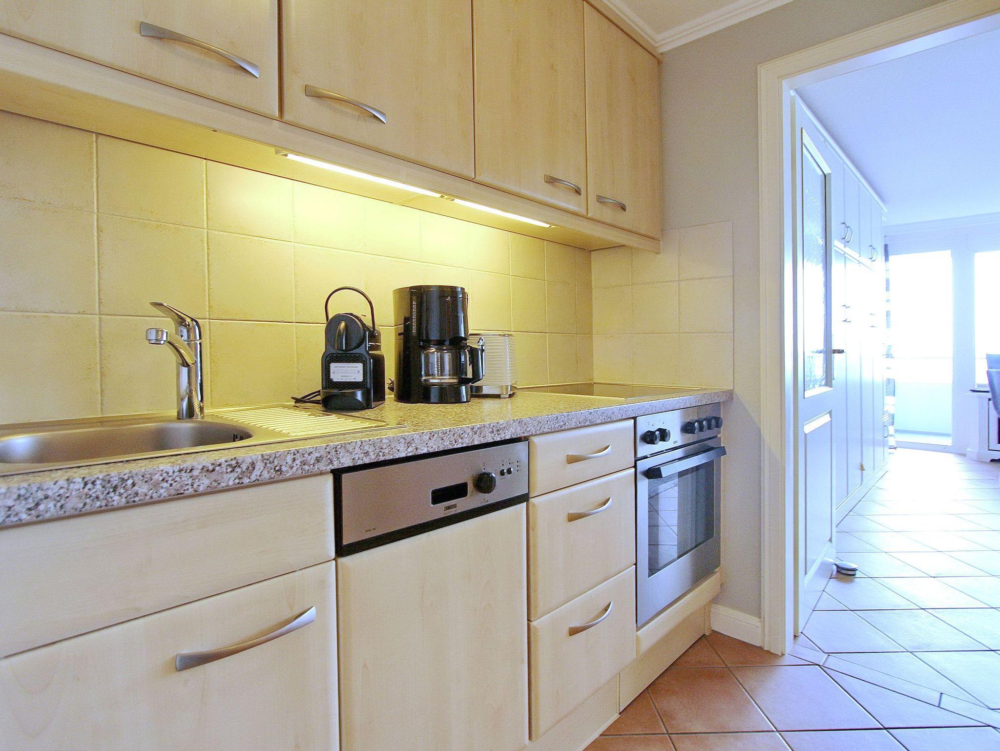 Mit viel Liebe zum Detail eingerichtete Wohnung in der 1. Etage im Haus am Meer mit Blick auf die Nordsee. Im gemütlichen Wohn-/Schlafraum gibt es Einzelschrankbetten, einen Essplatz am Fenster mit 2 Stühlen sowie eine Ledersitzgruppe mit Couch und Fernsehsessel. Vom Westbalkon aus können sie auf bequemen Balkonmöbeln mit passenden Sitzauflagen den Sonnenuntergang genießen. Ein Fernglas ermöglicht Ihnen den Blick in die Ferne. In der Wohnung wurde Fliesenboden verlegt. Das moderne Badezimmer hat eine Dusche mit flachem Einstieg und einen Handtuchtrockner. In der Küchenzeile im Flur mit Ceranfeld, Backofen und Geschirrspüler, können sie sich selbst verpflegen. Für besonderen Kaffeegenuss gibt es eine zusätzliche Nespressomaschine. Zur technischen Ausstattung dieser Nichtraucherwohnung gehört ein Flachbildfernseher, ein DVD Player und ein Radio mit CD Player. Ein kostenfreier WLAN Hot Spot (WEG Haus am Meer - Passwortfrei - ohne Gewähr) ist vorhanden. Diese Nichtraucherwohnung hat eine Größe von ca. 34 m².