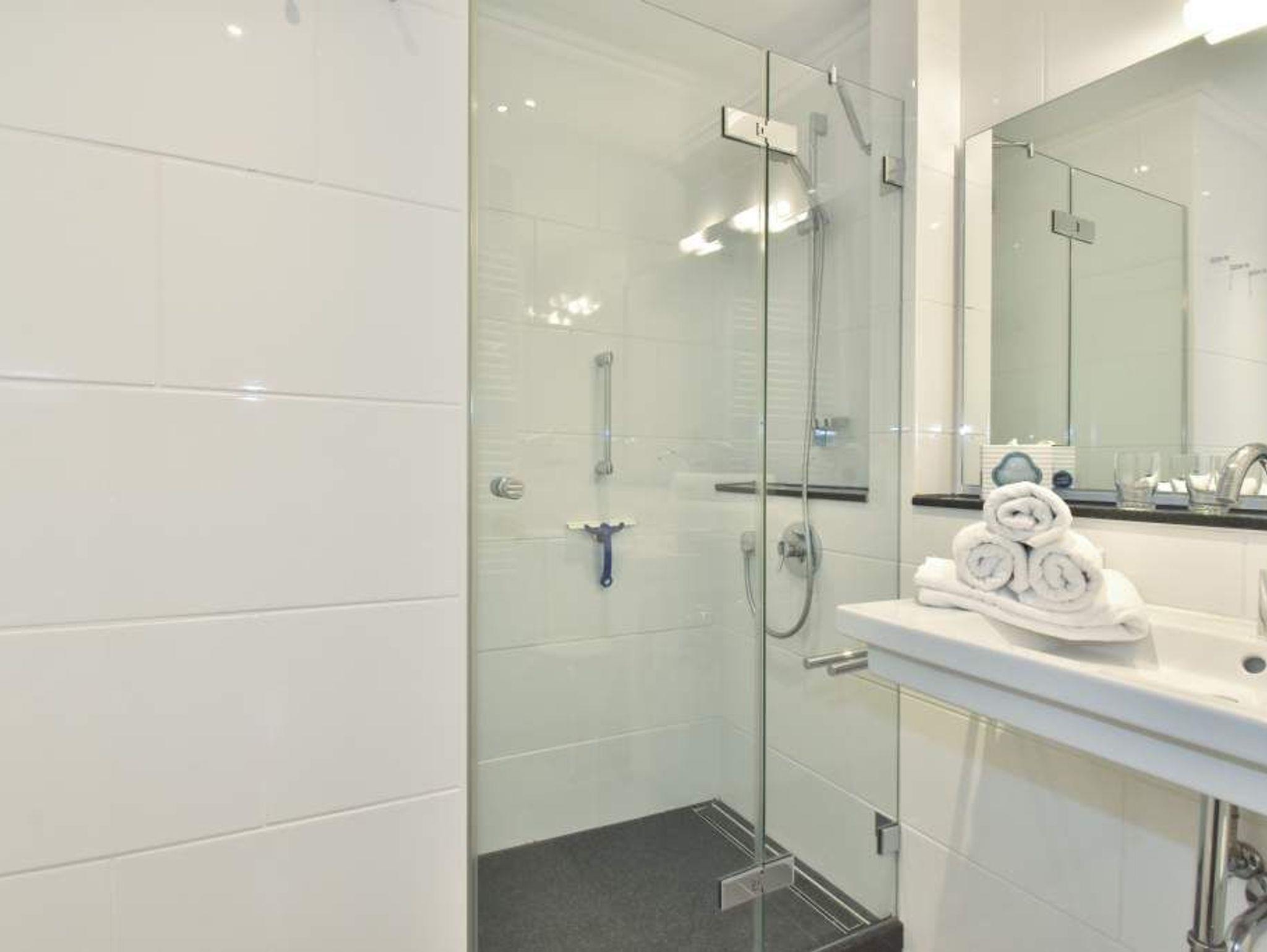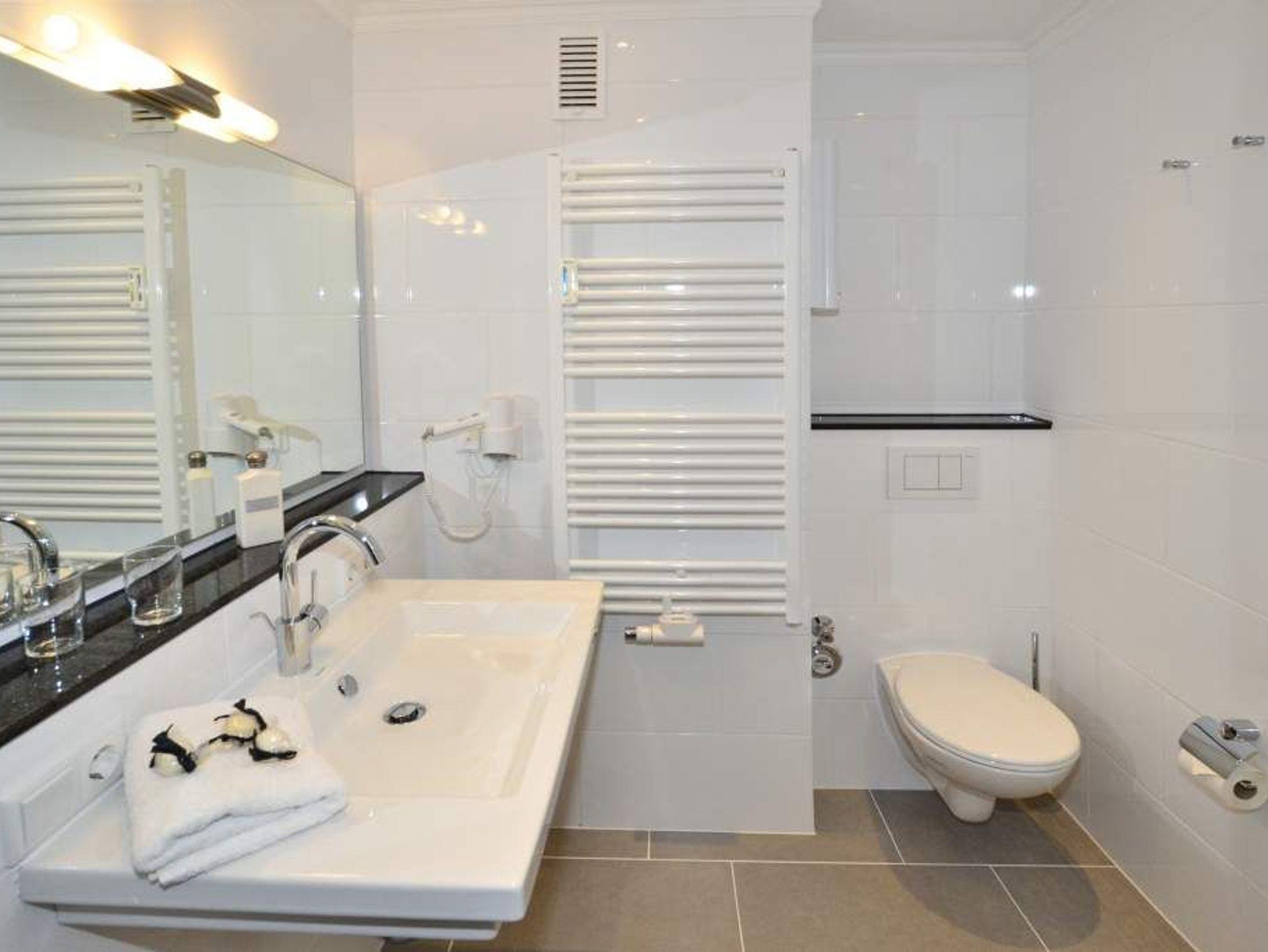 Im neuen, modernen Bad befinden sich eine Dusche mit besonders flachem Einstieg, ein WC, ein Waschtisch, ein Handtuchtrockner und ein Fön.