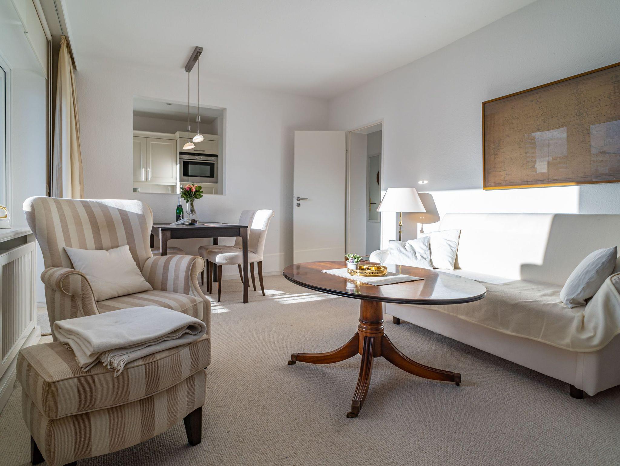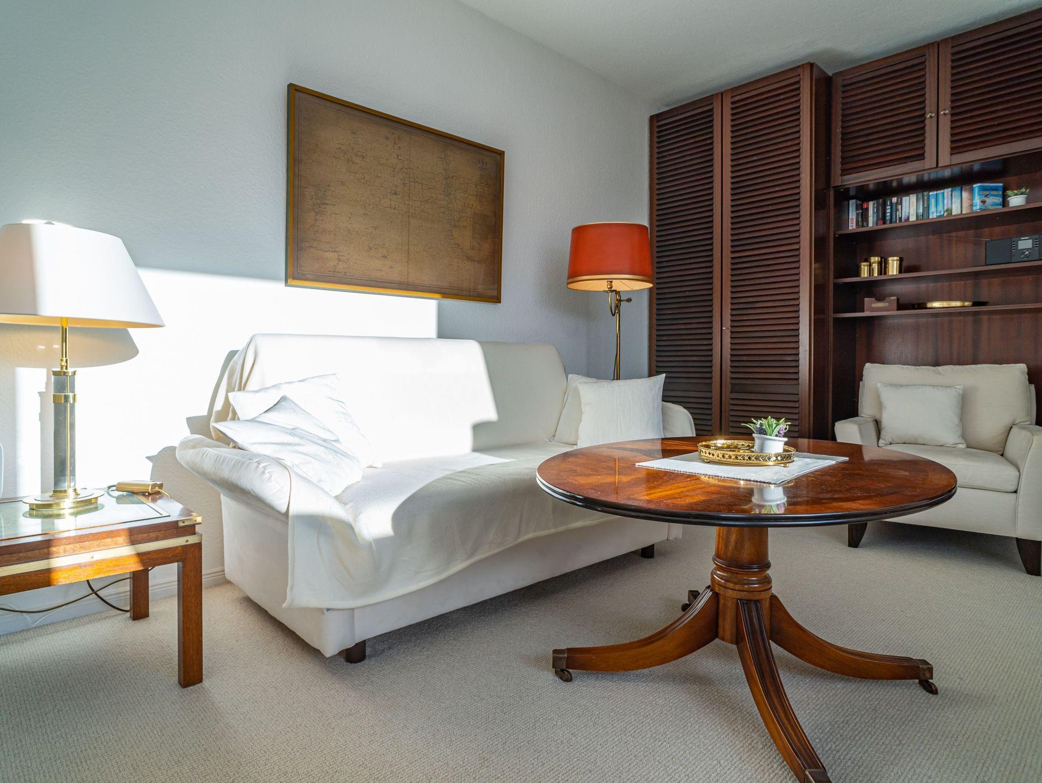 Das gut ausgestattete Wohnzimmer mit Austritt zur Südloggia hat eine bequeme Sitzecke, einen separaten Essplatz, einen Flachbild-TV.