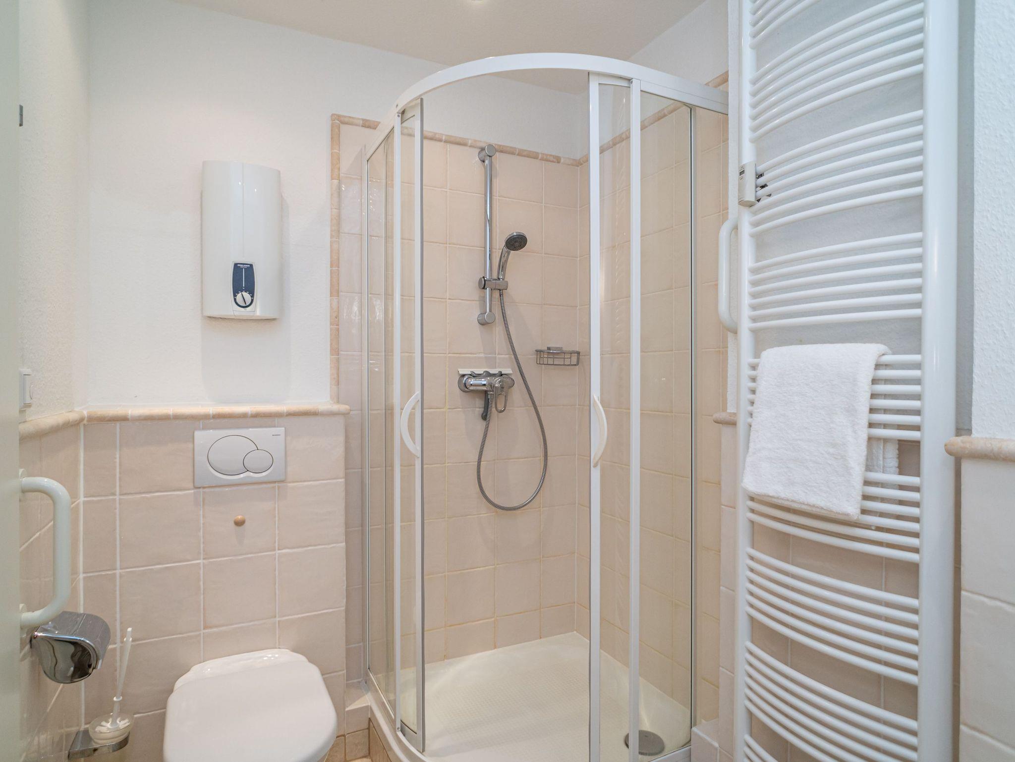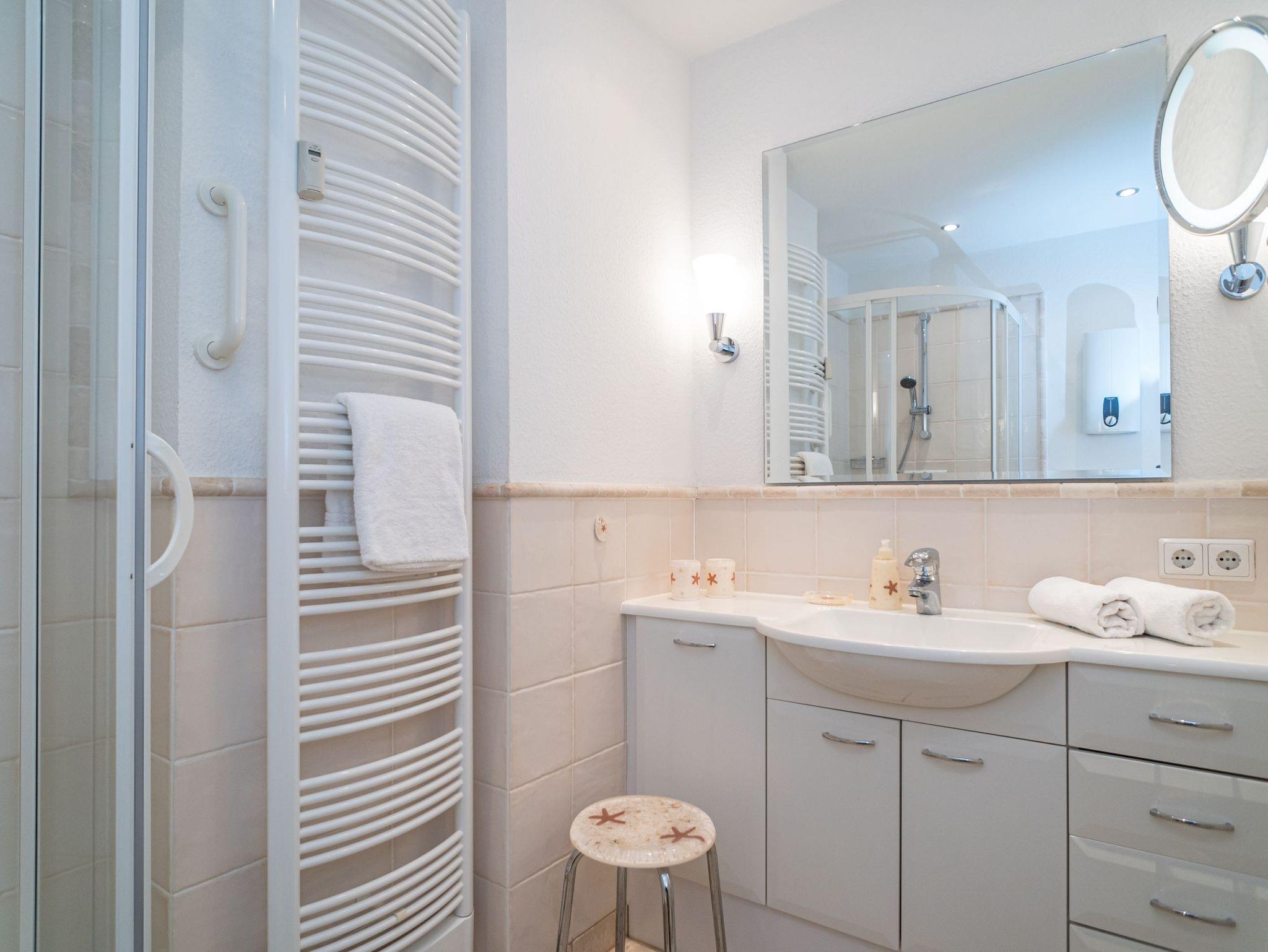Das Bad/WC hat eine Dusche, einen Waschtisch und einen Handtuchtrockner.