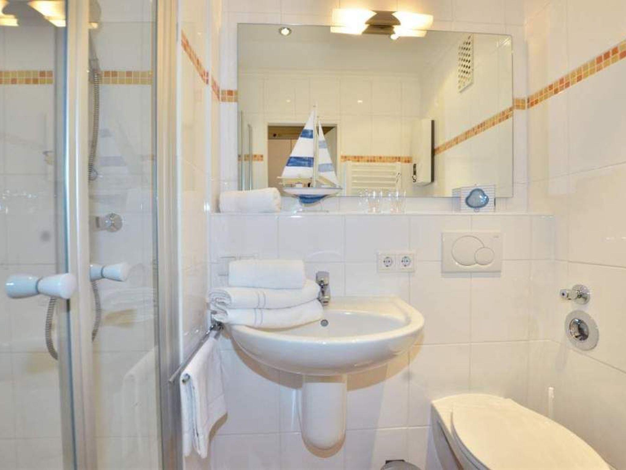 Im Bad befinden sich eine Dusche, ein WC, ein Waschtisch und ein kleiner Handtuchtrockner.