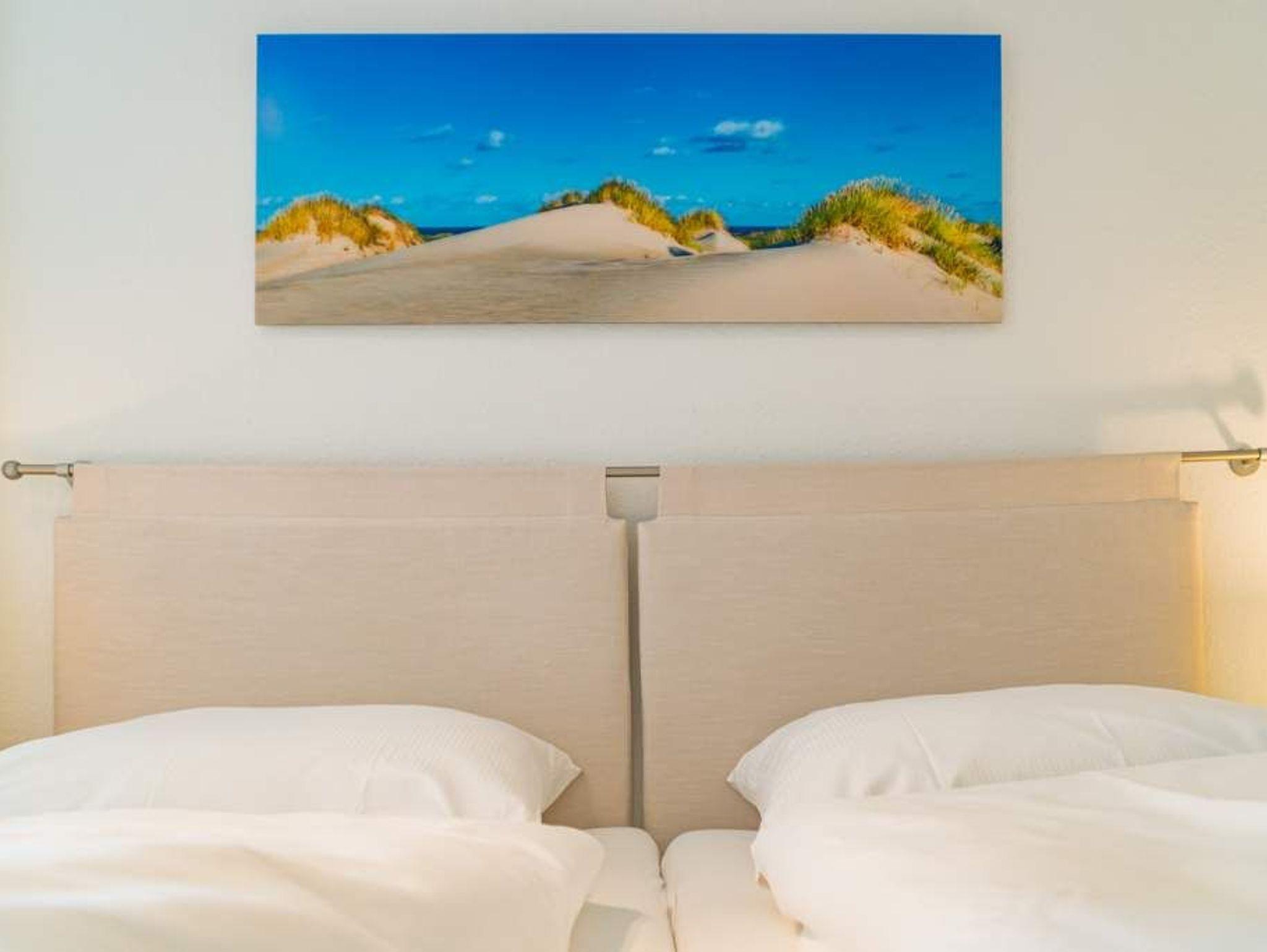 Das separate Schlafzimmer mit kleinem Meerblick nach Nordwesten bietet ein bequemes Doppelbett (Liegefläche 1,80 x 2,00 mit 2 Einzelmatratzen, Einstieg nur von einer Seite aus möglich) für guten Schlafkomfort.