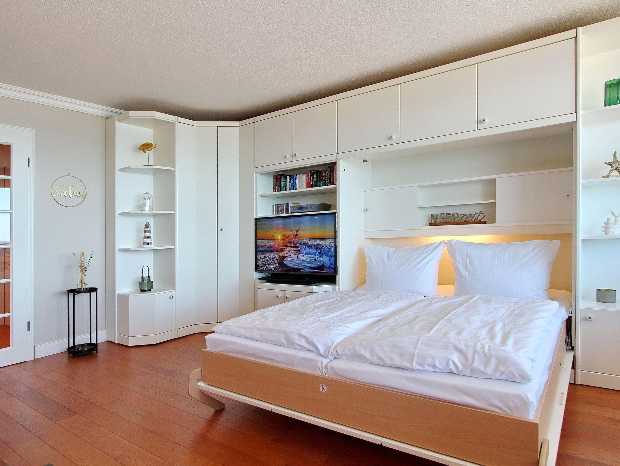 Diese Wohnung in der 5. Etage im Haus Metropol zur Seeseite hat einen herrlichen Blick über den Strand und die Nordsee. Sie ist hell und freundlich eingerichtet und hat einen vorgelagerten Westbalkon mit Balkonmöbel mit Sitzauflagen. Der kombinierte Wohn-Schlafraum verfügt über Laminatfußboden, ein Doppelschrankbett einen Essplatz am Fenster mit 2 Rattanstühlen und eine Sitzgruppe mit Fernsehsessel und Fußhocker. Im Badezimmer gibt es eine Dusche, einen beheizten Handtuchhalter, Duschhocker, einen mobilen Haltegriff für die Dusche und einen Fön. In der Einbauküche im Flur mit Ceranfeld, Geschirrspüler und Mikrowelle können sie bequem kleine Mahlzeiten zubereiten. Zur technischen Ausstattung dieser Wohnung gehört: ein Flachbildfernseher, eine Bluetoothanlage mit CD Player und Radio von Sony. Ein freies WLAN Netzwerk (WEG Haus Metropol - Passwortfrei - ohne Gewähr) steht ihnen kostenfrei zur Verfügung. Diese Nichtraucherwohnung hat eine Größe von ca. 42 m².