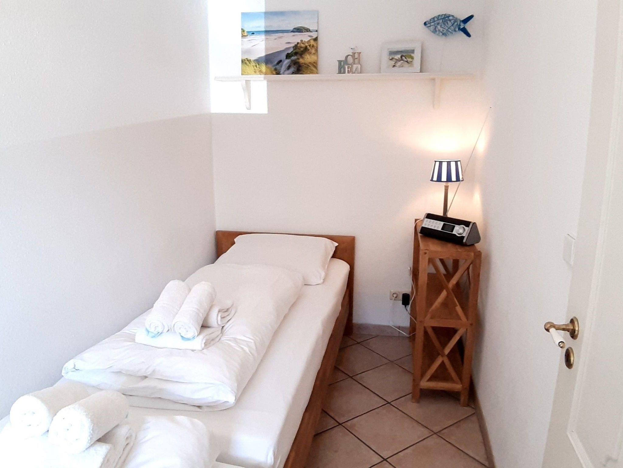Das Schlafzimmer dient mit zwei hintereinanderstehenden Betten (90x190cm) und einer kleinen Kommode zu Ihrem allgemeinen Wohlbefinden. Bettwäsche und Handtücher sind im Endpreis enthalten.