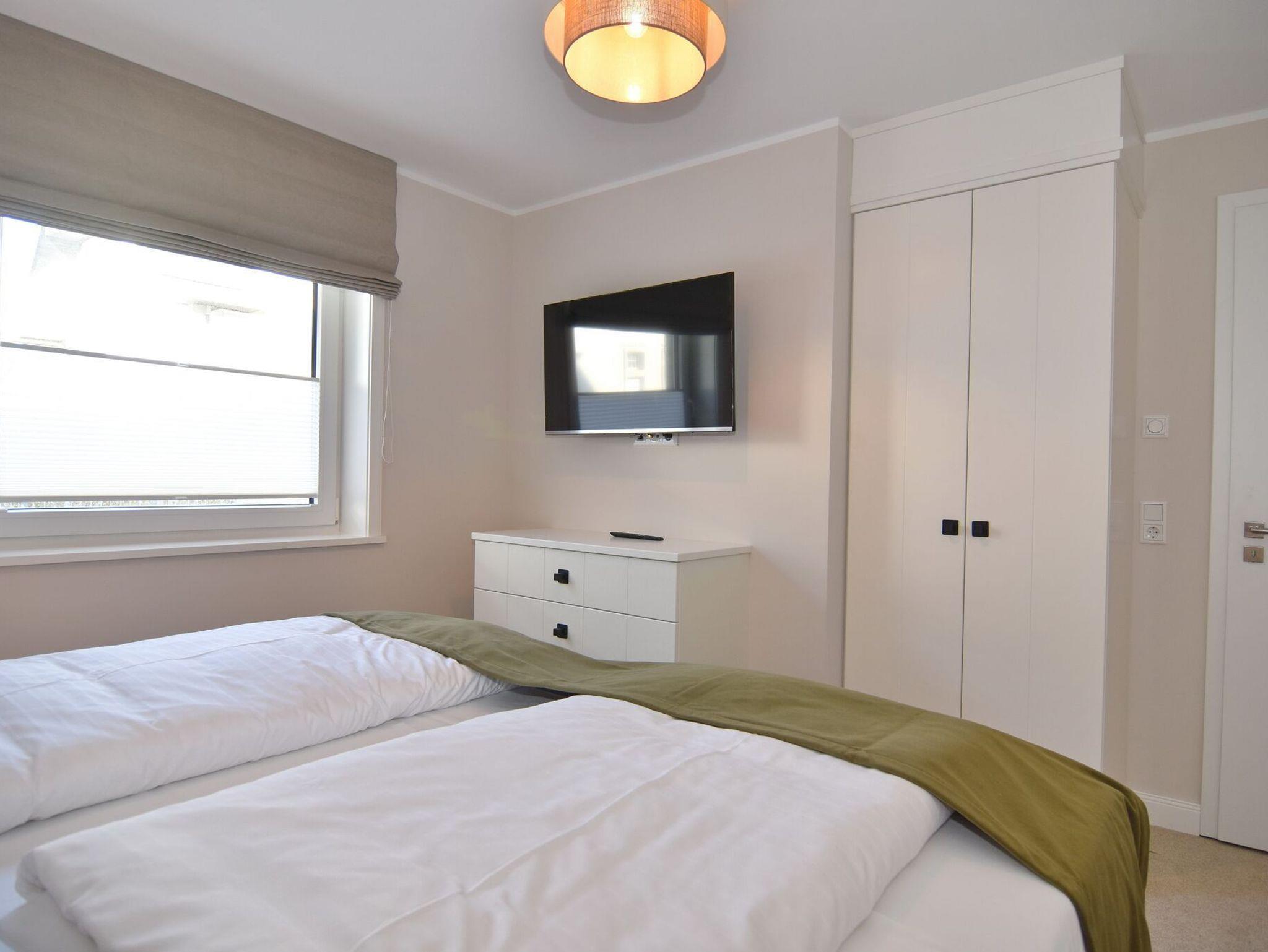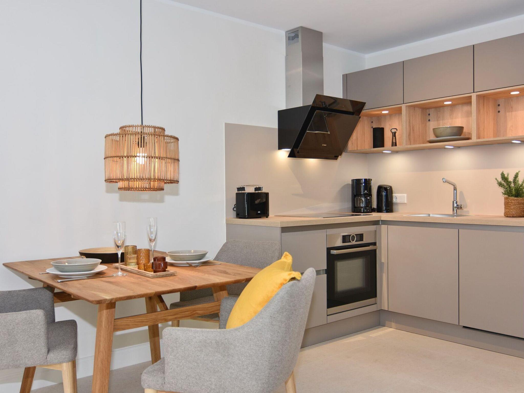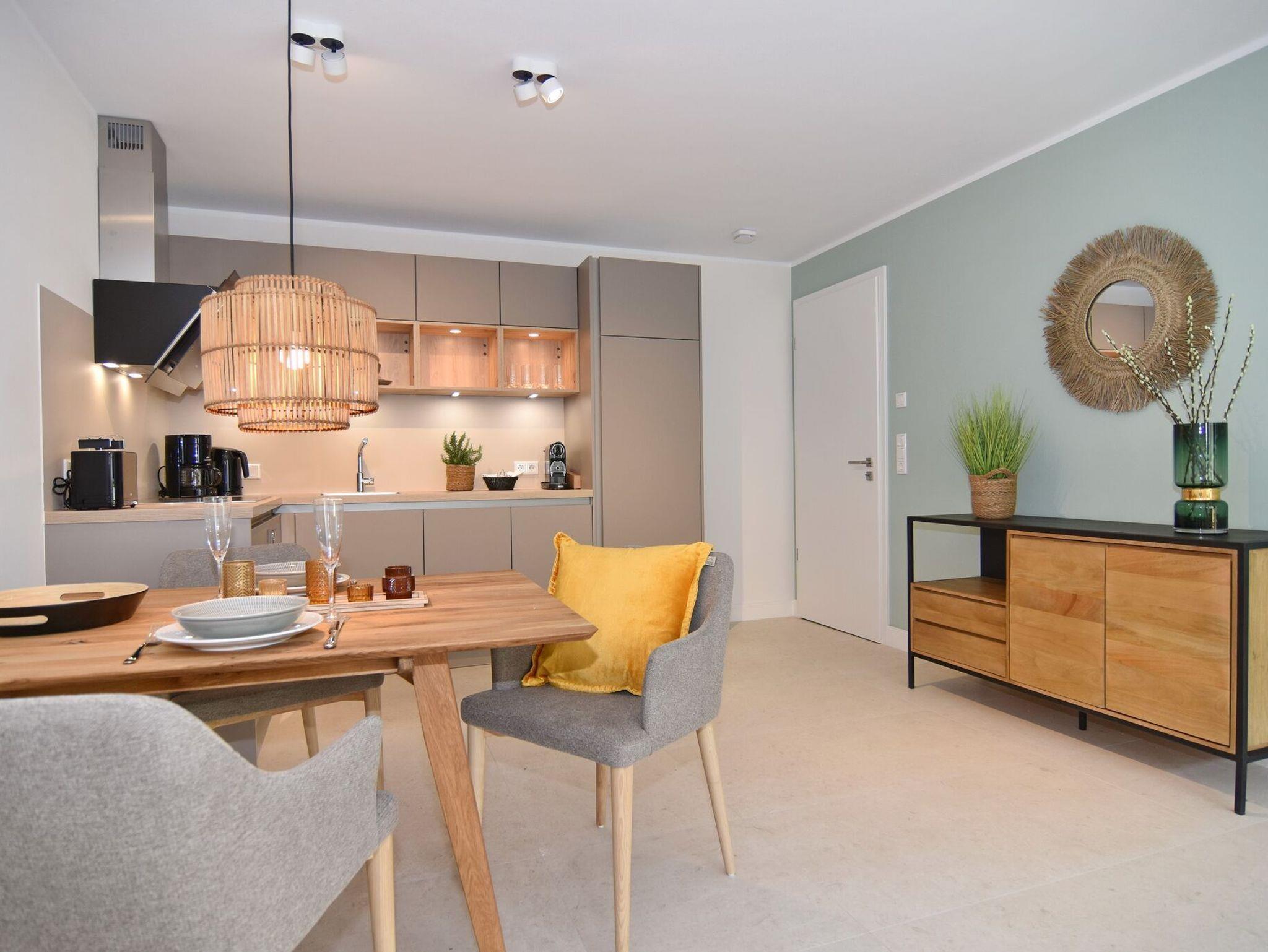 Die hochwertige 3-Zimmer-Erdgeschosswohnung mit ca. 60 qm ist für maximal 3 Personen ausgestattet. Vom geräumigen Flur mit Garderobe gelangen Sie in das Wohnzimmer mit offener Küche und möblierter Südterrasse. Die hochwertige Küche bietet neben Induktionsherd auch Geschirrspüler, Kühlschrank mit Gefrierfach und Backofen mit integrierter Mikrowelle. Die Wohnung bietet Ihnen zwei Schlafräume und ein Duschbad /WC mit Haar- und Handtuchtrockner. Das große Schlafzimmer ist mit einem Boxspringbett (200x200) der Marke FBF, Flat-TV und Einbauschrank ausgestattet (1 Kinderbett zubuchbar), das kleine Schlafzimmer hat ein vom Tischler eingebautes Einzelbett (90x200) und einen kleinen Einbauschrank.