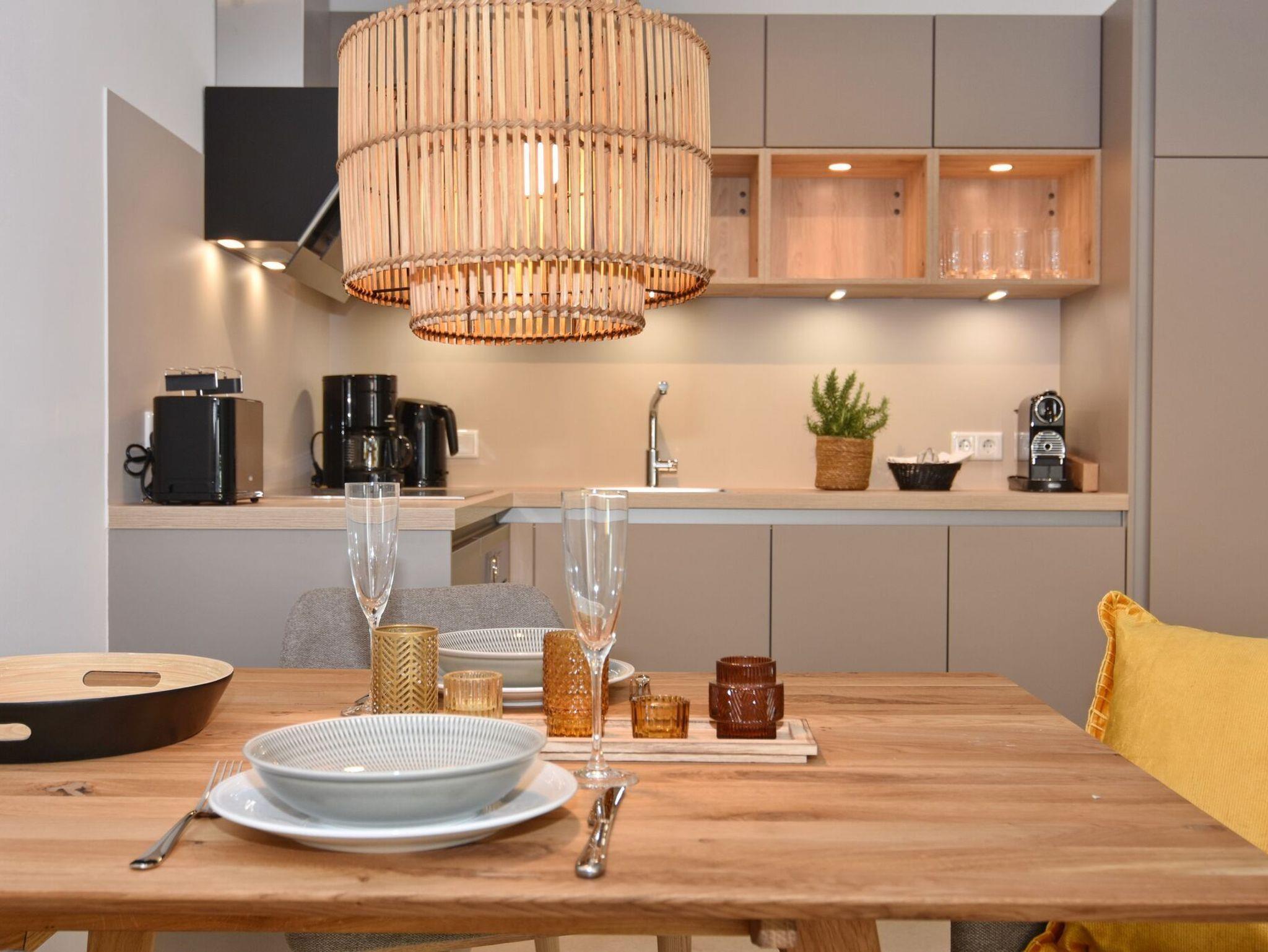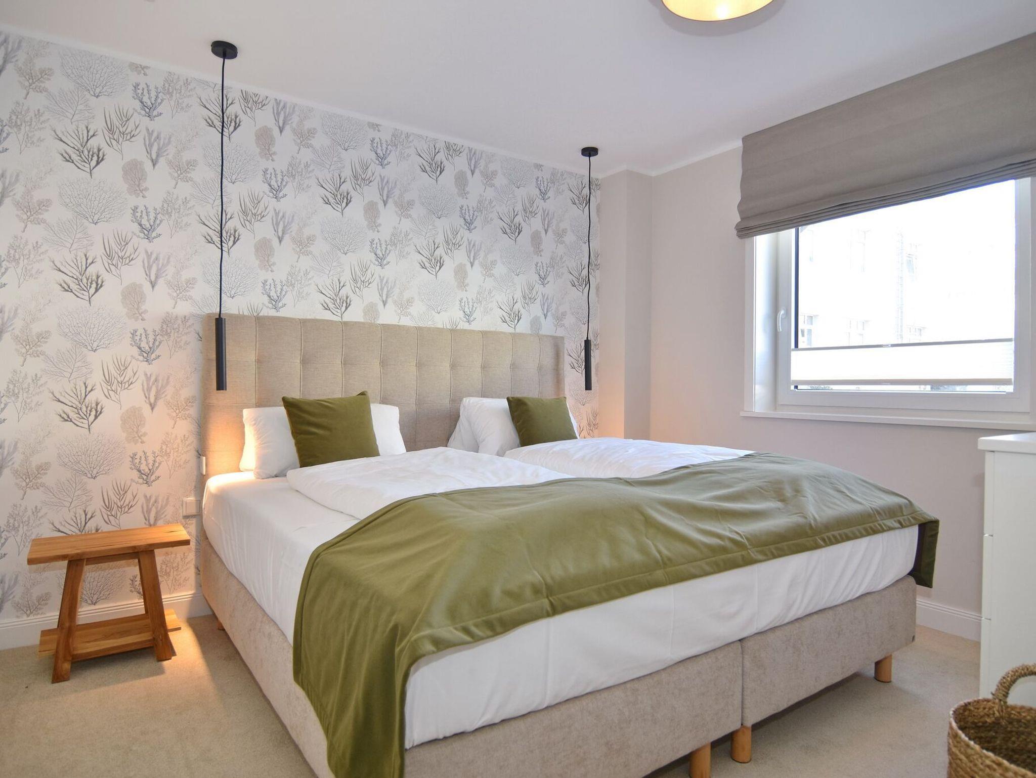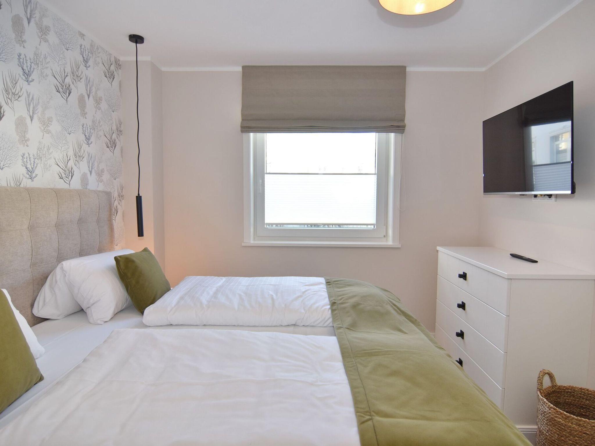 Die hochwertige 3-Zimmer-Erdgeschosswohnung mit ca. 60 qm ist für maximal 3 Personen ausgestattet. Vom geräumigen Flur mit Garderobe gelangen Sie in das Wohnzimmer mit offener Küche und möblierter Südterrasse. Die hochwertige Küche bietet neben Induktionsherd auch Geschirrspüler, Kühlschrank mit Gefrierfach und Backofen mit integrierter Mikrowelle. Die Wohnung bietet Ihnen zwei Schlafräume und ein Duschbad /WC mit Haar- und Handtuchtrockner. Das große Schlafzimmer ist mit einem Boxspringbett (200x200) der Marke FBF, Flat-TV und Einbauschrank ausgestattet (1 Kinderbett zubuchbar), das kleine Schlafzimmer hat ein vom Tischler eingebautes Einzelbett (90x200) und einen kleinen Einbauschrank.