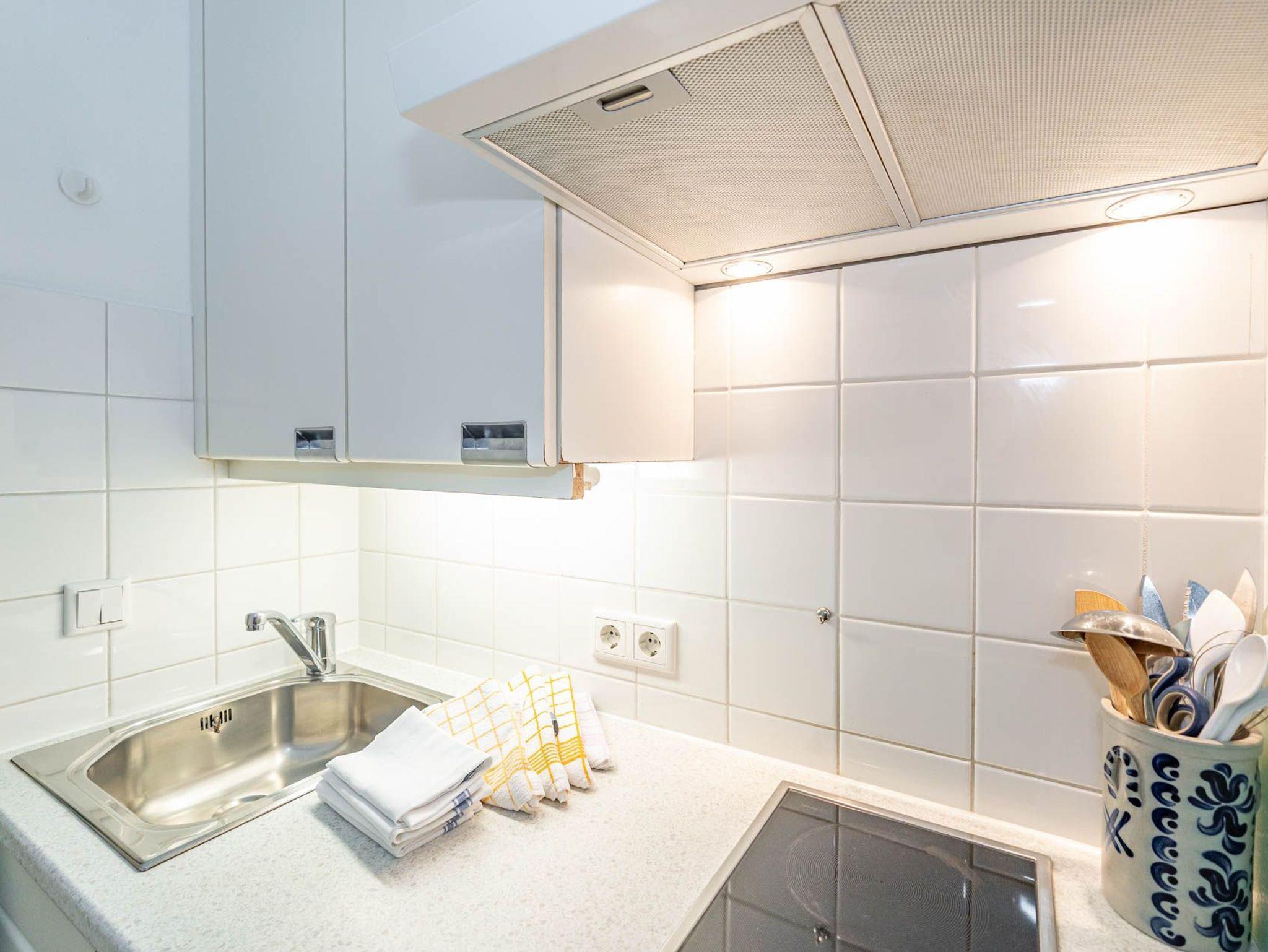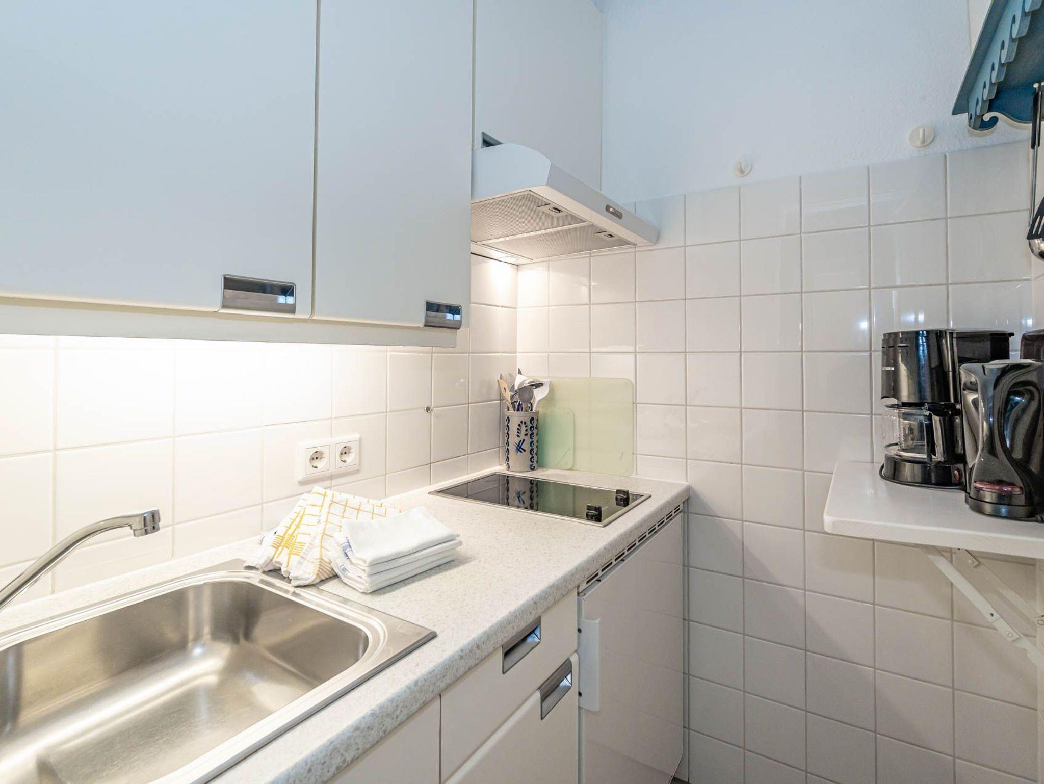 Die Küchenzeile hat ein 2-Platten-Ceranfeld und einen Kühlschrank mit 3-Sterne-Gefrierfach.