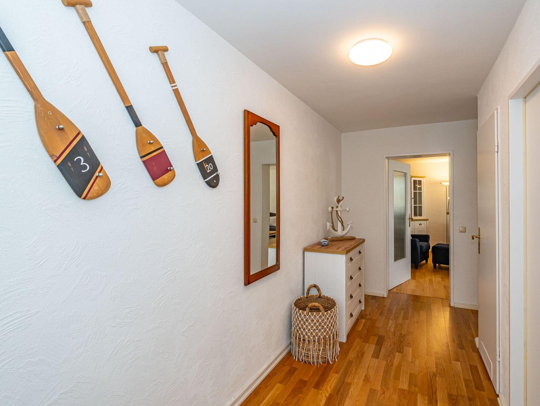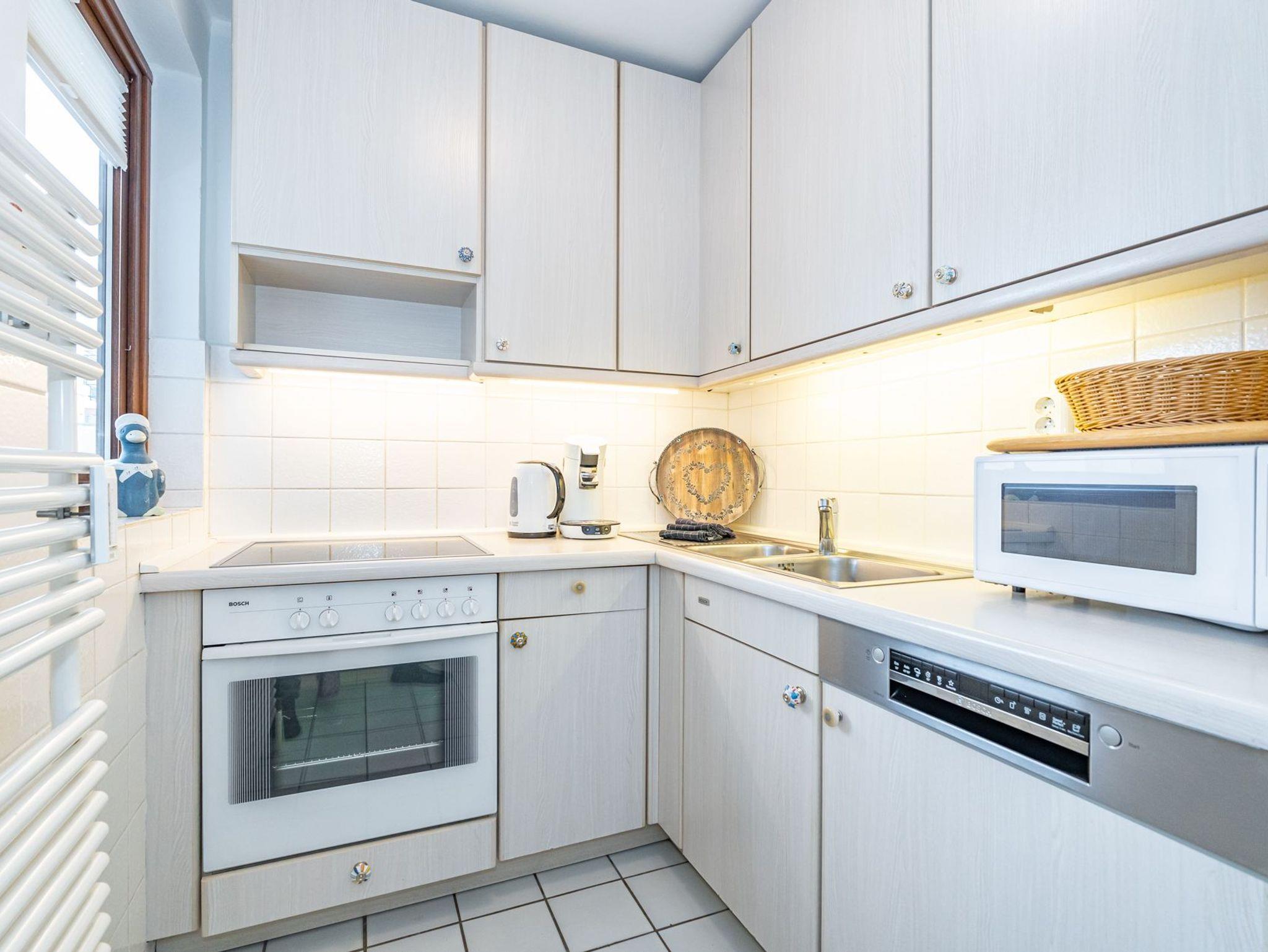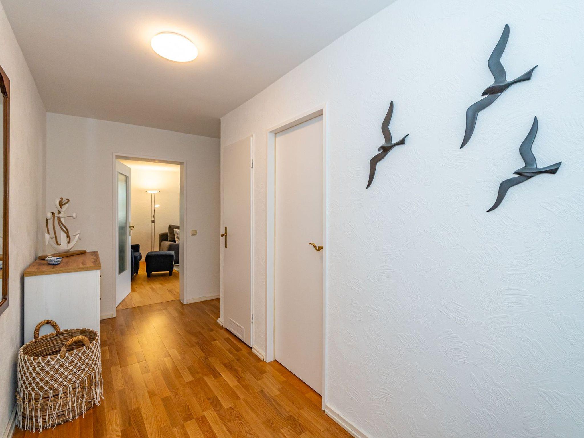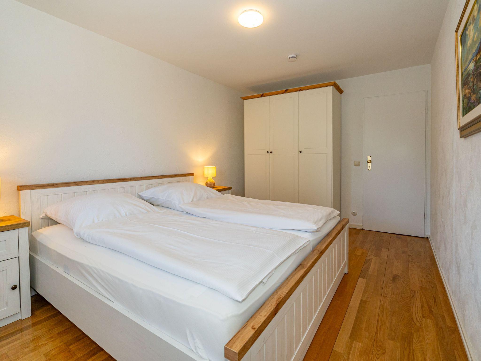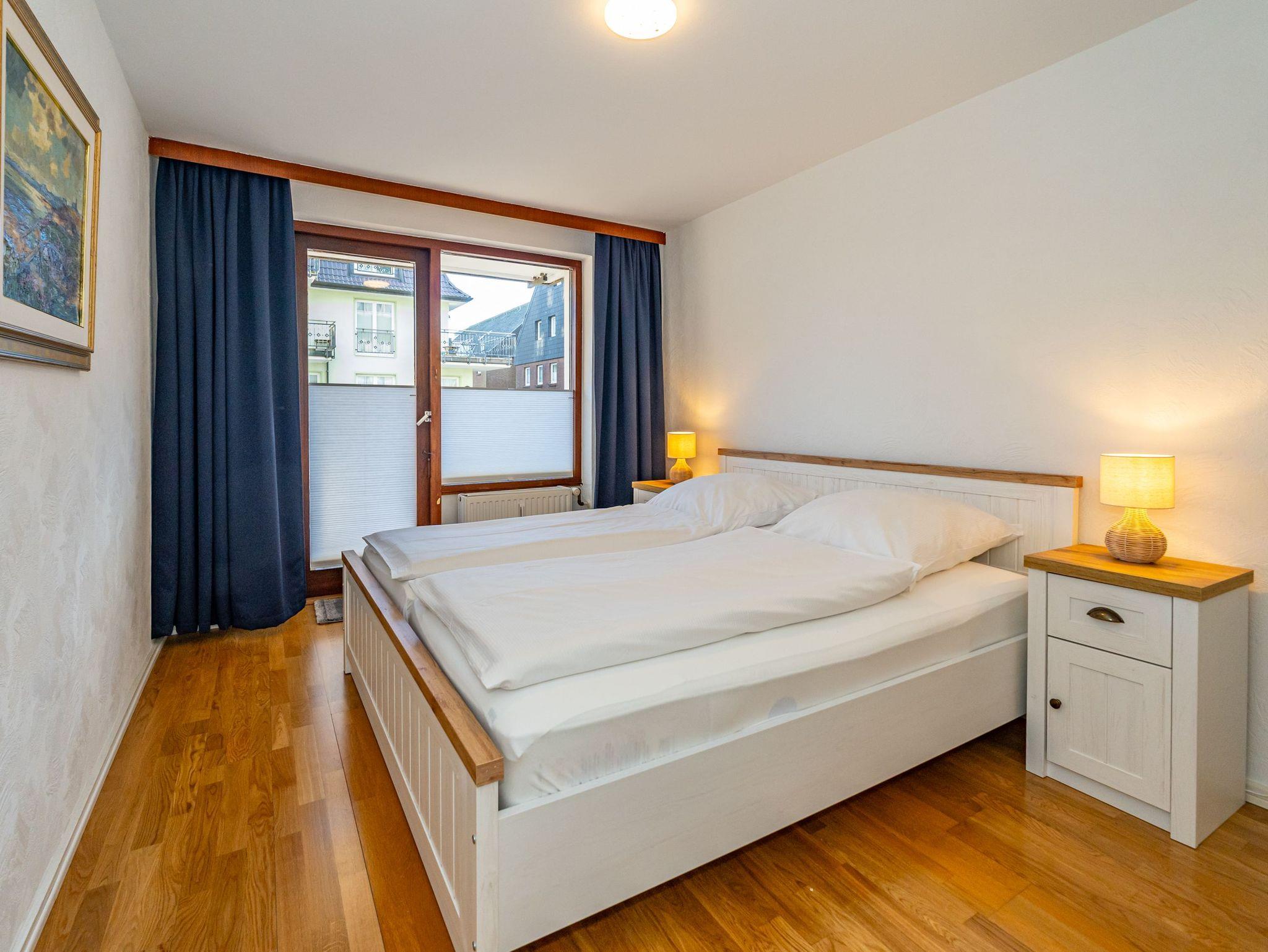 Komfortable Ferienwohnung, ca. 56 qm im Hochparterre zur Landseite mit Ostloggia (Morgensonne, mit Balkonmöbeln und Auflagen) für max. 3 Personen. Von der großzügigen Diele aus gelangt man in das Wohnzimmer, das Schlafzimmer und das neuwertige Duschbad/WC. Der Wohnraum besteht aus einer Sitzgarnitur (3-Sitzer-Schlafcouch, Liegefläche ca. 1,40 x 2,00 m, einem bequemen Ohrensessel mit Fußhocker), einem Essplatz direkt am Fenster, Kabel-TV, Stereoanlage mit Radio, WLAN und Zugang zur Ostloggia. Die Einbauküche mit Fenster ist mit Cerankochfeld (4 Felder), Geschirrspüler, Backofen, Mikrowelle, Kühlschrank mit Gefrierfach und Senseo-Kaffeemaschine ausgestattet. Eine Filterkaffeemaschine, Wasserkocher und Toaster gehören zur Grundausstattung. Das separate Schlafzimmer hat ein Doppelbett (1,80 x 2,00 m, mit guten Einzelmatratzen), 2 Nachttische und einen Kleiderschrank mit Zugang zum zweiten Balkon. Im Bad befinden sich eine großzügige Dusche mit extraflachem Einstieg, ein Waschtisch, Handtuchtrockner, Fön, Kosmetikspiegel und WC. An Extras stehen ein Bügelbrett und Bügeleisen zur Verfügung.