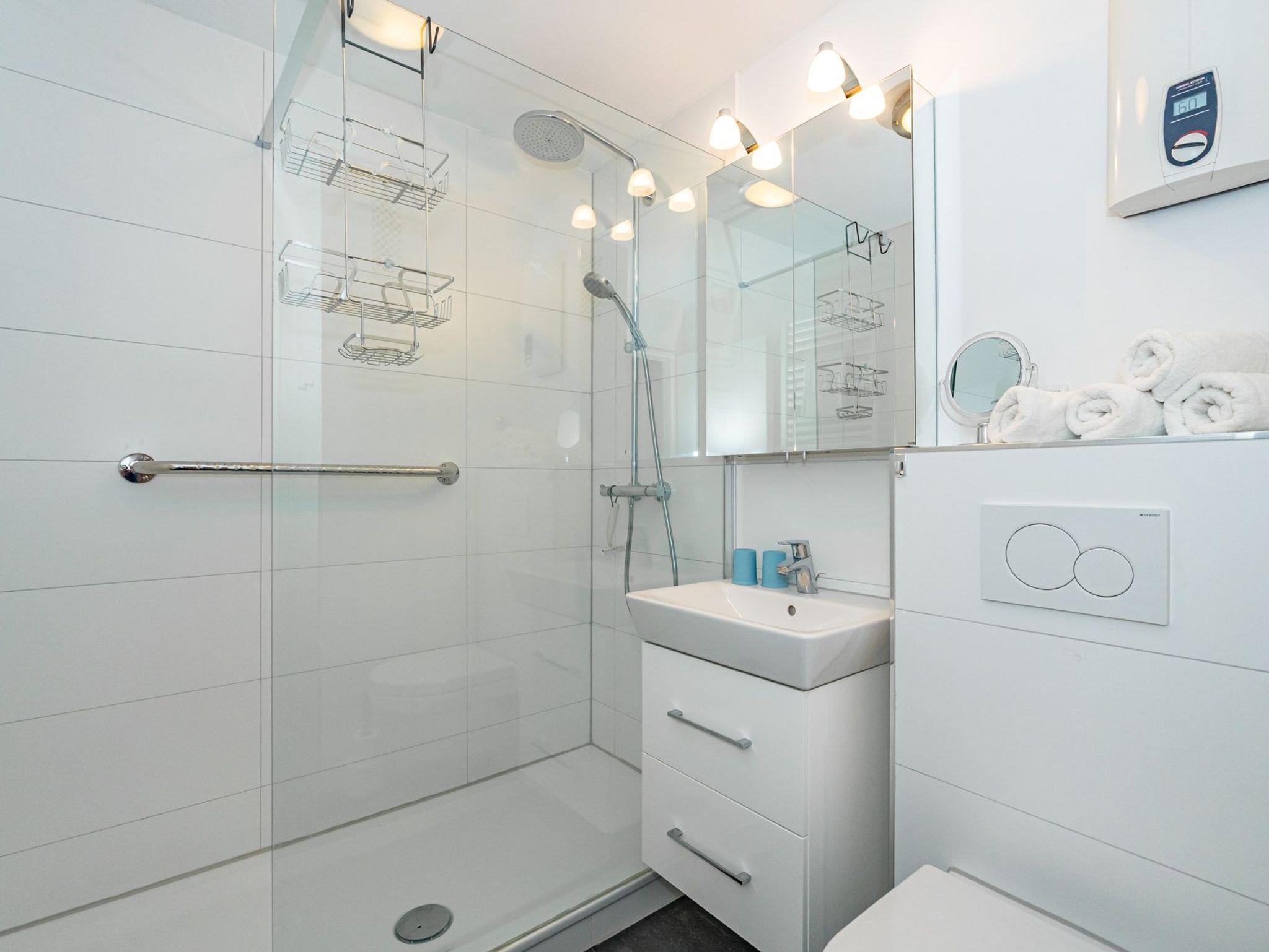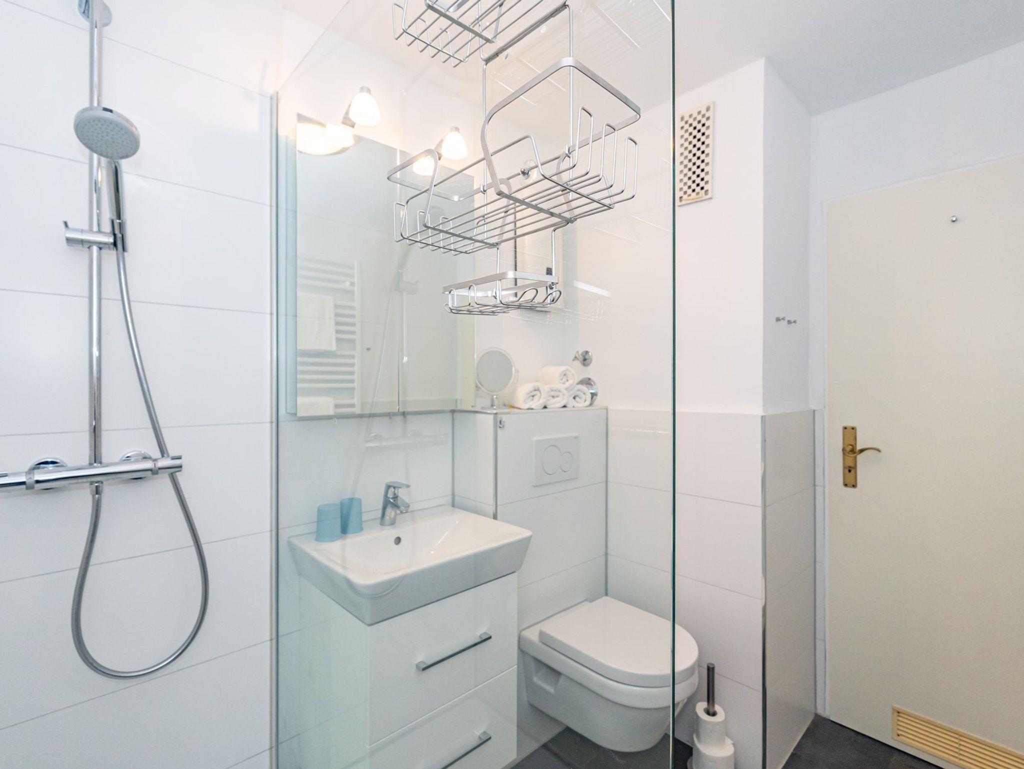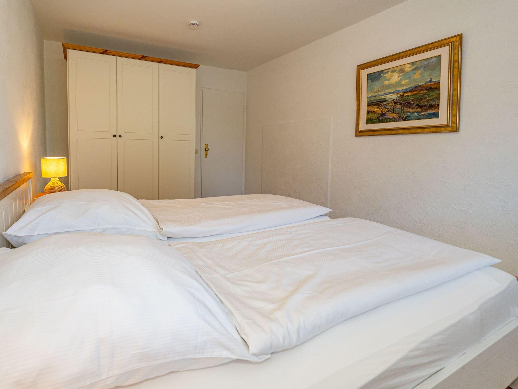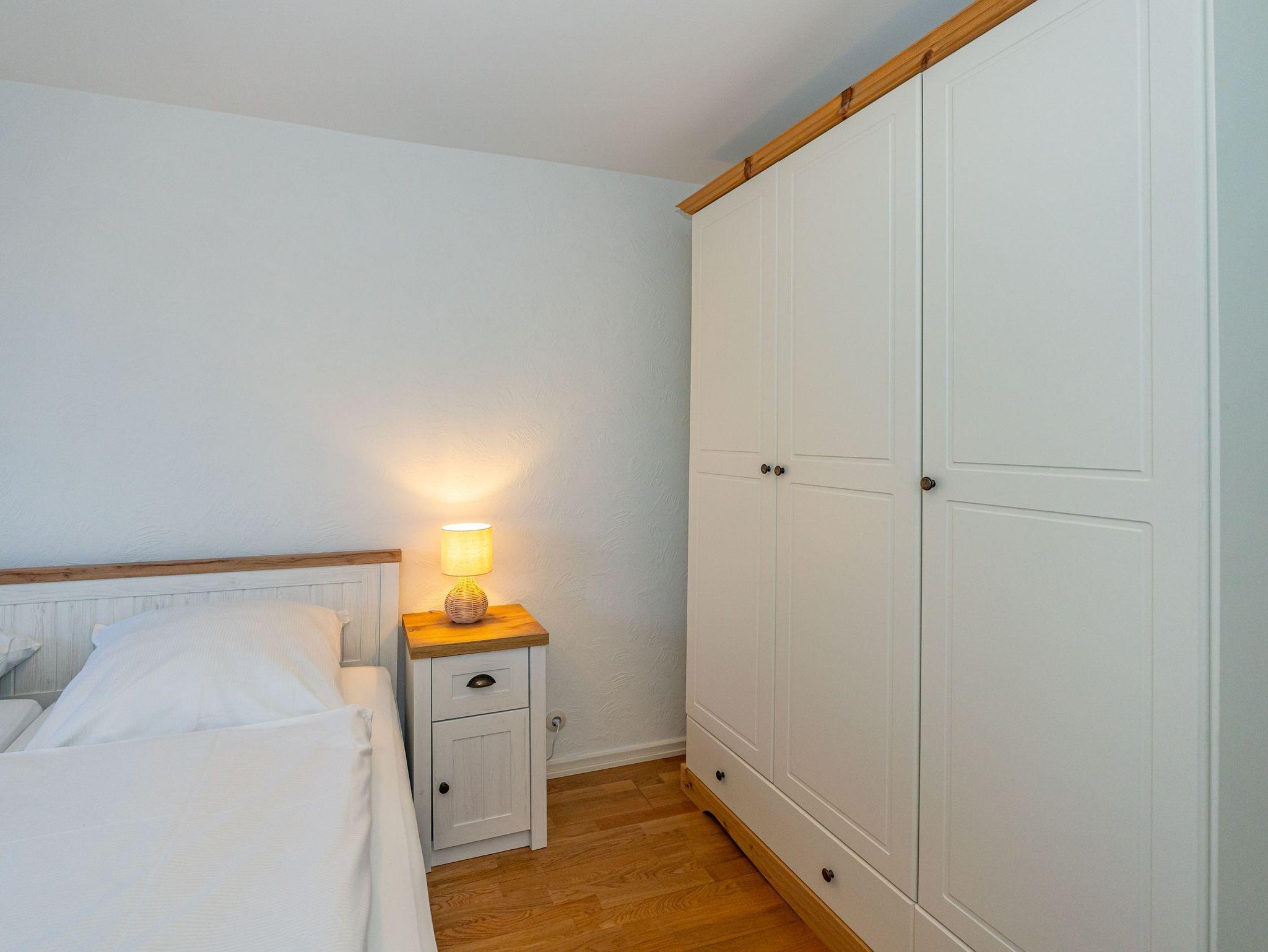 Komfortable Ferienwohnung, ca. 56 qm im Hochparterre zur Landseite mit Ostloggia (Morgensonne, mit Balkonmöbeln und Auflagen) für max. 3 Personen. Von der großzügigen Diele aus gelangt man in das Wohnzimmer, das Schlafzimmer und das neuwertige Duschbad/WC. Der Wohnraum besteht aus einer Sitzgarnitur (3-Sitzer-Schlafcouch, Liegefläche ca. 1,40 x 2,00 m, einem bequemen Ohrensessel mit Fußhocker), einem Essplatz direkt am Fenster, Kabel-TV, Stereoanlage mit Radio, WLAN und Zugang zur Ostloggia. Die Einbauküche mit Fenster ist mit Cerankochfeld (4 Felder), Geschirrspüler, Backofen, Mikrowelle, Kühlschrank mit Gefrierfach und Senseo-Kaffeemaschine ausgestattet. Eine Filterkaffeemaschine, Wasserkocher und Toaster gehören zur Grundausstattung. Das separate Schlafzimmer hat ein Doppelbett (1,80 x 2,00 m, mit guten Einzelmatratzen), 2 Nachttische und einen Kleiderschrank mit Zugang zum zweiten Balkon. Im Bad befinden sich eine großzügige Dusche mit extraflachem Einstieg, ein Waschtisch, Handtuchtrockner, Fön, Kosmetikspiegel und WC. An Extras stehen ein Bügelbrett und Bügeleisen zur Verfügung.