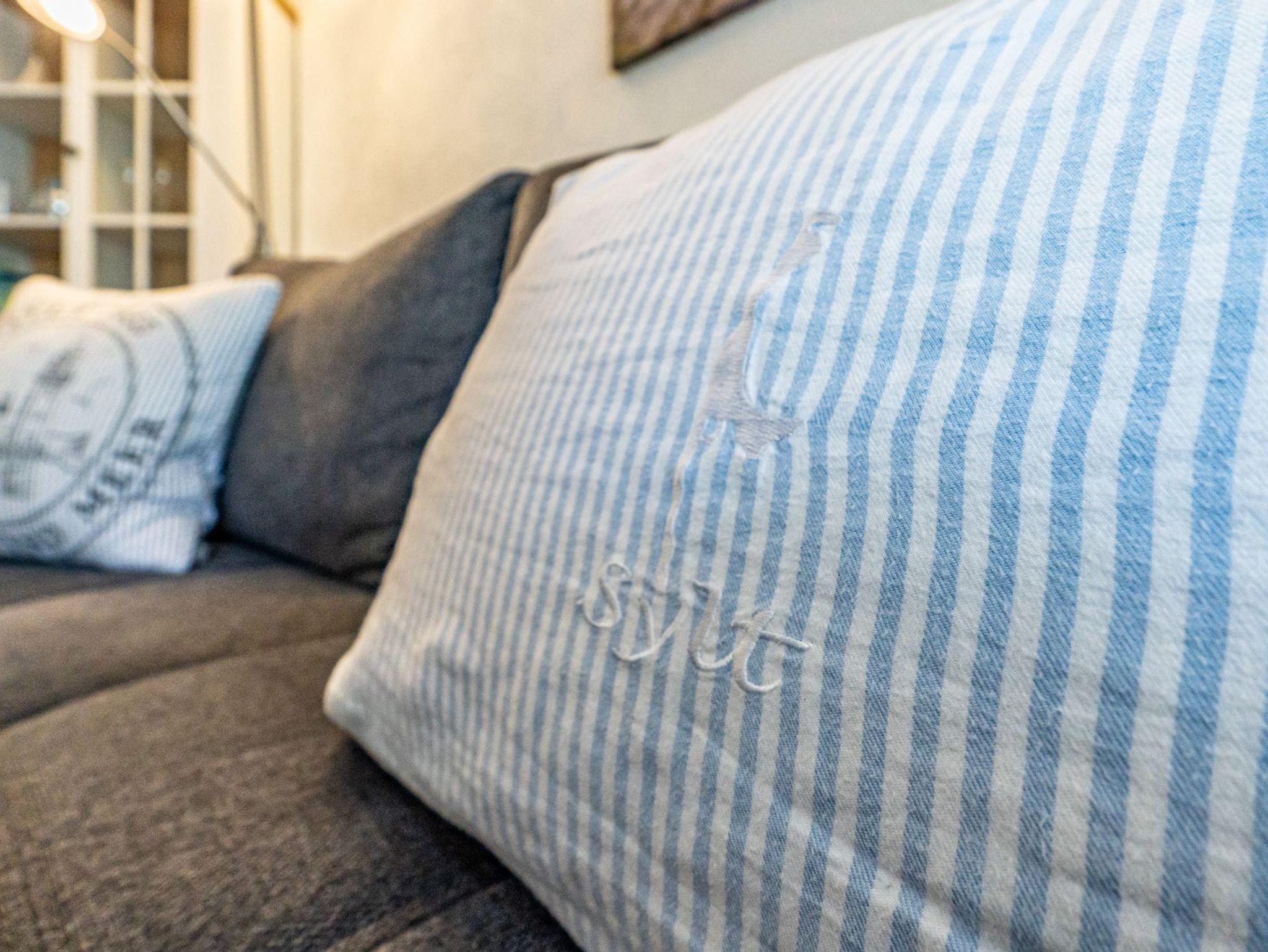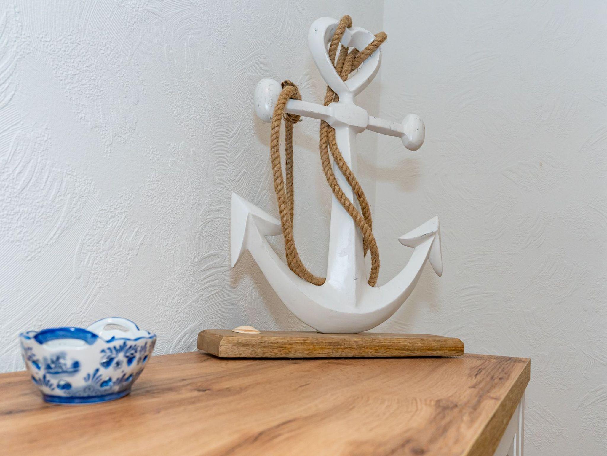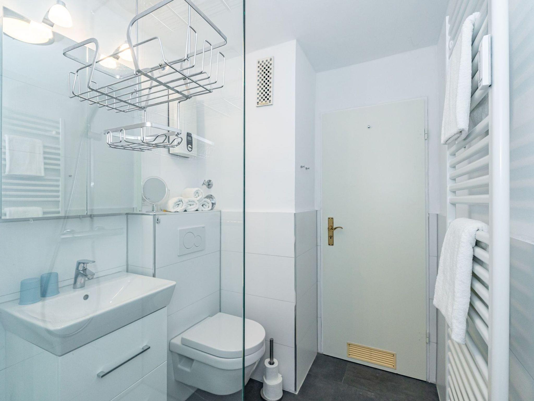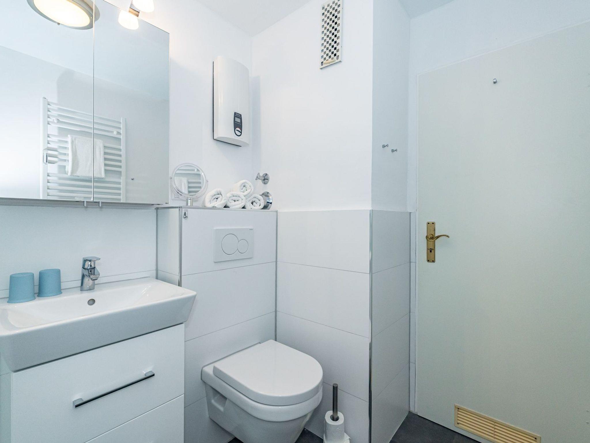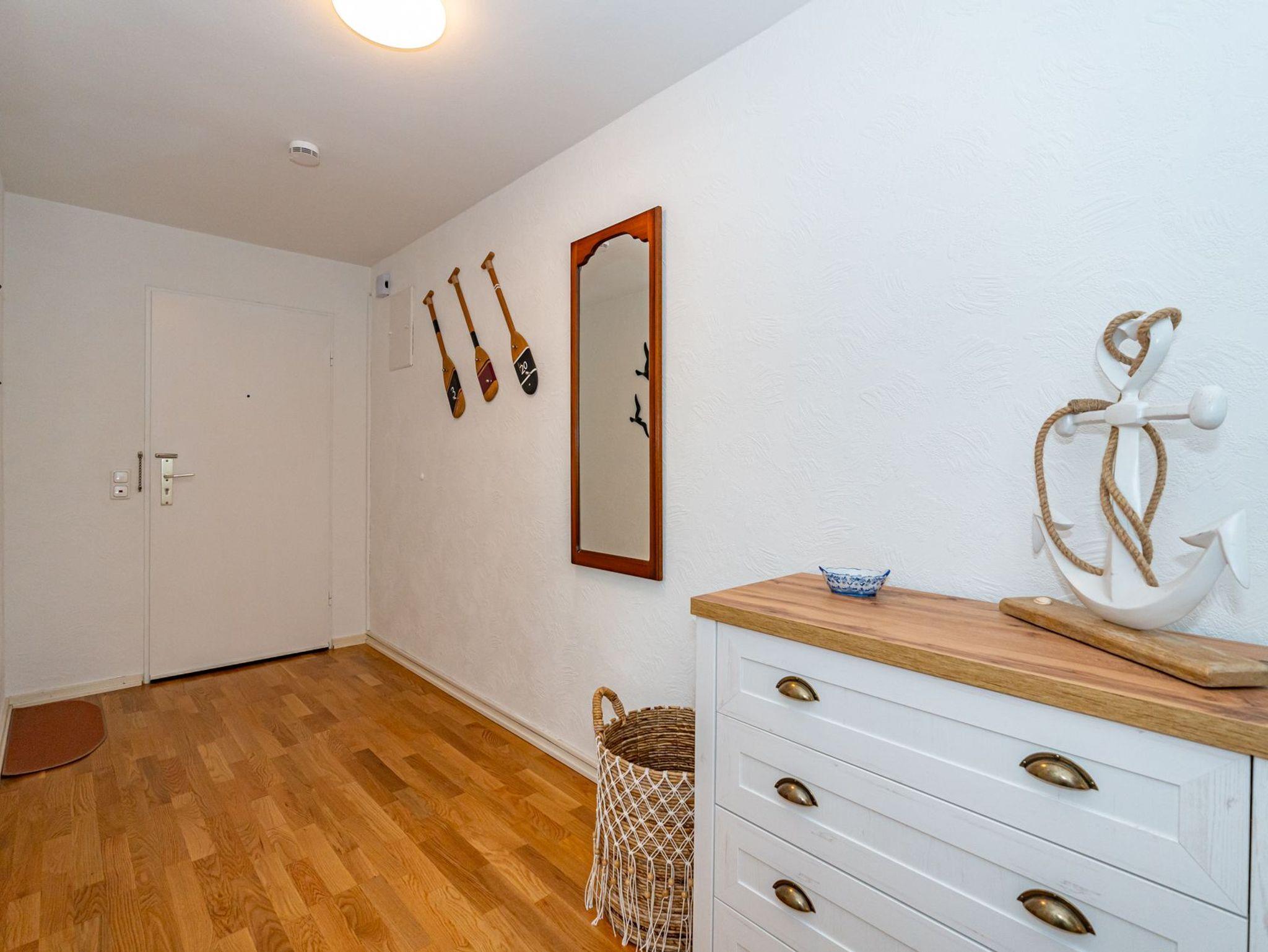 Komfortable Ferienwohnung, ca. 56 qm im Hochparterre zur Landseite mit Ostloggia (Morgensonne, mit Balkonmöbeln und Auflagen) für max. 3 Personen. Von der großzügigen Diele aus gelangt man in das Wohnzimmer, das Schlafzimmer und das neuwertige Duschbad/WC. Der Wohnraum besteht aus einer Sitzgarnitur (3-Sitzer-Schlafcouch, Liegefläche ca. 1,40 x 2,00 m, einem bequemen Ohrensessel mit Fußhocker), einem Essplatz direkt am Fenster, Kabel-TV, Stereoanlage mit Radio, WLAN und Zugang zur Ostloggia. Die Einbauküche mit Fenster ist mit Cerankochfeld (4 Felder), Geschirrspüler, Backofen, Mikrowelle, Kühlschrank mit Gefrierfach und Senseo-Kaffeemaschine ausgestattet. Eine Filterkaffeemaschine, Wasserkocher und Toaster gehören zur Grundausstattung. Das separate Schlafzimmer hat ein Doppelbett (1,80 x 2,00 m, mit guten Einzelmatratzen), 2 Nachttische und einen Kleiderschrank mit Zugang zum zweiten Balkon. Im Bad befinden sich eine großzügige Dusche mit extraflachem Einstieg, ein Waschtisch, Handtuchtrockner, Fön, Kosmetikspiegel und WC. An Extras stehen ein Bügelbrett und Bügeleisen zur Verfügung.