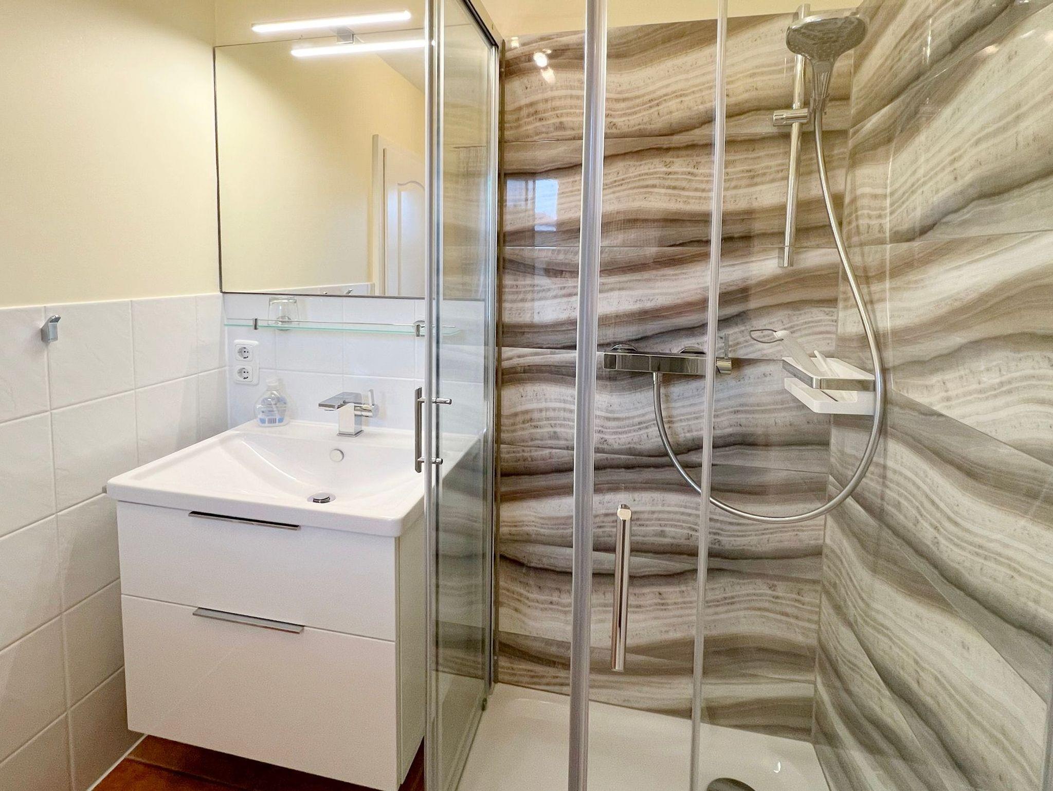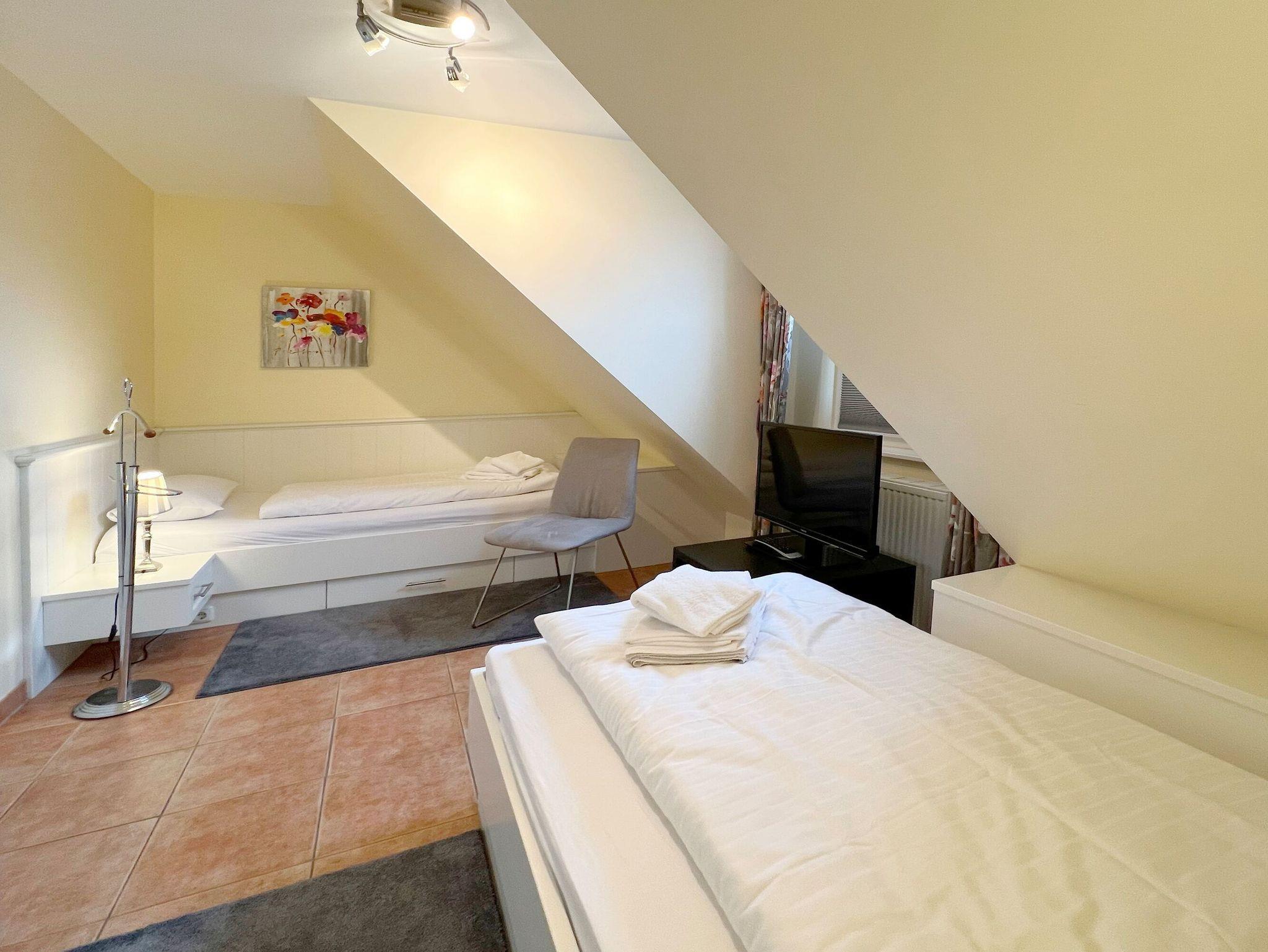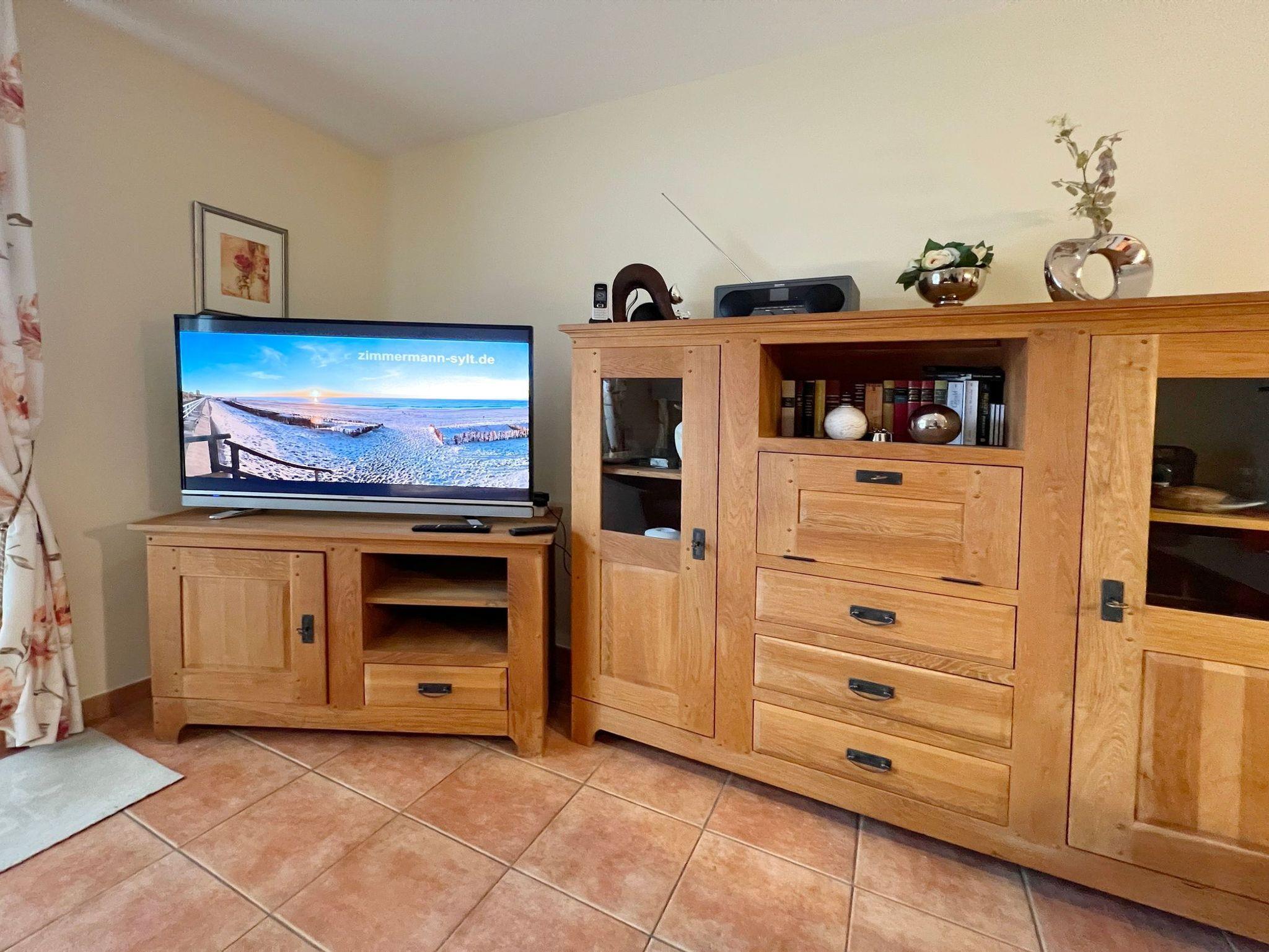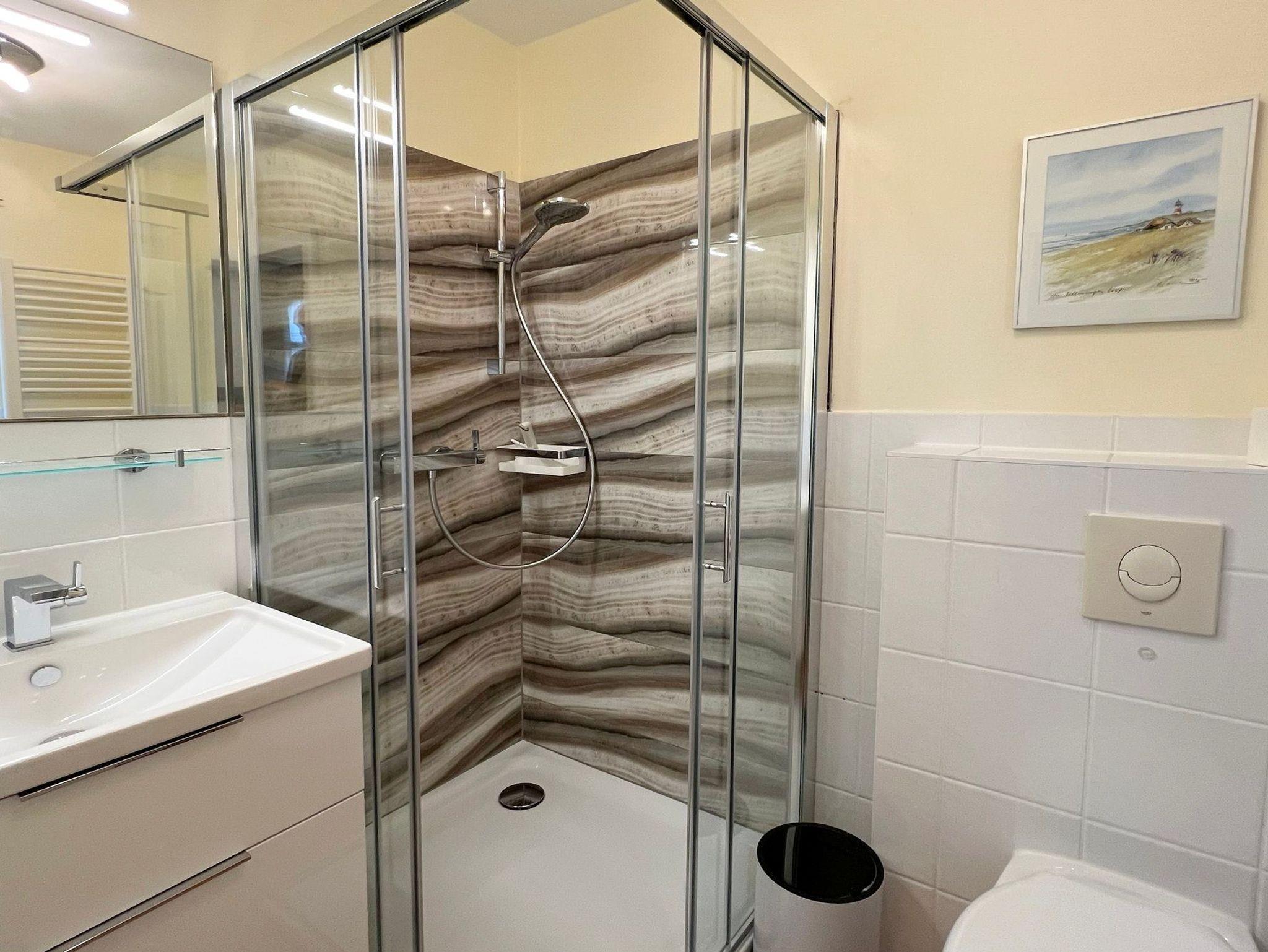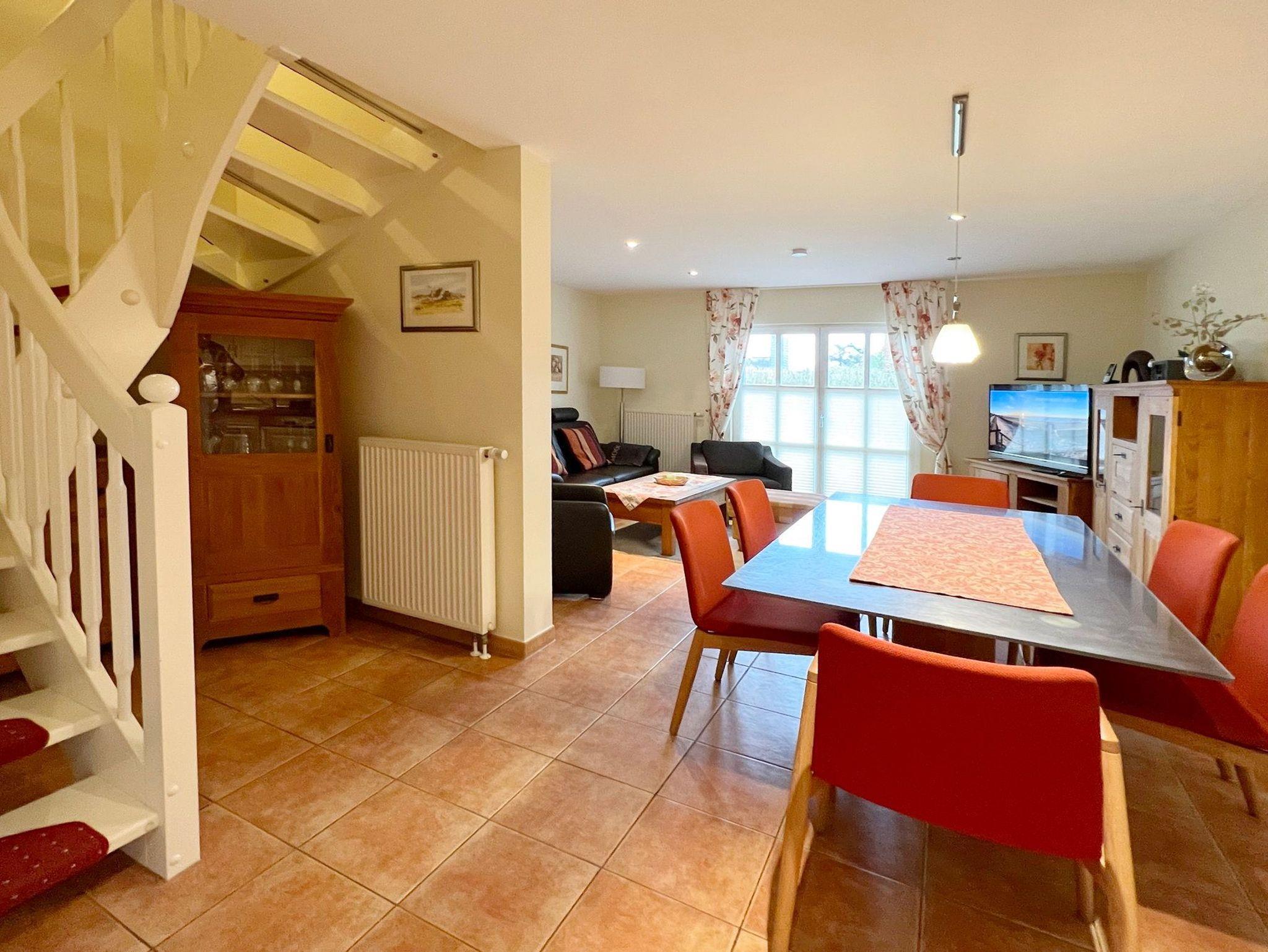 Ferienhaus (EG/OG/SB) mit Terrasse in zentraler und strandnaher Lage Westerlands, Wohnzimmer mit Sitzgruppe und Eßecke, Kaminofen, Fernseher (Smart-TV ), offene Küche mit Geschirrspüler, Backofen und Mikrowelle, 2 Duschbäder, 3 Schlafzimmer für je 2 Personen, Waschmaschine und Trockner, 1 PWK-Stellplatz.