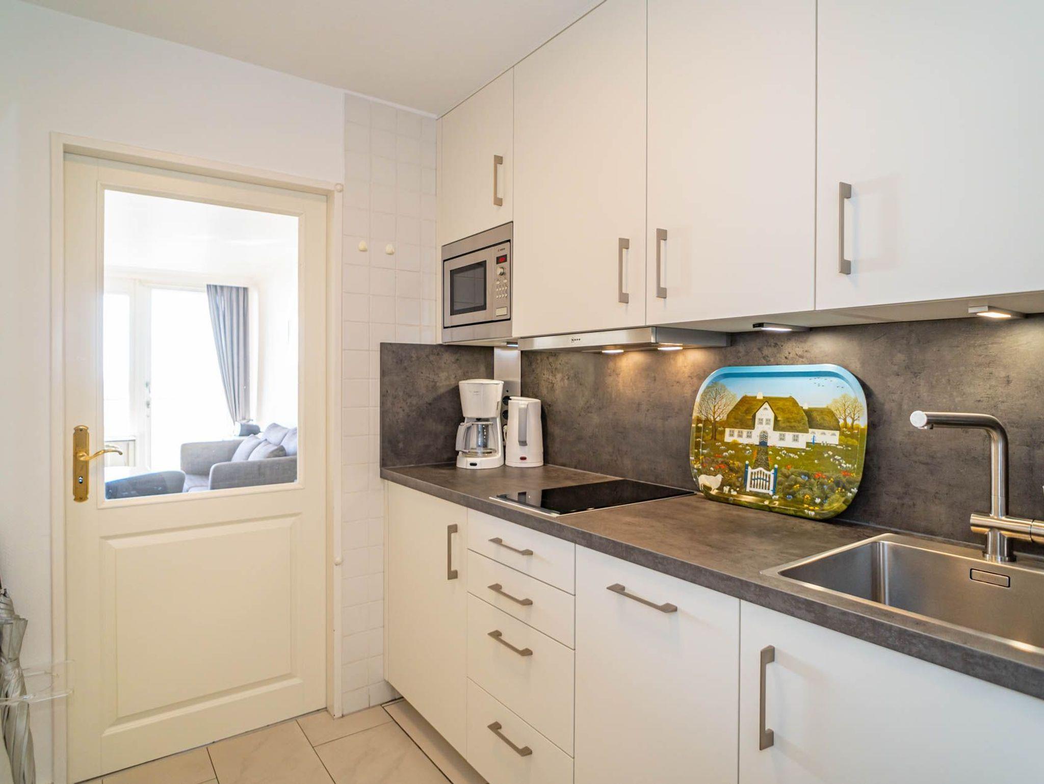 Die Küchenzeile hat einen Geschirrspüler, ein Cerankochfeld und einen Kühlschrank mit 3*-Gefrierfach.